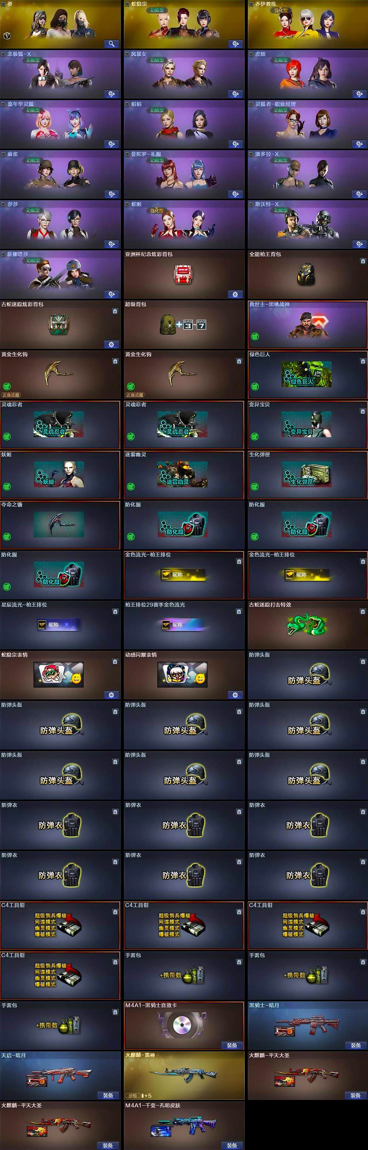 【道具】:亚洲杯纪念炫彩背包,全能枪王背包,古蛇迷踪炫彩背包,超级背包,哔哩哔哩名片,救世主-黑桃战神,黄金生化钩*2,绿色巨人,灵魂忍者*2,变异宝贝,妖姬,迷雾幽灵,生化弹匣,夺命之镰,防化服*3,金色流光-枪王排位*2,星辰流光-枪王排位,枪王排位29赛季金色流光,古蛇迷踪打击特效,蛇隐宗表情,动感闪耀表情,防弹头盔*7,防弹衣*6,C4工具钳*4,手雷包*3