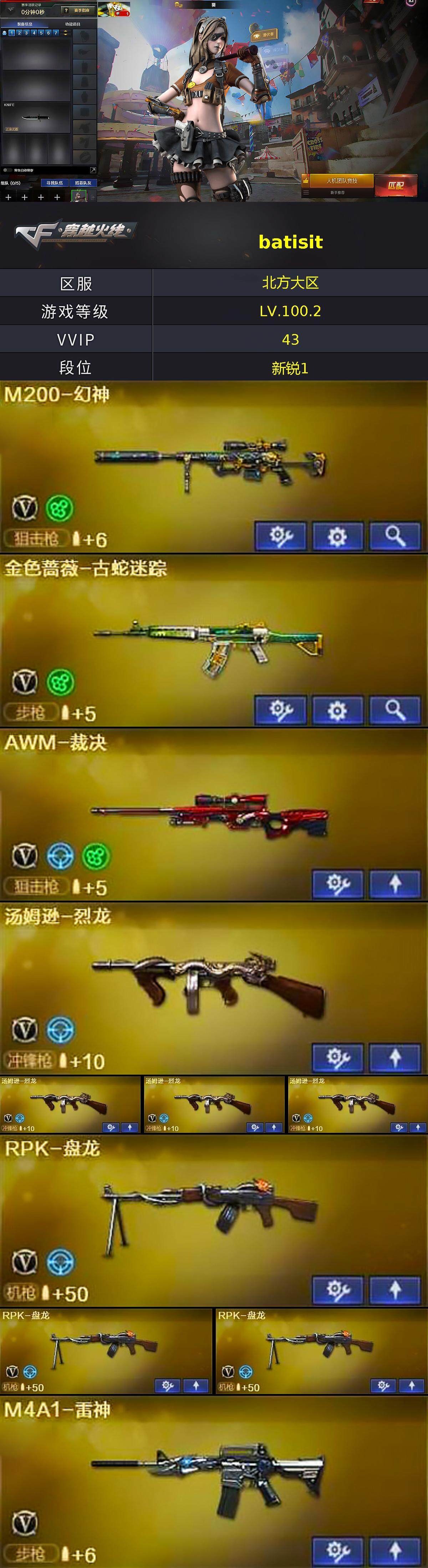 【热门武器】:HK417-朱雀,M200-幻神,金色蔷薇-古蛇迷踪,修罗-古蛇迷踪,死亡之眼,M4A1-黑骑士,汤姆逊-烈龙*4,RPK-盘龙*3,斯泰尔-蝴蝶,沙鹰-修罗*3