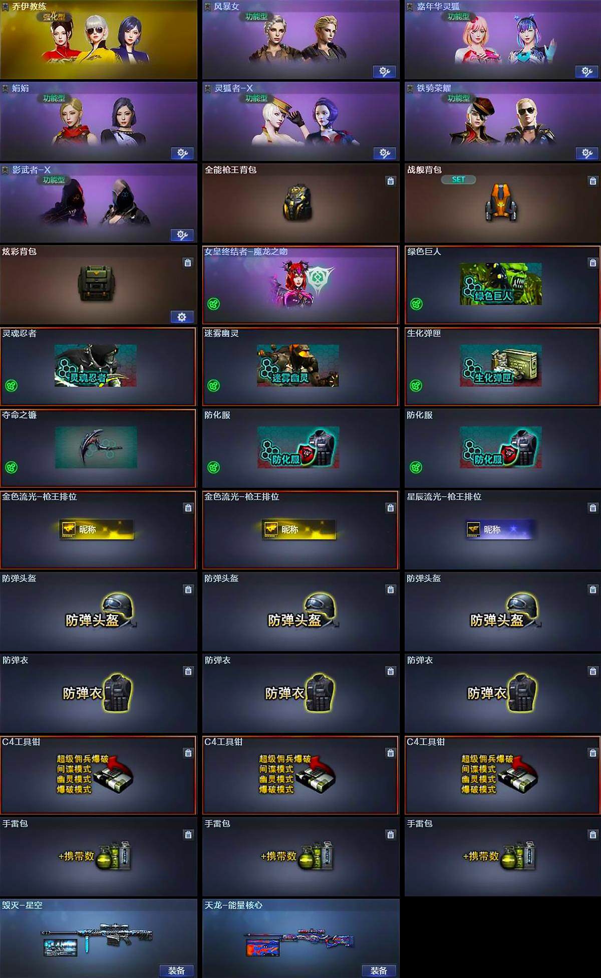 【道具】:全能枪王背包,战舰背包,炫彩背包,女皇终结者-魔龙之吻,绿色巨人,灵魂忍者,迷雾幽灵,生化弹匣,夺命之镰,防化服*2,金色流光-枪王排位*2,星辰流光-枪王排位,防弹头盔*3,防弹衣*3,C4工具钳*3,手雷包*3