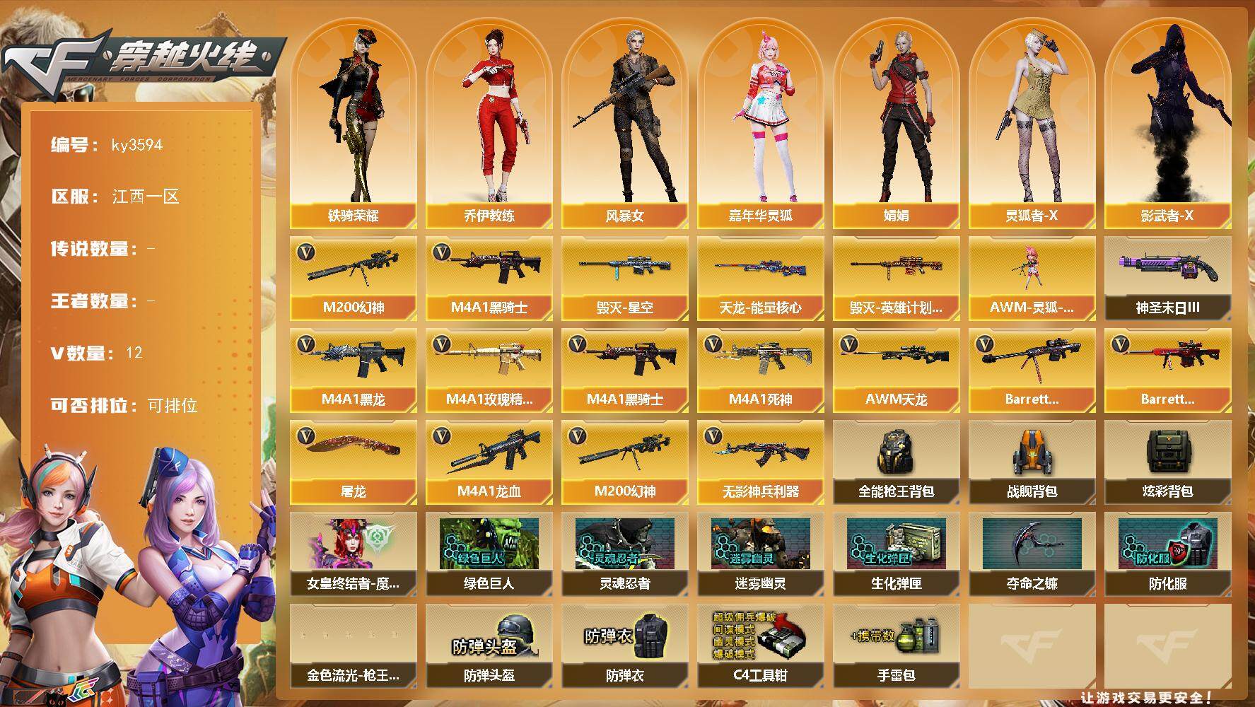 [13854881]江西一区-12V-0王者-0炫金 【热门武器】:M200-幻神,M4A1-黑骑士 【皮肤】:毁灭-星空,毁灭-英雄计划 皮肤,天龙-能量核心 【角色】:乔伊教练,风暴女,嘉年华灵狐,娟娟,灵狐者-X,铁骑荣耀,影武者-X 【人偶武器】:AWM-灵狐-15周年嘉年华 【挑战大师】:神圣爆裂者-末日III 【英雄级武器】:M4A1-黑龙,M4A1-黑骑士,M4A1-死神,M4A1-龙血,无影-神兵利器,M4A1-玫瑰精灵,AWM-天龙,Barrett-毁灭,Barrett-极光,M200-幻神,屠龙*2 【道具】:全能枪王背包,战舰背包,炫彩背包,女皇终结者-魔龙之吻,绿色巨人,灵魂忍者,迷雾幽灵,生化弹匣,夺命之镰,防化服*2,金色流光-枪王排位*2,星辰流光-枪王排位,防弹头盔*3,防弹衣*3,C4工具钳*3,手雷包*3 【特殊枪械】:1黑骑士