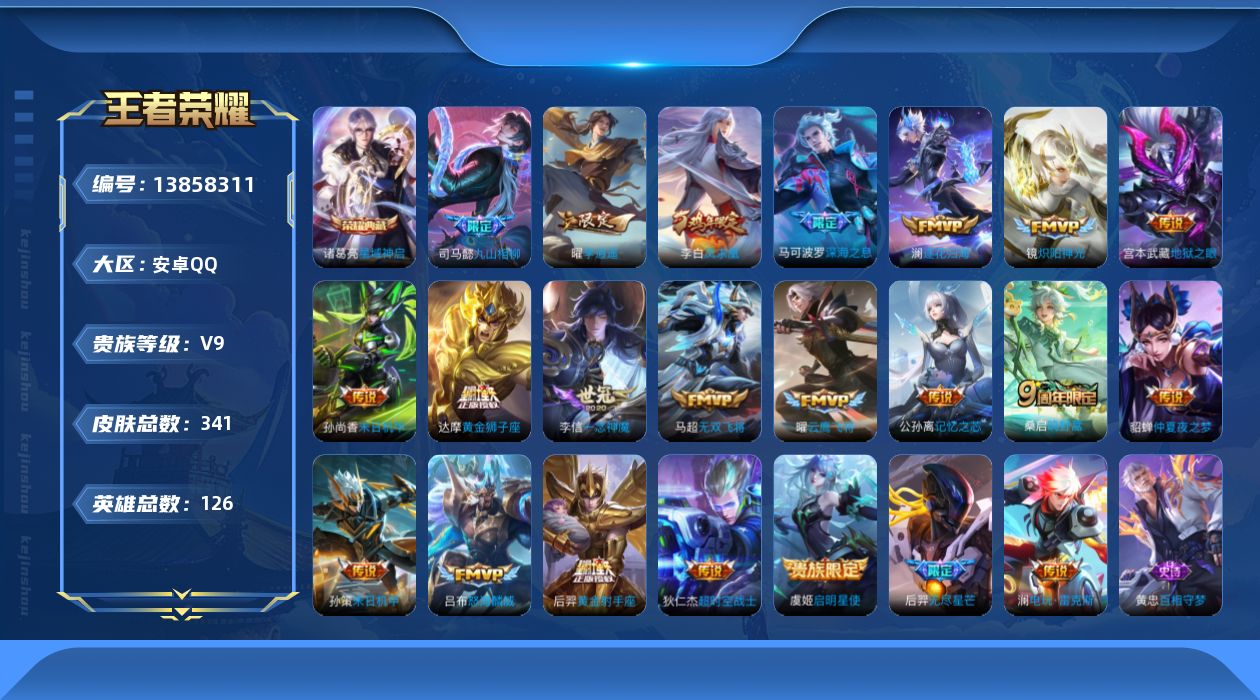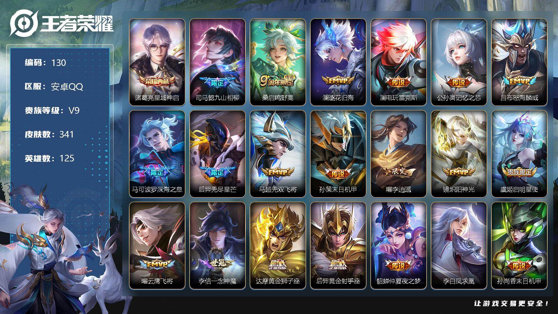 [13858311]安卓Q-V9-最强王者段位-125英雄-341皮肤-1典藏-0珍品无双-0无双-0珍品传说-22传说-89史诗