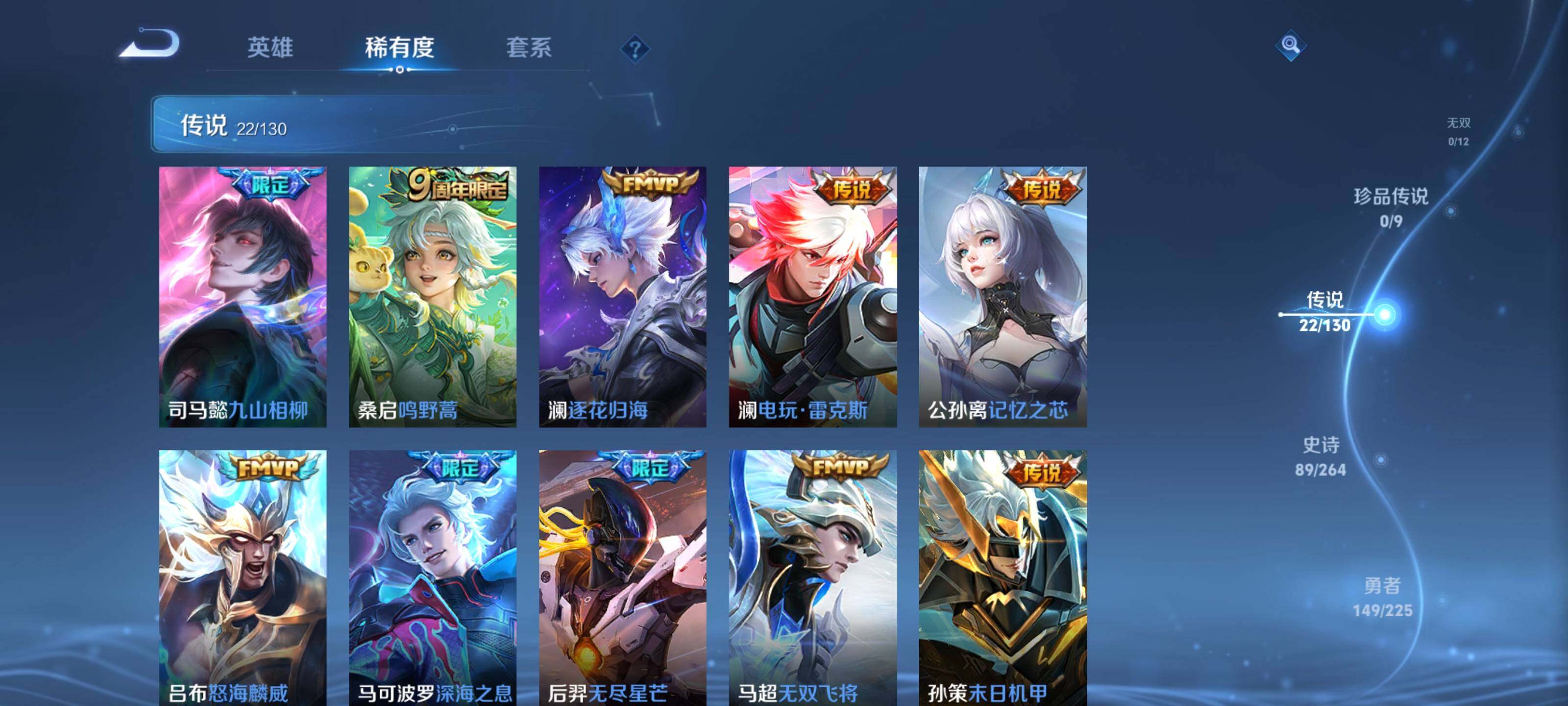 【传说皮肤】:司马懿九山相柳,桑启鸣野蒿,澜逐花归海,澜电玩雷克斯,公孙离记忆之芯,吕布怒海麟威,马可波罗深海之息,后羿无尽星芒,马超无双飞将,孙策末日机甲,曜李逍遥 ,镜炽阳神光,虞姬启明星使,曜云鹰飞将,李信一念神魔,达摩黄金狮子座,后羿黄金射手座,貂蝉仲夏夜之梦,李白凤求凰,孙尚香末日机甲,宫本武藏地狱之眼,狄仁杰超时空战士
