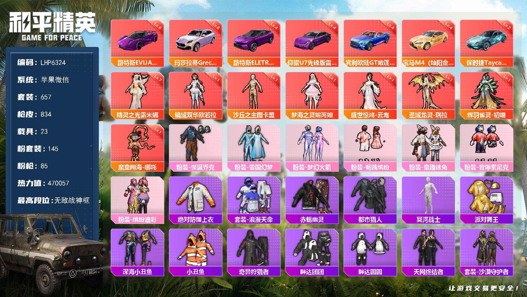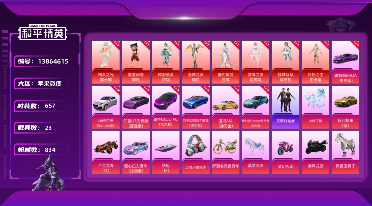 [13864615]连体王者V10-1珍品无双-4典藏-9无双-7珍品传说-104传说-175史诗 素材身法号/精灵之光-露米娜(七级)/无敌战神框2/绝世印记13/地铁满天赋/SCAR-L-时空协奏(九级)/M416-女娲灵识(九级)/GROZA-精灵之光(九级)/AKM-魔法神域(九级)/AUG-星梦奇缘(九级)/P90-仙履奇缘(九级)/,玛莎拉蒂Grecale(幻星粉)(六级)/路特斯EVIJA(电光紫)(六级)/老木乃伊 苹果 微信-无敌战神框-8神装-145粉装-85特效枪-23载具-49粉色飞行器-47w热力值-27王牌印记-657套装-834枪皮【红色载具】:路特斯ELETRE(电光紫)(四级),路特斯EVIJA(电光紫)(六级),玛莎拉蒂Grecale(幻星粉)(六级),宾利欧陆GT敞篷(深空蓝)(四级),仰望U7(雷霆紫)(四级),宝马M4(灿阳金)(四级),保时捷Taycan 旅行版(琉光青)(二级)【红色神装等级】:魔童闹海-哪吒(一级),辉羽雀灵-初翊(一级),圣域龙灵-瑞拉(一级),盛世惊鸿-云鸾(一级),精灵之光-露米娜(七级),梦海之灵-妮芮妲(一级),镜域双华-欧若拉(一级),沙丘之主-图卡盟(一级)【红色角色神装】:魔童闹海-哪吒,辉羽雀灵-初翊,圣域龙灵-瑞拉,盛世惊鸿-云鸾,精灵之光-露米娜,梦海之灵-妮芮妲,镜域双华-欧若拉,沙丘之主-图卡盟【热门品类】:粉装-怪诞乔克,粉装-雪国幻梦,粉装-梦幻火箭,粉装-畅跳缤纷,粉装-童趣迷兔,粉装-音爆索尼克,粉装-缤纷油彩,绝对防御上衣,套装-浪漫天命,套装-赤蝎幽灵,套装-都市猎人,套装-冥河战士,套装-派对舞王,套装-深海小丑鱼,套装-小丑鱼,套装-奇异狩猎者,套装-胖达团团,套装-胖达圆圆,套装-天网终结者,套装-沙漠守护者,套装-暗夜行者,套装-动感兔斯基人偶服,角色-2B战斗服款,角色-忠猛周仓,角色-忠义严颜,套装-六号树人,套装-龟仙人,套装-潮萌小黄鸭,套装-暗影哥特,套装-浪漫波比,套装-粉红小猪,套装-萌熊伴侣,套装-红红火火,套装-糯粉咩咩,小丑红鼻头,大砍刀-青龙偃月刀,撬棍-龙胆亮银枪,套装-红熊茄茄【粉色载具】:路特斯EVIJA(电光紫),路特斯ELETRE(电光紫),玛莎拉蒂Ghibli(金),玛莎拉蒂Grecale(幻星粉),宾利欧陆GT敞篷(深空蓝),