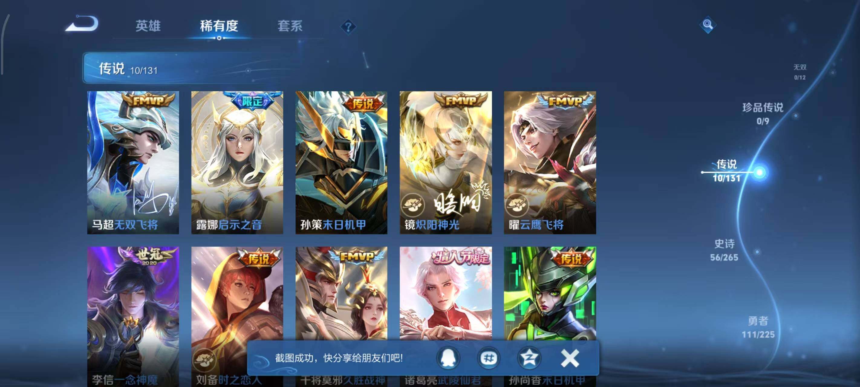 【传说皮肤】:马超无双飞将,露娜启示之音,孙策末日机甲,镜炽阳神光,曜云鹰飞将,李信一念神魔,刘备时之恋人,干将莫邪久胜战神,诸葛亮武陵仙君,孙尚香末日机甲