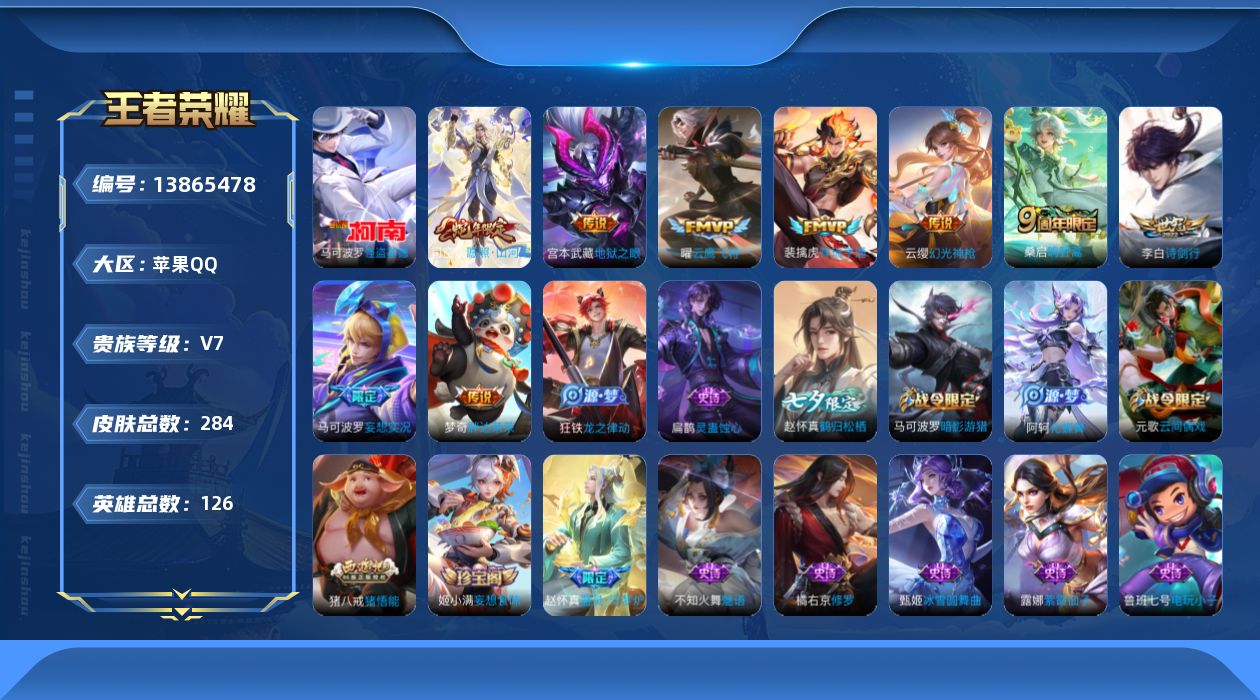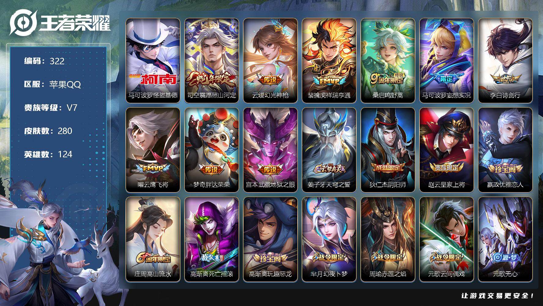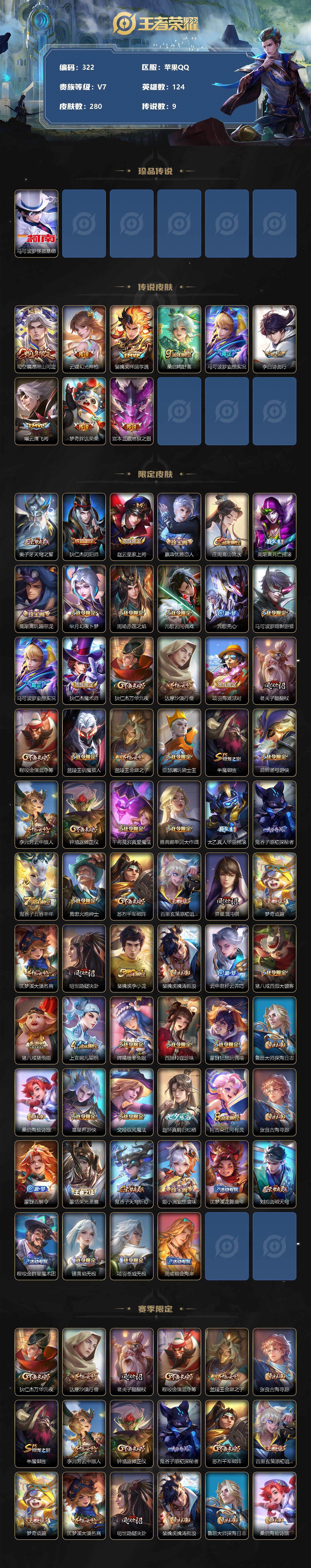 [13865478]苹果Q-V7-至尊星耀III段位-124英雄-280皮肤-0典藏-0珍品无双-0无双-1珍品传说-9传说-69史诗