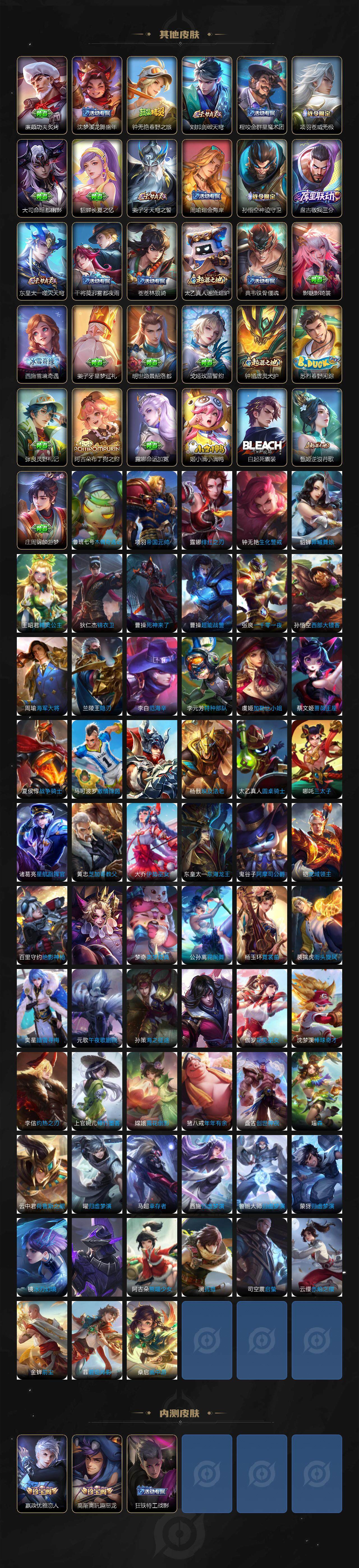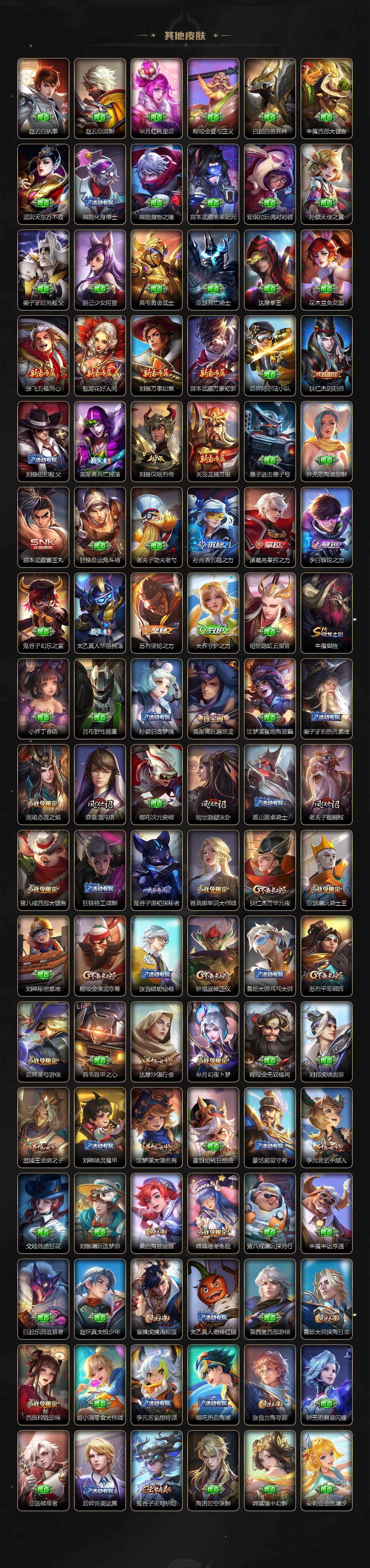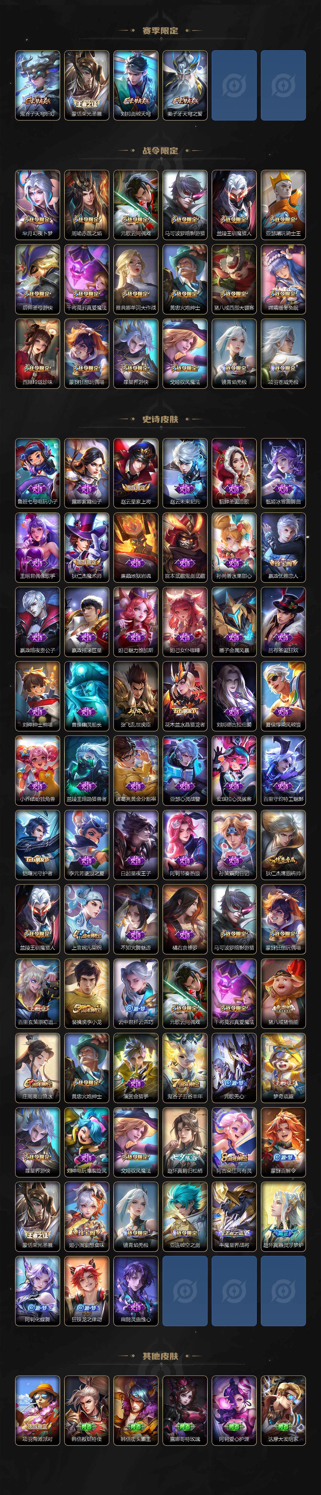 【限定皮肤】:姜子牙天穹之誓,狄仁杰阴阳师,赵云皇家上将,嬴政优雅恋人,庄周高山流水,高渐离死亡摇滚,高渐离玩趣恶龙,芈月幻夜卜梦,周瑜赤莲之焰,元歌云间偶戏,元歌无心,马可波罗暗影游猎,马可波罗妄想实况,狄仁杰魔术师,狄仁杰万华元夜,达摩沙漠行僧,项羽海滩派对,老夫子醍醐杖,程咬金演武夺筹,兰陵王驯魔猎人,兰陵王金庭之子,亚瑟潮玩骑士王,牛魔御旌,后羿圣弓游侠,李元芳云中旅人,钟馗驱傩正仪,干将莫邪真爱魔法,雅典娜单词大作战,太乙真人华丽摇滚,鬼谷子原初探秘者,鬼谷子五谷丰年,黄忠火炮绅士,苏烈千军破阵,百里玄策原初追逐者,弈星混沌棋,梦奇顽趣,沈梦溪大漠名商,明世隐疑决卦,裴擒虎李小龙,裴擒虎擒涛扼浪,云中君纤云弄巧,猪八戒西部大镖客,猪八戒猪悟能,上官婉儿梁祝,嫦娥暖冬兔眠,西施玲珑珍味,蒙犽狂想玩偶喵,鲁班大师探海日志,桑启海盐诗旅,暃星界游侠,戈娅驭风魔法,赵怀真鹤归松栖,阿古朵江河有灵,张良古海寻踪,蒙犽百解令,蒙恬荣光圣徽,鬼谷子天穹祈灯,姬小满妄想食味,沈梦溪龙舞盛年,刘邦剑破天穹,程咬金群星魔术团,镜青焰无极,项羽苍威无极,周瑜熔金海岸