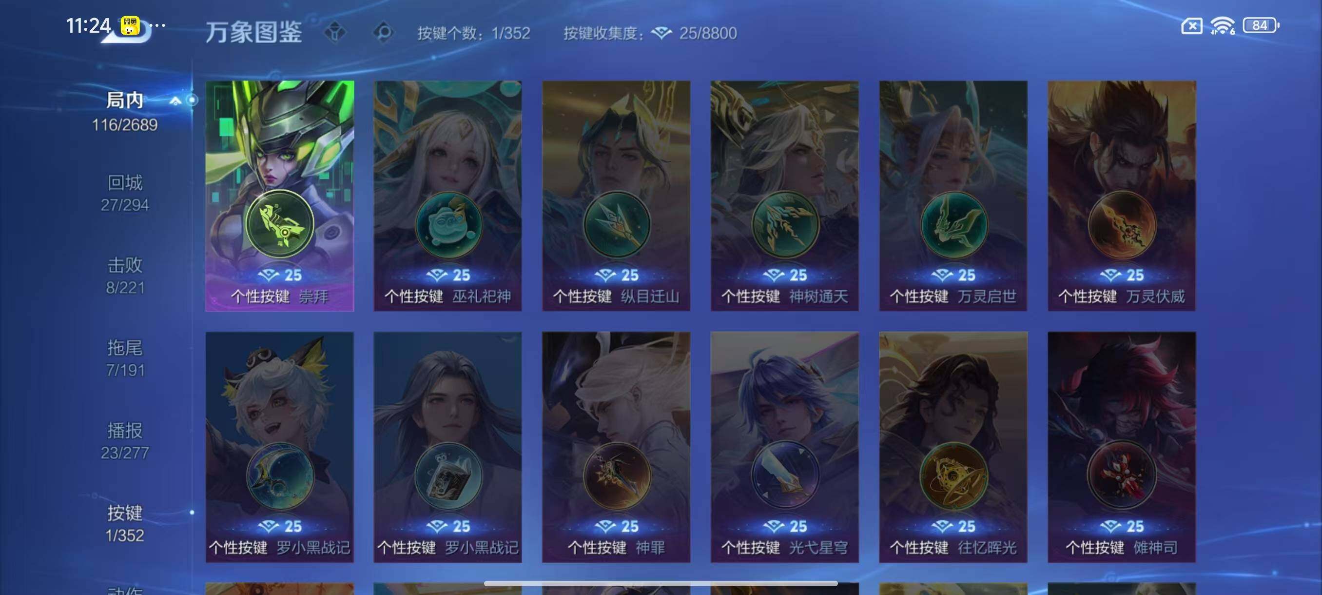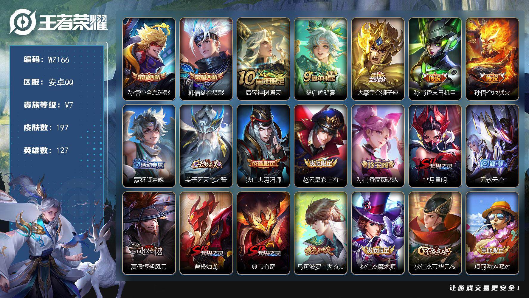 - [12090353]V7 1典藏 1珍品传说 6传说 124英雄 250皮肤 可修改实名 女号 优质装备:神鉴启示录,江户川柯南,淬星耀世 传说皮:乘龙·淬吴钩(孙策年限),幻光神枪 珍宝阁皮:万物之道,蔷薇恋人,玩趣恶龙 限定皮:愿照·福禄聚(蔡文姬年限),逐霄战戟,鸣野蒿,夏侯惇霜北刀,魔法小厨娘,高山流水,五谷丰年,游园惊梦,匿光追影者 史诗皮:化蝶舞,星界战将,龙之律动,石田雨龙,破空之剑,蒙犽顽岩魄,芈月浮光幕影,琥珀纪元伽罗,蔬乡物语(鲁班七号),百相守梦-百里守约,百相守梦-黄忠,紫霞仙子,苍穹之光,特工魅影,江河有灵,雪夜绮愿(周瑜),百解令(蒙犽),蒙恬荣光圣徽,无限星赏官,冰冠公主,偶像歌手,电玩·爆裂旋风,龙骑士(小龙虾),末日机甲-吕布,猫狗日记-孙策,猫狗日记-大乔,时之恋人-孙尚香,乱世虎臣,节奏热浪,修罗,女仆咖啡,摇滚巨星,水果甜心,绅士熊喵,天才门将,星夜王子,心灵骇客,功夫厨神,德古拉伯爵,暗隐猎兽者,幽灵船长,鬼剑武藏,心灵战警,天秀·启明,舞动绿茵,地狱岩魂,拒霜思,缤纷独角兽,乘风破浪,逐浪之夏,水晶猎龙者,曙光守护者,箭羽风息,金属风暴,原初追逐者,圣诞狂欢,圣诞恋歌,鹰眼统帅,暗夜贵公子,魅力维加斯,黎明之约,无心