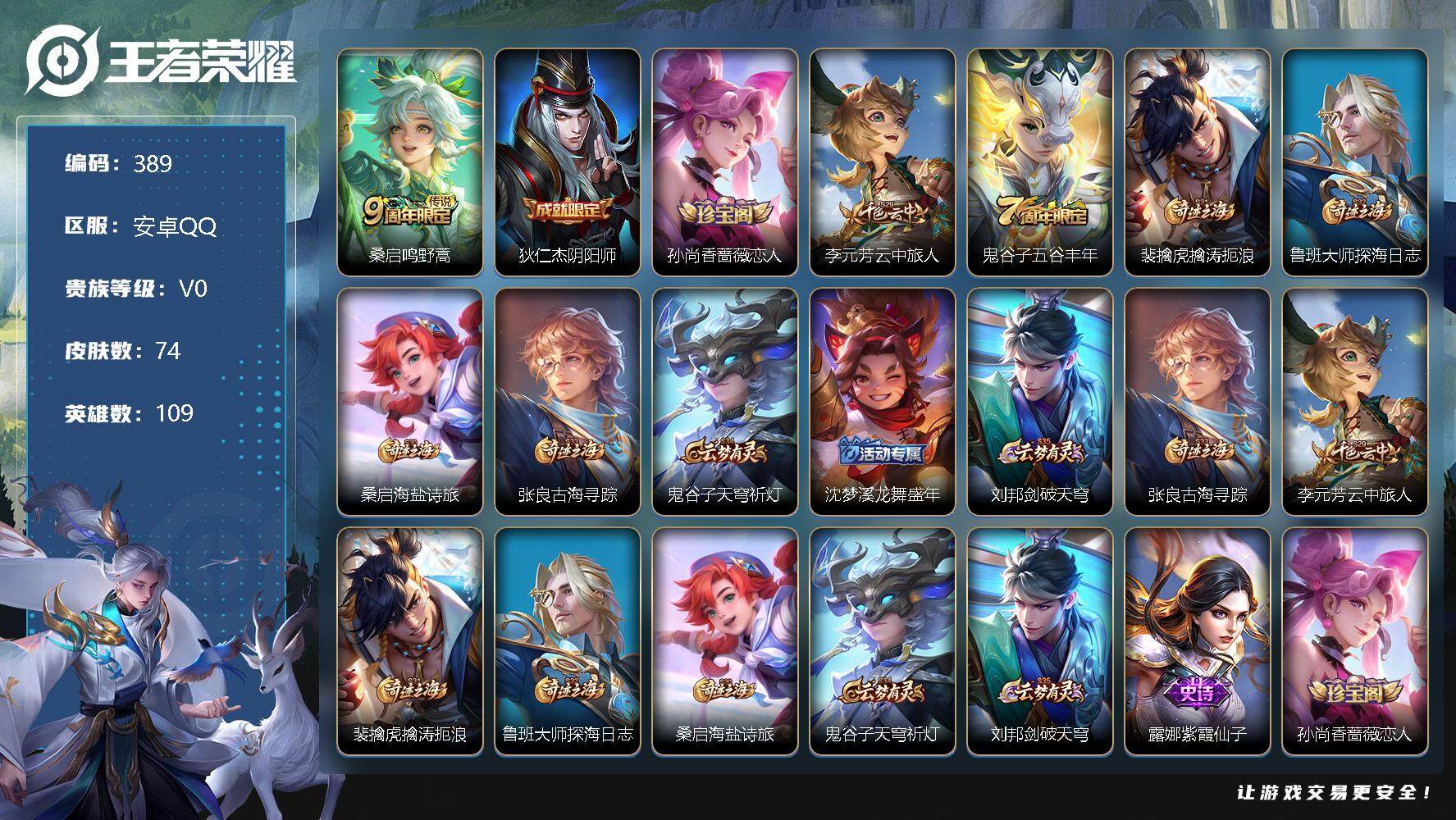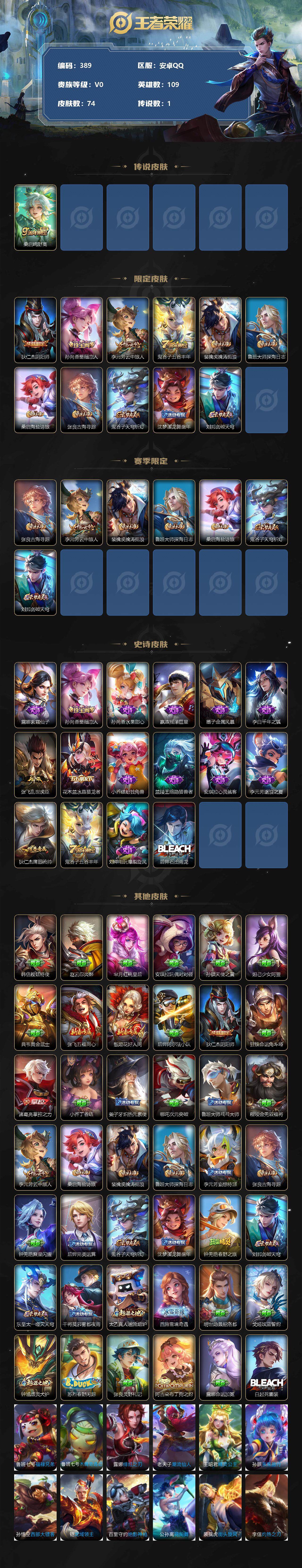 [13865521]安卓Q-V0-尊贵铂金II段位-109英雄-74皮肤-0典藏-0珍品无双-0无双-0珍品传说-1传说-16史诗
