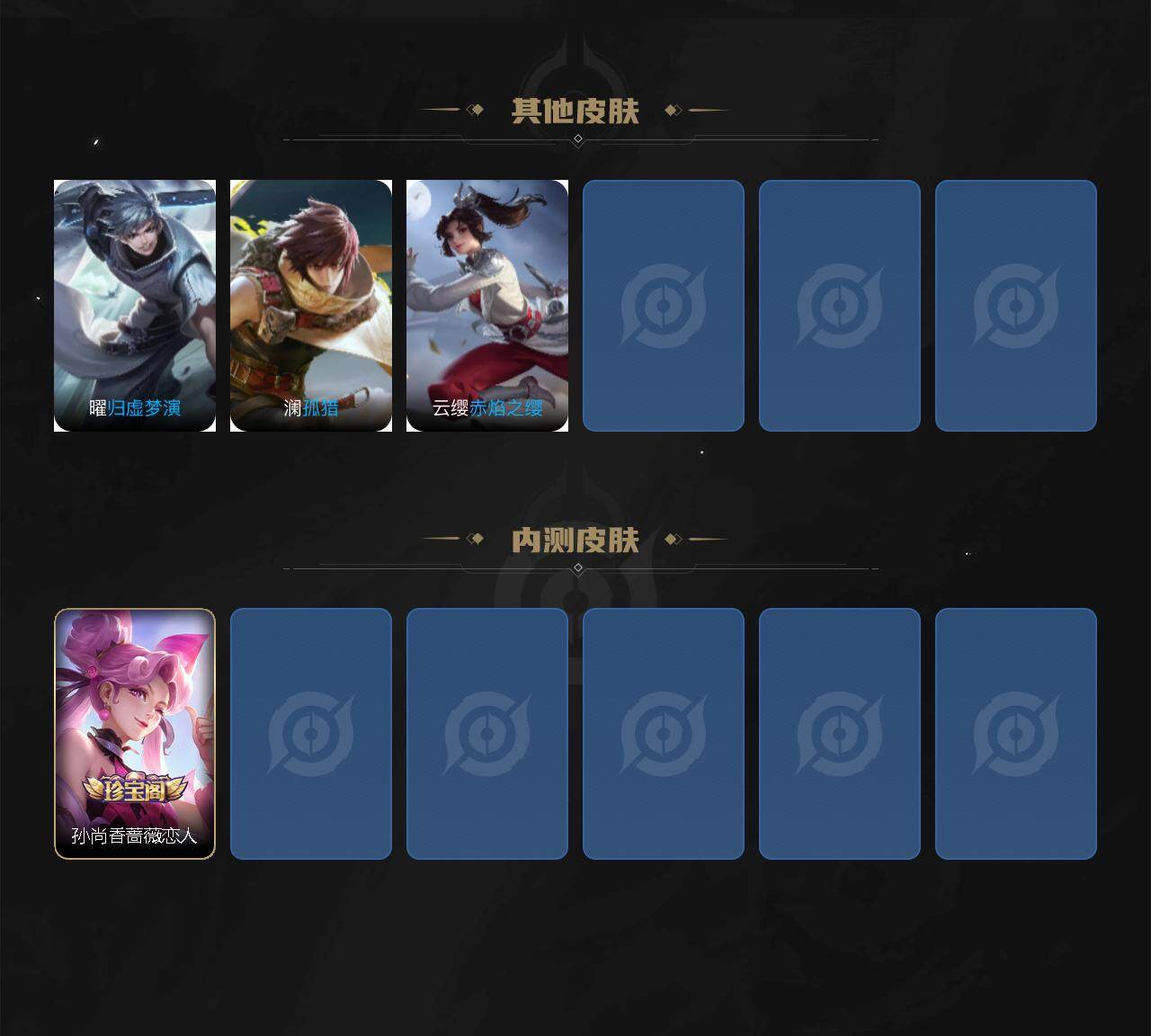 【其他皮肤】:韩信教廷特使,赵云忍炎影,芈月红桃皇后,安琪拉玩偶对对碰,孙膑天使之翼,妲己少女阿狸,典韦黄金武士,张飞五福同心,甄姬花好人间,后羿阿尔法小队,狄仁杰阴阳师,狂铁命运角斗场,诸葛亮掌控之力,小乔丁香结,姜子牙炽热元素使,哪吒次元突破,鲁班大师乓乓大师,程咬金无双福将,李元芳云中旅人,桑启海盐诗旅,裴擒虎擒涛扼浪,鲁班大师探海日志,李元芳妄想特派,张良古海寻踪,钟无艳聚星闪耀,后羿完美运算,鬼谷子天穹祈灯,沈梦溪龙舞盛年,钟无艳春野之旅,刘邦剑破天穹,东皇太一噬灭天穹,干将莫邪雾都夜雨,太乙真人谧流熔炉,西施雪境奇遇,明世隐景韶洛都,戈娅玫蓝誓约,钟馗虚灵犬护,苏烈春野闲踪,张良灵野札记,阿古朵布丁狗之约,露娜命运加冕,白起死霸装,鲁班七号福禄兄弟,鲁班七号木偶奇遇记,露娜绯红之刃,老夫子潮流仙人,王昭君精灵公主,孙膑未来旅行,孙悟空西部大镖客,铠龙域领主,百里守约绝影神枪,公孙离花间舞,裴擒虎街头旋风,李信灼热之刃,曜归虚梦演,澜孤猎,云缨赤焰之缨