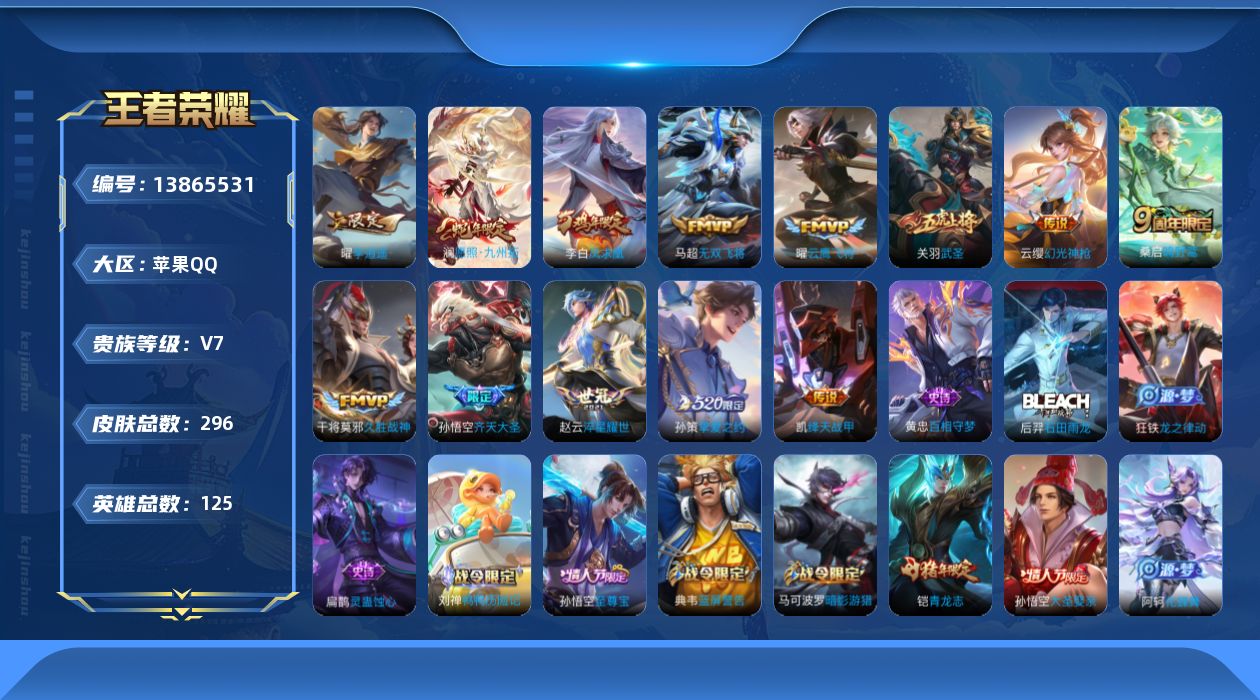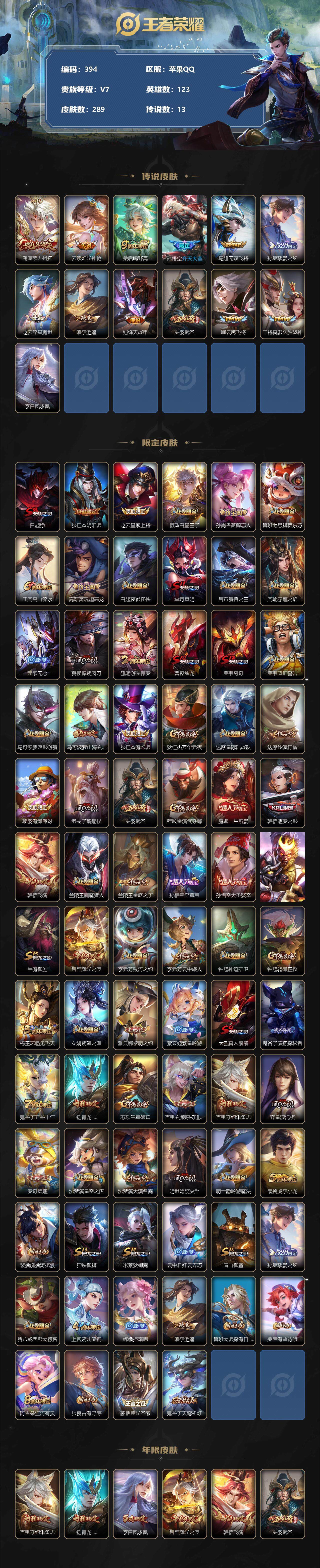 [13865531]苹果Q-V7-最强王者段位-123英雄-289皮肤-0典藏-0珍品无双-0无双-0珍品传说-13传说-80史诗