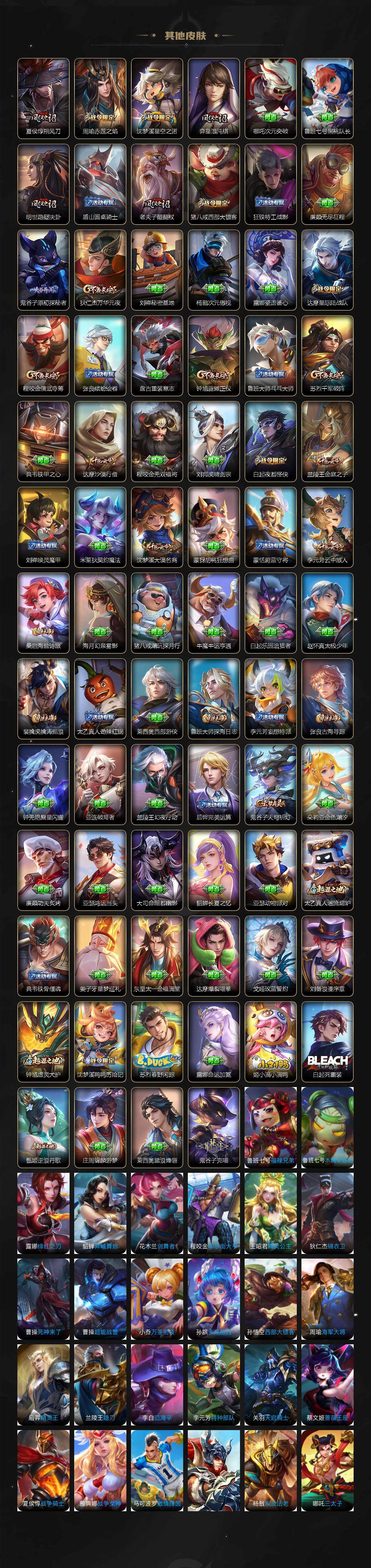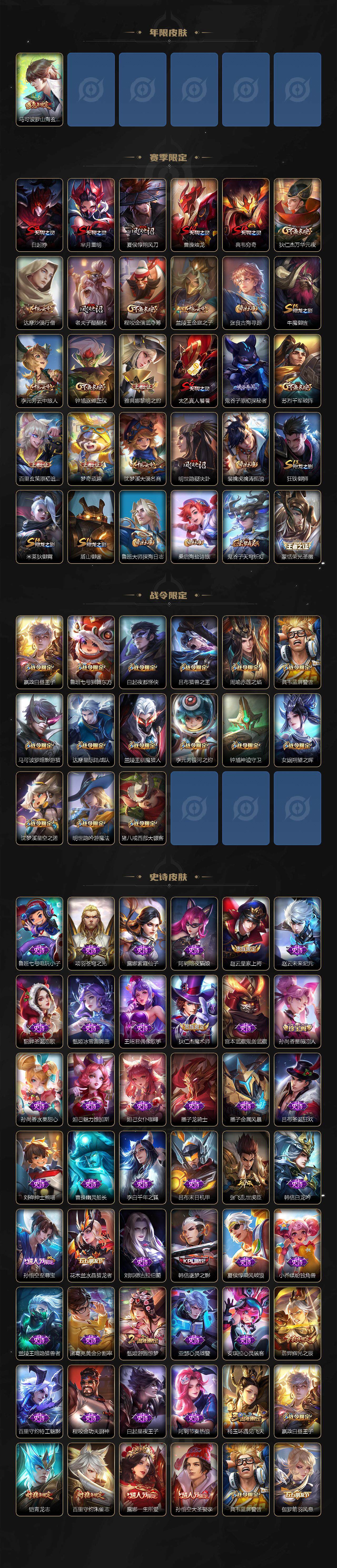 【赛季限定】:白起狰,芈月重明,夏侯惇朔风刀,曹操烛龙,典韦穷奇,狄仁杰万华元夜,达摩沙漠行僧,老夫子醍醐杖,程咬金演武夺筹,兰陵王金庭之子,张良古海寻踪,牛魔御旌,李元芳云中旅人,钟馗驱傩正仪,雅典娜黎明之约,太乙真人饕餮,鬼谷子原初探秘者,苏烈千军破阵,百里玄策原初追逐者,弈星混沌棋,梦奇顽趣,沈梦溪大漠名商,明世隐疑决卦,裴擒虎擒涛扼浪,狂铁御狮,米莱狄御霄,盾山御銮,鲁班大师探海日志,桑启海盐诗旅,鬼谷子天穹祈灯,蒙恬荣光圣徽