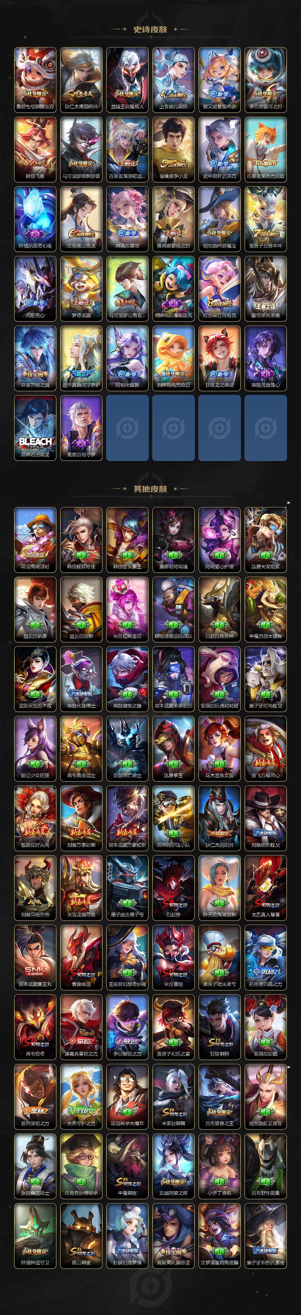 【限定皮肤】:白起狰,狄仁杰阴阳师,赵云皇家上将,嬴政白昼王子,孙尚香蔷薇恋人,鲁班七号狮舞东方,庄周高山流水,高渐离玩趣恶龙,白起夜都怪侠,芈月重明,吕布猎兽之王,周瑜赤莲之焰,元歌无心,夏侯惇朔风刀,甄姬游园惊梦,曹操烛龙,典韦穷奇,典韦蓝屏警告,马可波罗暗影游猎,马可波罗山海玄木吟,狄仁杰魔术师,狄仁杰万华元夜,达摩星际陆战队,达摩沙漠行僧,项羽海滩派对,老夫子醍醐杖,关羽武圣,程咬金演武夺筹,露娜一生所爱,韩信逐梦之影,韩信飞衡,兰陵王驯魔猎人,兰陵王金庭之子,孙悟空至尊宝,孙悟空大圣娶亲,孙悟空齐天大圣,牛魔御旌,后羿辉光之辰,李元芳银河之约,李元芳云中旅人,钟馗神迹守卫,钟馗驱傩正仪,杨玉环遇见飞天,女娲朔望之晖,雅典娜黎明之约,蔡文姬繁星吟游,太乙真人饕餮,鬼谷子原初探秘者,鬼谷子五谷丰年,铠青龙志,苏烈千军破阵,百里玄策原初追逐者,百里守约朱雀志,弈星混沌棋,梦奇顽趣,沈梦溪星空之诺,沈梦溪大漠名商,明世隐疑决卦,明世隐吟游魔法,裴擒虎李小龙,裴擒虎擒涛扼浪,狂铁御狮,米莱狄御霄,云中君纤云弄巧,盾山御銮,孙策挚爱之约,猪八戒西部大镖客,上官婉儿梁祝,嫦娥拒霜思,曜李逍遥 ,鲁班大师探海日志,桑启海盐诗旅,阿古朵江河有灵,张良古海寻踪,蒙恬荣光圣徽,鬼谷子天穹祈灯