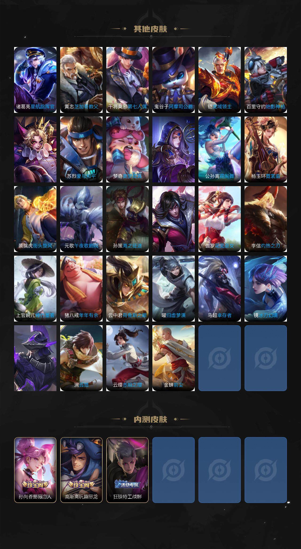 白起狰,太乙真人饕餮,曹操烛龙,芈月重明,典韦穷奇,狂铁御狮,米莱狄御霄,牛魔御旌,盾山御銮,夏侯惇朔风刀,明世隐疑决卦,老夫子醍醐杖,鬼谷子原初探秘者,狄仁杰万华元夜,程咬金演武夺筹,钟馗驱傩正仪,苏烈千军破阵,吕布猎兽之王,嬴政白昼王子,女娲朔望之晖,典韦蓝屏警告,钟馗神迹守卫,鲁班七号狮舞东方,沈梦溪星空之诺,李元芳银河之约,马可波罗暗影游猎,弈星混沌棋,达摩沙漠行僧,兰陵王金庭之子,沈梦溪大漠名商,李元芳云中旅人,桑启海盐诗旅,裴擒虎擒涛扼浪,鲁班大师探海日志,张良古海寻踪