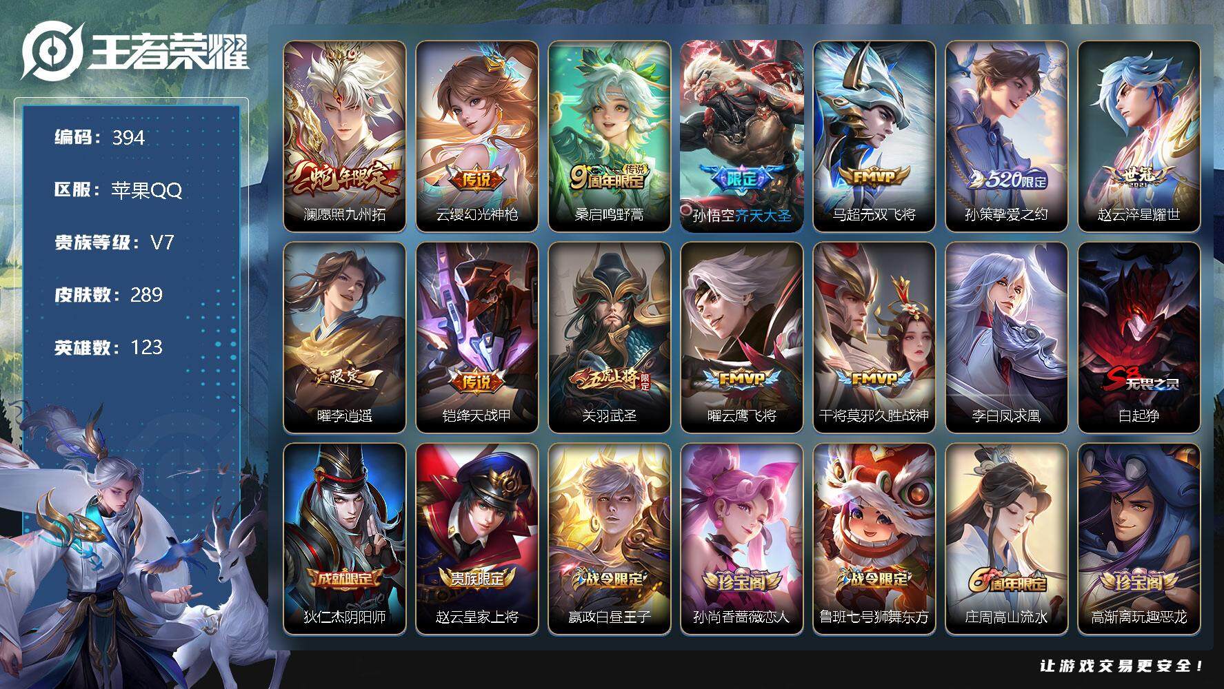 [13865531]苹果Q-V7-最强王者段位-123英雄-289皮肤-0典藏-0珍品无双-0无双-0珍品传说-13传说-80史诗 【传说皮肤】:澜愿照九州拓,云缨幻光神枪,桑启鸣野蒿,孙悟空齐天大圣,马超无双飞将,孙策挚爱之约,赵云淬星耀世,曜李逍遥 ,铠绛天战甲,关羽武圣,曜云鹰飞将,干将莫邪久胜战神,李白凤求凰 【限定皮肤】:白起狰,狄仁杰阴阳师,赵云皇家上将,嬴政白昼王子,孙尚香蔷薇恋人,鲁班七号狮舞东方,庄周高山流水,高渐离玩趣恶龙,白起夜都怪侠,芈月重明,吕布猎兽之王,周瑜赤莲之焰,元歌无心,夏侯惇朔风刀,甄姬游园惊梦,曹操烛龙,典韦穷奇,典韦蓝屏警告,马可波罗暗影游猎,马可波罗山海玄木吟,狄仁杰魔术师,狄仁杰万华元夜,达摩星际陆战队,达摩沙漠行僧,项羽海滩派对,老夫子醍醐杖,关羽武圣,程咬金演武夺筹,露娜一生所爱,韩信逐梦之影,韩信飞衡,兰陵王驯魔猎人,兰陵王金庭之子,孙悟空至尊宝,孙悟空大圣娶亲,孙悟空齐天大圣,牛魔御旌,后羿辉光之辰,李元芳银河之约,李元芳云中旅人,钟馗神迹守卫,钟馗驱傩正仪,杨玉环遇见飞天,女娲朔望之晖,雅典娜黎明之约,蔡文姬繁星吟游,太乙真人饕餮,鬼谷子原初探秘者,鬼谷子五谷丰年,铠青龙志,苏烈千军破阵,百里玄策原初追逐者,百里守约朱雀志,弈星混沌棋,梦奇顽趣,沈梦溪星空之诺,沈梦溪大漠名商,明世隐疑决卦,明世隐吟游魔法,裴擒虎李小龙,裴擒虎擒涛扼浪,狂铁御狮,米莱狄御霄,云中君纤云弄巧,盾山御銮,孙策挚爱之约,猪八戒西部大镖客,上官婉儿梁祝,嫦娥拒霜思,曜李逍遥 ,鲁班大师探海日志,桑启海盐诗旅,阿古朵江河有灵,张良古海寻踪,蒙恬荣光圣徽,鬼谷子天穹祈灯 【年限皮肤】:百里守约朱雀志,铠青龙志,李白凤求凰,后羿辉光之辰,韩信飞衡,关羽武圣,马可波罗山海玄木吟 【赛季限定】:白起狰,芈月重明,夏侯惇朔风刀,曹操烛龙,典韦穷奇,狄仁杰万华元夜,达摩沙漠行僧,老夫子醍醐杖,程咬金演武夺筹,兰陵王金庭之子,张良古海寻踪,牛魔御旌,李元芳云中旅人,钟馗驱傩正仪,雅典娜黎明之约,太乙真人饕餮,鬼谷子原初探秘者,苏烈千军破阵,百里玄策原初追逐者,弈星混沌棋,梦奇顽趣,沈梦溪大漠名商,明世隐疑决卦,裴擒虎擒涛扼浪,狂铁御狮,米莱狄御霄,盾山御銮,鲁班大师探海日志,桑启海盐诗旅,鬼谷子天穹祈灯,蒙恬荣光圣徽 【战令限定】:嬴政白昼王子,鲁班七号狮舞东方,白起夜都