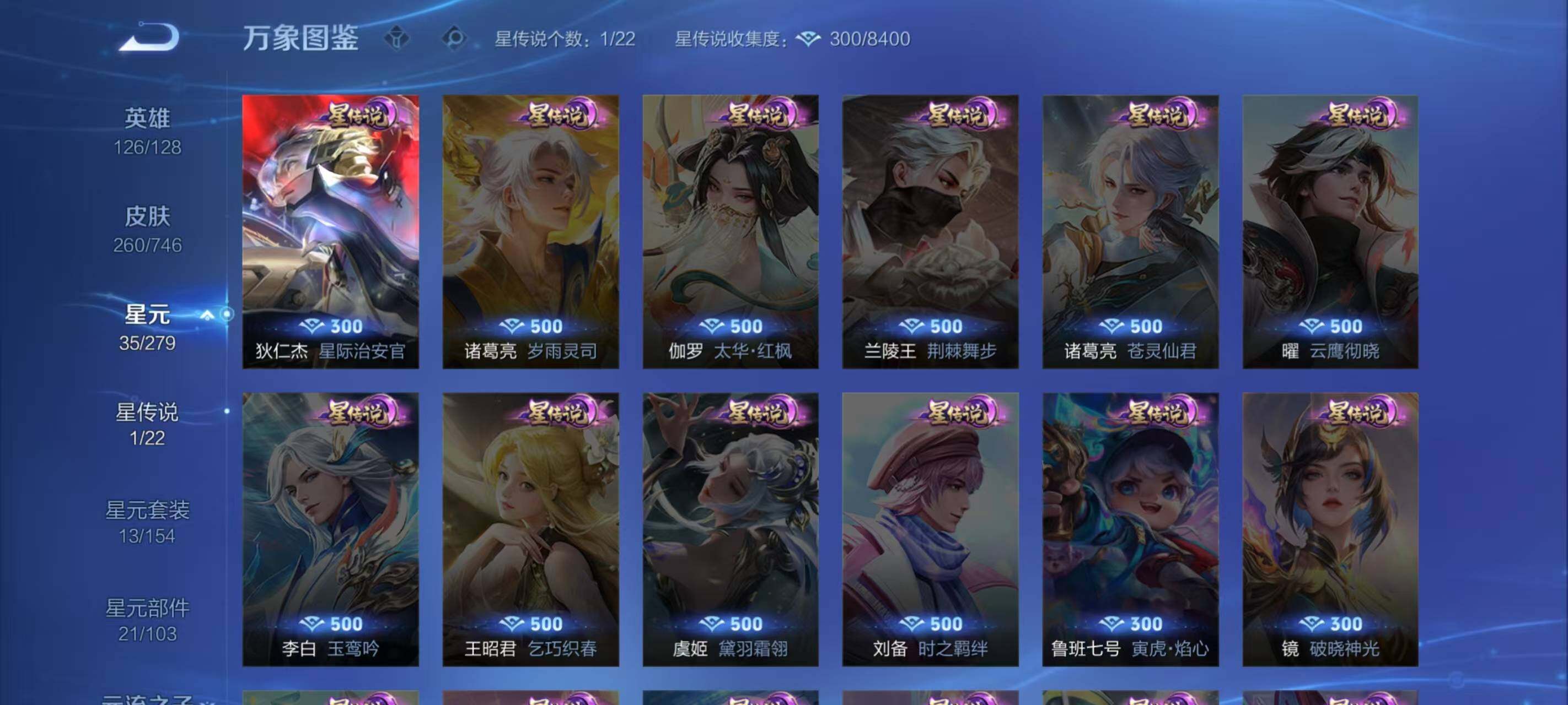 [13865630]安卓Q-259皮肤-2典藏-11传说-63史诗 【荣耀典藏】:孙悟空全息碎影,貂蝉幻阙歌 【传说皮肤】:桑启鸣野蒿,李白诗剑行,女娲补天,鲁班七号寅虎瑞焰,赵云淬星耀世,王昭君乞巧织情,虞姬启明星使,伽罗太华,达摩黄金狮子座,后羿黄金射手座,狄仁杰超时空战士 【限定皮肤】:白起狰,姜子牙天穹之誓,狄仁杰阴阳师,赵云皇家上将,孙尚香蔷薇恋人,鲁班七号狮舞东方,鲁班七号乒乒小将,鲁班七号寅虎瑞焰,庄周高山流水,阿轲迷踪丽影,钟无艳超时空战士,孙膑天狼运算者,白起夜都怪侠,芈月重明,芈月幻夜卜梦,周瑜赤莲之焰,元歌无心,夏侯惇朔风刀,甄姬落雪兰心,曹操烛龙,典韦蓝屏警告,狄仁杰魔术师,狄仁杰万华元夜,达摩星际陆战队,达摩沙漠行僧,项羽海滩派对,老夫子醍醐杖,程咬金演武夺筹,刘邦夺宝奇兵,韩信逐梦之影,韩信飞衡,王昭君午后时光,兰陵王驯魔猎人,兰陵王金庭之子,亚瑟潮玩骑士王,孙悟空至尊宝,牛魔御旌,后羿圣弓游侠,李元芳银河之约,李元芳云中旅人,虞姬启明星使,钟馗神迹守卫,钟馗驱傩正仪,女娲朔望之晖,女娲补天,干将莫邪真爱魔法,雅典娜单词大作战,蔡文姬繁星吟游,太乙真人饕餮,鬼谷子原初探秘者,鬼谷子五谷丰年,黄忠烈魂,黄忠火炮绅士,苏烈千军破阵,弈星混沌棋,公孙离玉兔公主,沈梦溪星空之诺,沈梦溪大漠名商,明世隐疑决卦,裴擒虎李小龙,裴擒虎擒涛扼浪,狂铁御狮,米莱狄御霄,云中君纤云弄巧,伽罗太华,盾山御銮,猪八戒西部大镖客,猪八戒猪悟能,上官婉儿梁祝,嫦娥拒霜思,蒙犽狂想玩偶喵,桑启海盐诗旅,艾琳女武神,阿古朵江河有灵,张良古海寻踪,妲己灵卜魔法,鬼谷子天穹祈灯,沈梦溪龙舞盛年,鲁班七号蔬乡物语,李元芳蔬乡物语,刘邦剑破天穹,程咬金群星魔术团 【年限皮肤】:鲁班七号寅虎瑞焰,伽罗太华,韩信飞衡,黄忠烈魂 【赛季限定】:白起狰,芈月重明,夏侯惇朔风刀,曹操烛龙,狄仁杰万华元夜,达摩沙漠行僧,老夫子醍醐杖,程咬金演武夺筹,兰陵王金庭之子,张良古海寻踪,牛魔御旌,李元芳云中旅人,钟馗驱傩正仪,太乙真人饕餮,鬼谷子原初探秘者,苏烈千军破阵,弈星混沌棋,沈梦溪大漠名商,明世隐疑决卦,裴擒虎擒涛扼浪,狂铁御狮,米莱狄御霄,盾山御銮,桑启海盐诗旅,鬼谷子天穹祈灯,刘邦剑破天穹,姜子牙天穹之誓 【战令限定】:鲁班七号狮舞东方,阿轲迷踪丽影,钟无艳超时空战士,白起夜都怪侠,芈月幻夜卜梦,周瑜赤