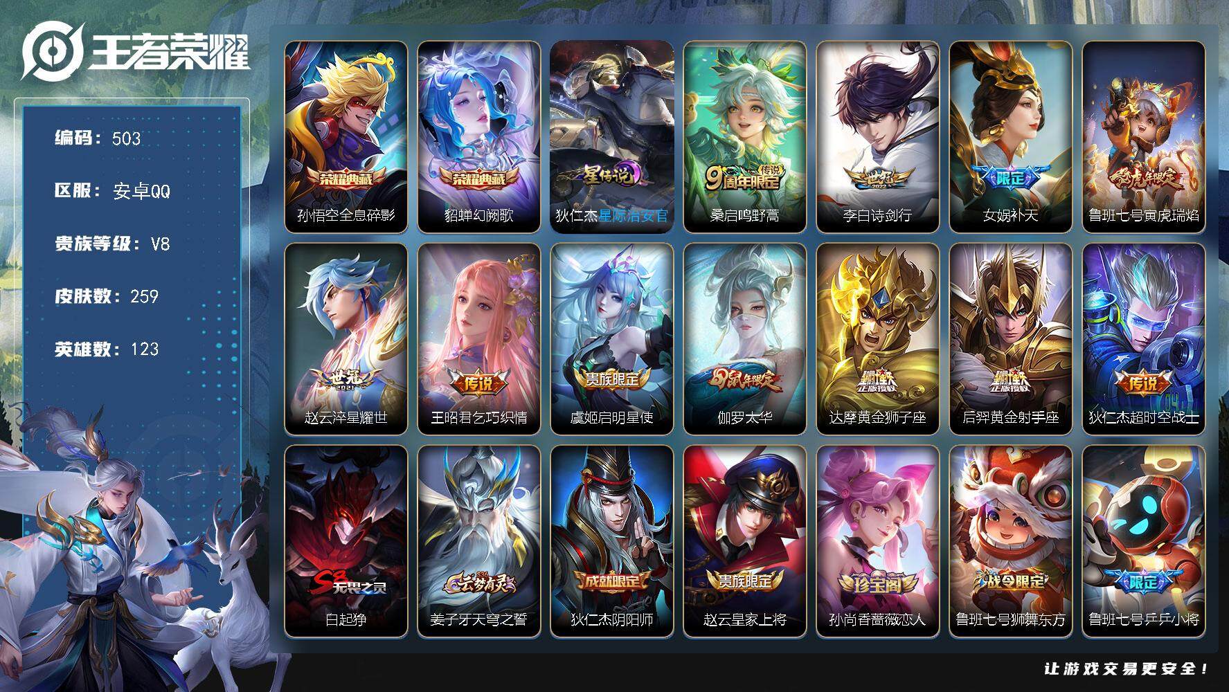 - [11941154]V9 1典藏 23传说 121英雄 334皮肤 可修改实名 优质装备:鸣剑·曳影,云鹰飞将(小将军),黄金白羊座,一念神魔,末日机甲-孙尚香(绿蚂蚱),仲夏夜之梦(大飞蛾),零号·赤焰,淬星耀世,超时空战士-狄仁杰,挚爱之约,挚爱花嫁,山海·炽霜斩(李信年限) 传说皮:乘龙·问璇玑(孙尚香年限),落雪白狼 珍宝阁皮:优雅恋人,女武神 限定皮:白虎志(电光耗子),凤求凰(白切鸡),太华(伽罗年限),梅西,傲雪梅枪,白晶晶,时雨天司(水龙头),神威(电光马子),飞衡(韩信年限),遇见飞天,高山流水,诗剑行,怒海麟威,五谷丰年,冰锋战神,武圣,游园惊梦,梁祝,御风骁将(吕布年限),天狼狩猎者,龙胆,逐梦之星,李小龙,逐梦之影,霸王别姬-虞姬,孙行者,猪悟能,大圣娶亲,引擎之心,天魔缭乱,乒乒小将,匿光追影者,枫霜尽,山海·玄木吟(马可年限) 史诗皮:紫霞仙子,白龙吟,黄金分割率,特工魅影,千年之狐,江河有灵,鹤归松栖(赵怀真),魅语,蒙恬荣光圣徽,无限星赏官,偶像歌手,晚萤,暗夜猫娘,龙骑士(小龙虾),末日机甲-吕布,乱世虎臣,修罗,女仆咖啡,水果甜心,绅士熊喵,天才门将,星夜王子,功夫厨神,暗隐猎兽者,幽灵船长,鬼剑武藏,心灵战警,舞动绿茵,地狱岩魂,纤云弄巧,缤纷独角兽,乘风破浪,逐浪之夏,水晶猎龙者,曙光守护者,热力回旋,箭羽风息,金属风暴,原初追逐者,圣诞狂欢,圣诞恋歌,鹰眼统帅,魅力维加斯,黎明之约,赏金猎手,无心