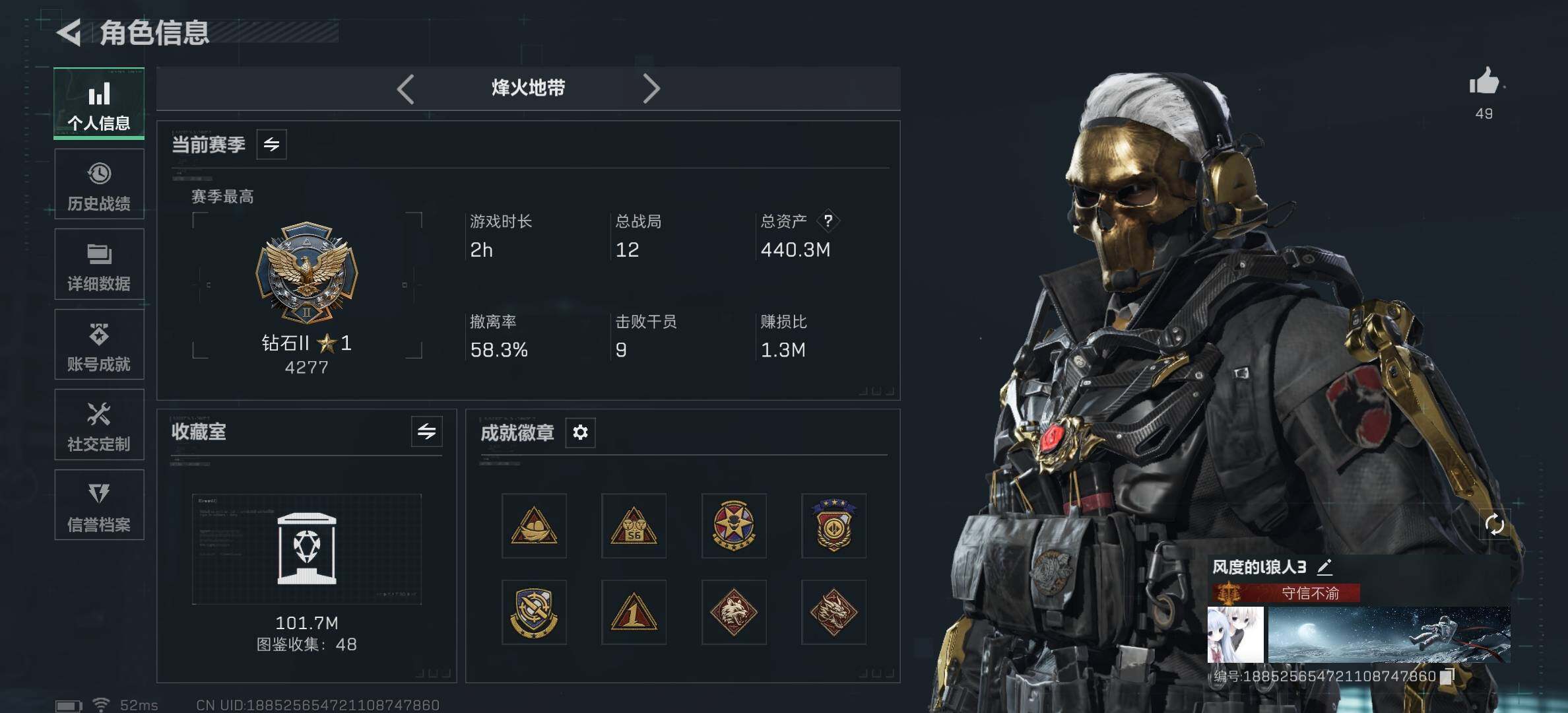 [13865676]可二次【店主推荐捡漏号!可直接换绑】总资产440m 163442k哈伏币-417m流动资产-60烽火等级-钻石-19战场等级-列兵