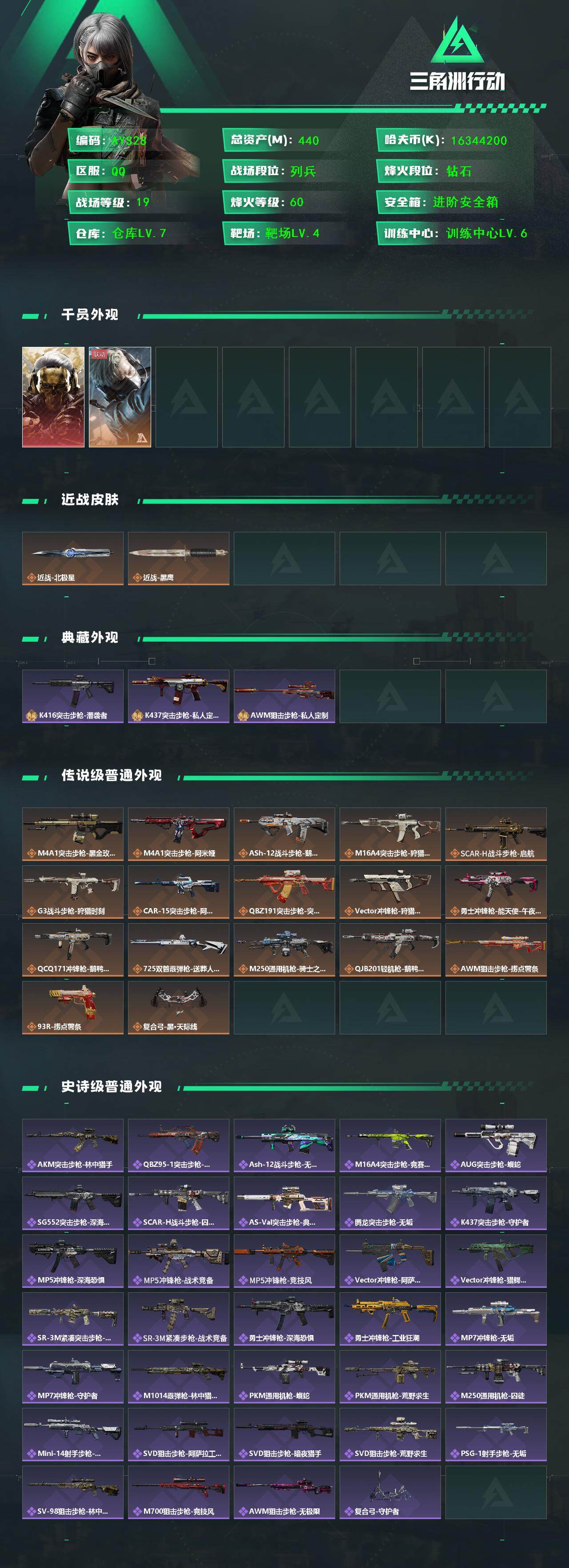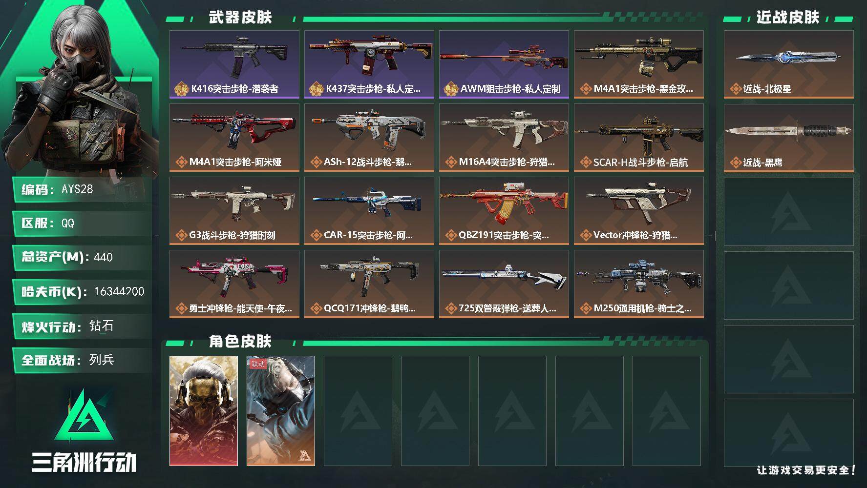 [13865676]可二次【店主推荐捡漏号!可直接换绑】总资产440m 163442k哈伏币-417m流动资产-60烽火等级-钻石-19战场等级-列兵 【干员外观】:红狼-蚀金玫瑰,蜂医-送葬人·无题密令 【近战皮肤】:近战-北极星,近战-黑鹰 【典藏外观】:K416突击步枪-潜袭者,K437突击步枪-私人定制,AWM狙击步枪-私人定制 【传说级普通外观】:M4A1突击步枪-蚀金玫瑰,M4A1突击步枪-阿米娅,ASh-12战斗步枪-鹅鸭杀,M16A4突击步枪-狩猎时刻,SCAR-H战斗步枪-启航,G3战斗步枪-狩猎时刻,CAR-15突击步枪-阿米娅,腾龙突击步枪-捞点薯条,Vector冲锋枪-狩猎时刻,勇士冲锋枪-能天使-午夜邮差,QCQ171冲锋枪-鹅鸭杀,725双管霰弹枪-送葬人-无题密令,M250通用机枪-骑士之心,QJB201轻机枪-鹅鸭杀,AWM狙击步枪-捞点薯条,93R-捞点薯条,复合弓-黑·天际线 【史诗级普通外观】:AKM突击步枪-林中猎手,QBZ95-1突击步枪-曙光,ASh-12战斗步枪-无极限,M16A4突击步枪-竞赛选手,AUG突击步枪-蝮蛇,SG552突击步枪-深海恐惧,SCAR-H战斗步枪-囚徒,AS Val突击步枪-典狱官,腾龙突击步枪-无垢,K437突击步枪-守护者,MP5冲锋枪-深海恐惧,MP5冲锋枪-战术竞备,MP5冲锋枪-竞技风,Vector冲锋枪-阿萨拉文明,Vector冲锋枪-猎鳄行动,SR-3M紧凑突击步枪-荒野求生,SR-3M紧凑突击步枪-战术竞备,勇士冲锋枪-深海恐惧,勇士冲锋枪-工业狂潮,MP7冲锋枪-无垢,MP7冲锋枪-守护者,M1014霰弹枪-林中猎手,PKM通用机枪-蝮蛇,PKM通用机枪-荒野求生,M250通用机枪-囚徒,Mini-14射手步枪-守护者,SVD狙击步枪-阿萨拉工艺,SVD狙击步枪-暗夜猎手,SVD狙击步枪-荒野求生,PSG-1射手步枪-无垢,SV-98狙击步枪-林中猎手,M700狙击步枪-竞技风,AWM狙击步枪-无极限,复合弓-守护者 【稀有级普通外观】:K416突击步枪-前沿科技,K416突击步枪-虎啸,SG552突击步枪-前沿科技,SCAR-H战斗步枪-童趣,SCAR-H战斗步枪-荣耀列队,PTR-32突击步枪-天网,PTR-32突击步枪-英雄,腾龙突击步枪-雪崩,腾龙突击步枪-前沿科技,K437突击步枪-天