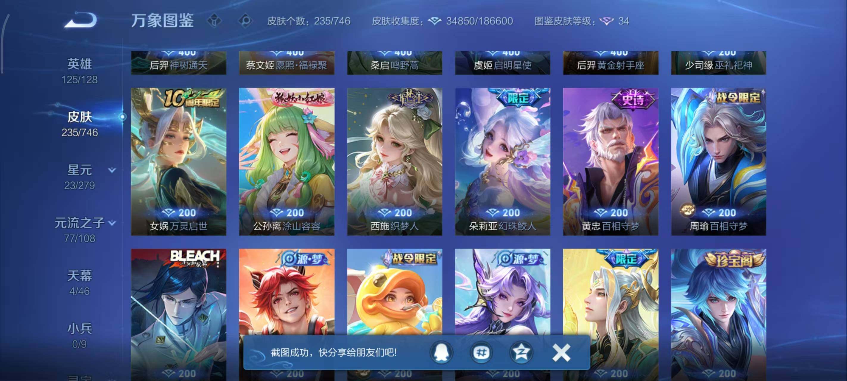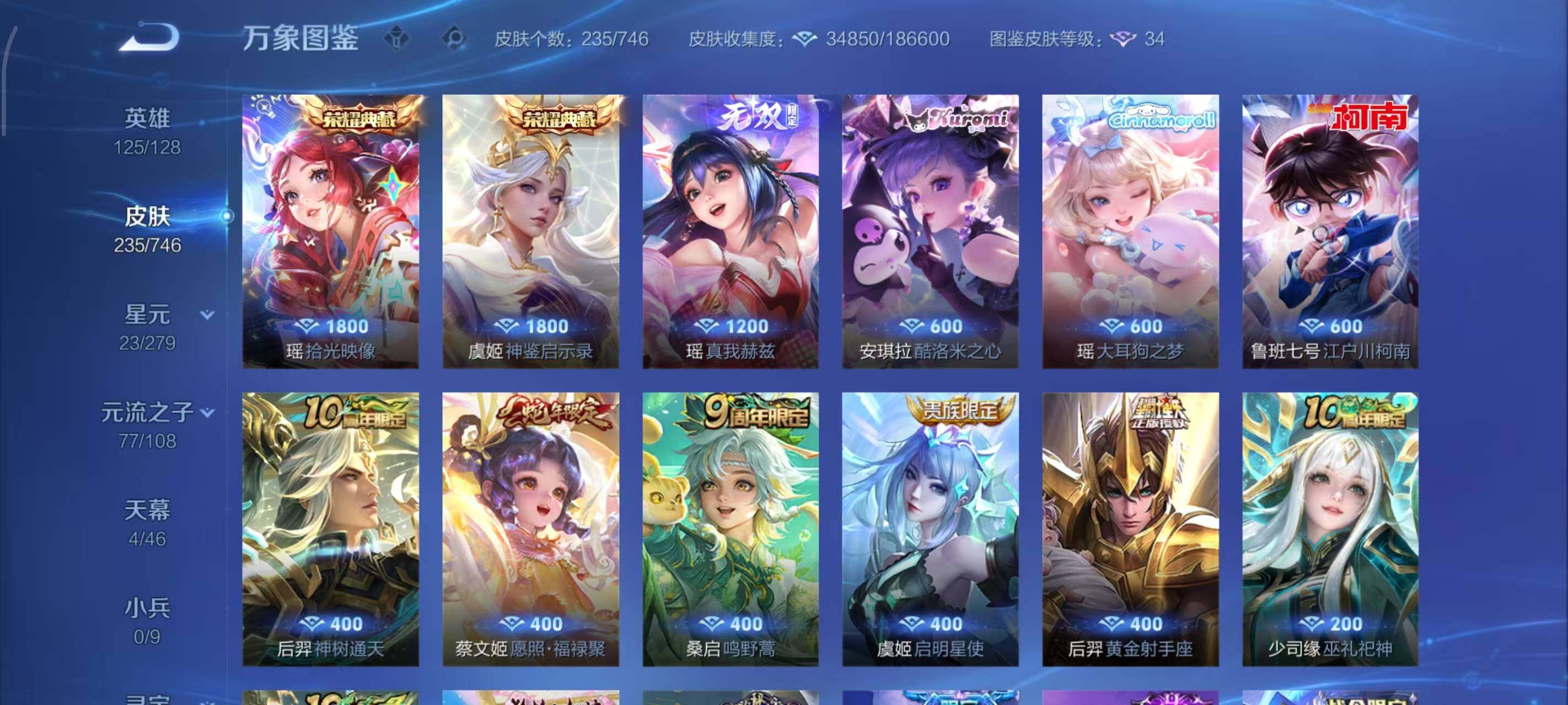【限定皮肤】:蒙犽顽岩魄,蔡文姬夏日便利店,大乔绒语心约,虞姬夏日便利店,姜子牙天穹之誓,李白谪仙醉月,狄仁杰阴阳师,赵云皇家上将,阿轲迷踪丽影,孙膑寅虎展翼,甄姬落雪兰心,狄仁杰魔术师,项羽海滩派对,王昭君午后时光,虞姬启明星使,杨戬潮玩骑兵,裴擒虎擒涛扼浪,嫦娥暖冬兔眠,西施玲珑珍味,蒙犽狂想玩偶喵,鲁班大师探海日志,艾琳流音漫舞,妲己灵卜魔法,鬼谷子天穹祈灯,安琪拉乘龙聚宝船,沈梦溪龙舞盛年,鲁班七号蔬乡物语,李元芳蔬乡物语,刘邦剑破天穹,刘备异域游侠,周瑜熔金海岸