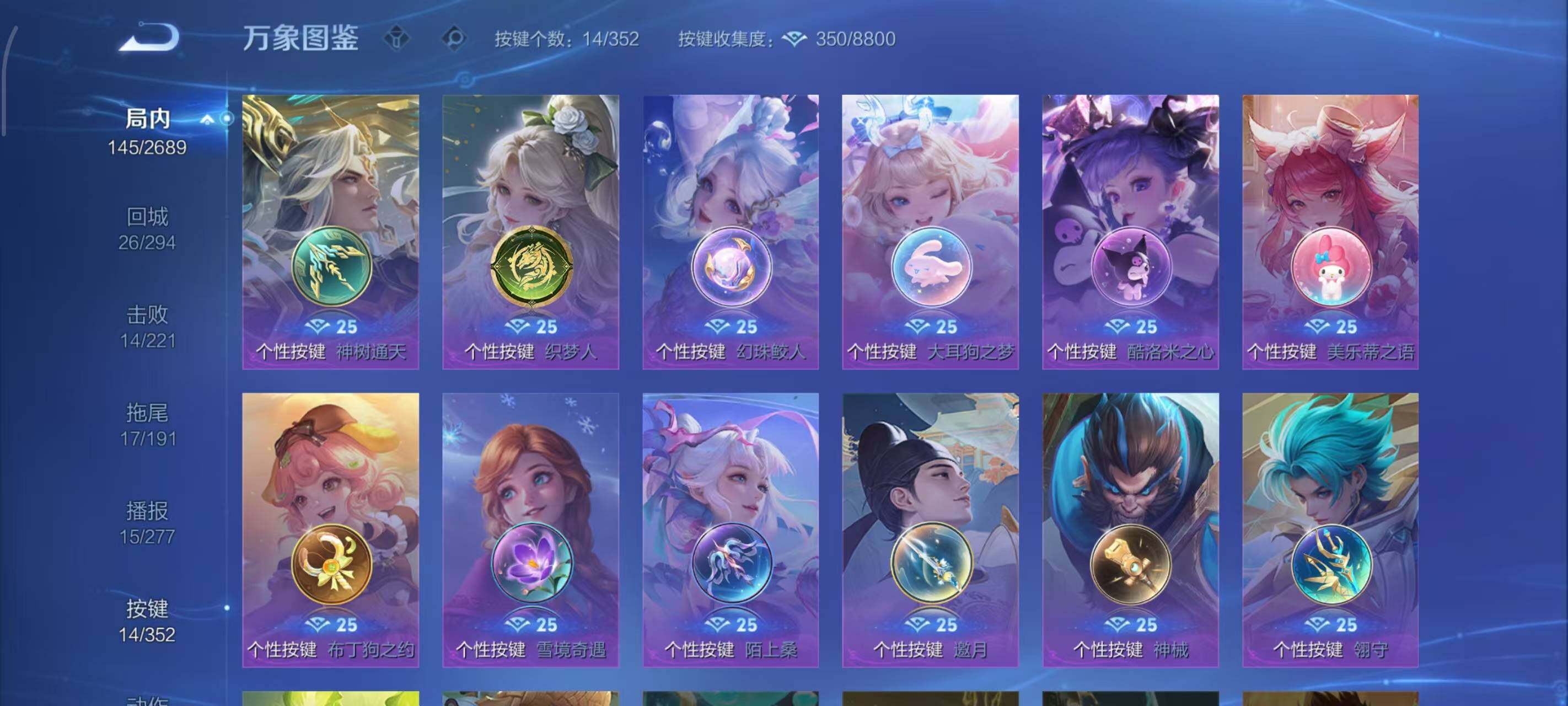 小乔青蛇,伽罗箭羽风息,李元芳逐浪之夏,公孙离无限星赏官,大乔猫狗日记,露娜紫霞仙子,王昭君偶像歌手,孙尚香时之恋人,雅典娜冰冠公主,鲁班七号电玩小子,刘禅天才门将,安琪拉心灵骇客,刘邦德古拉伯爵,兰陵王暗隐猎兽者,宫本武藏鬼剑武藏,亚瑟心灵战警,蔡文姬舞动绿茵,廉颇地狱岩魂,小乔缤纷独角兽,夏侯惇乘风破浪,花木兰水晶猎龙者,铠曙光守护者,墨子金属风暴,吕布圣诞狂欢,貂蝉圣诞恋歌,庄周天秀·幻梦,阿古朵顽趣,安琪拉乘龙·聚宝船,李白谪仙醉月,赵怀真器灵·浮梦炉