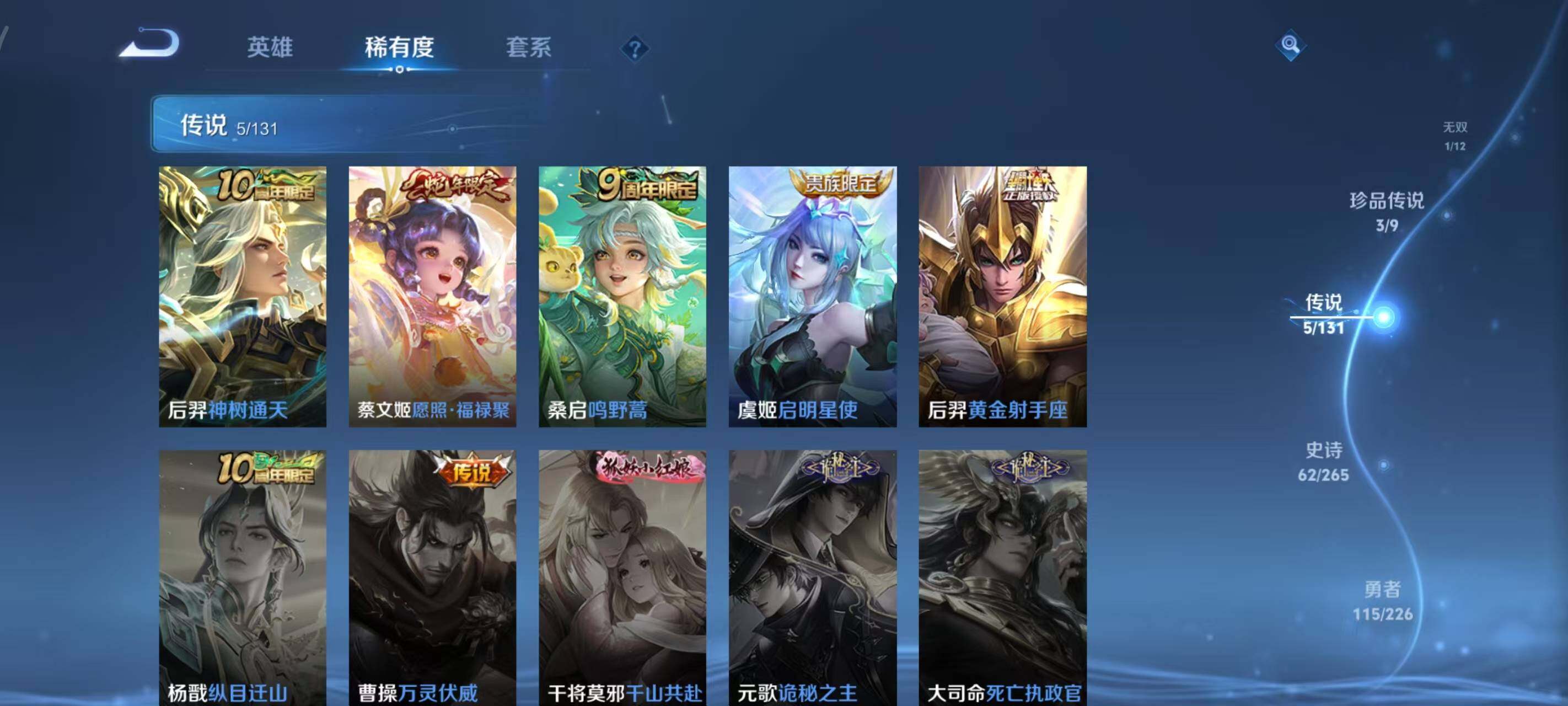 【传说皮肤】:后羿神树通天,蔡文姬愿照福禄聚,桑启鸣野蒿,虞姬启明星使,后羿黄金射手座