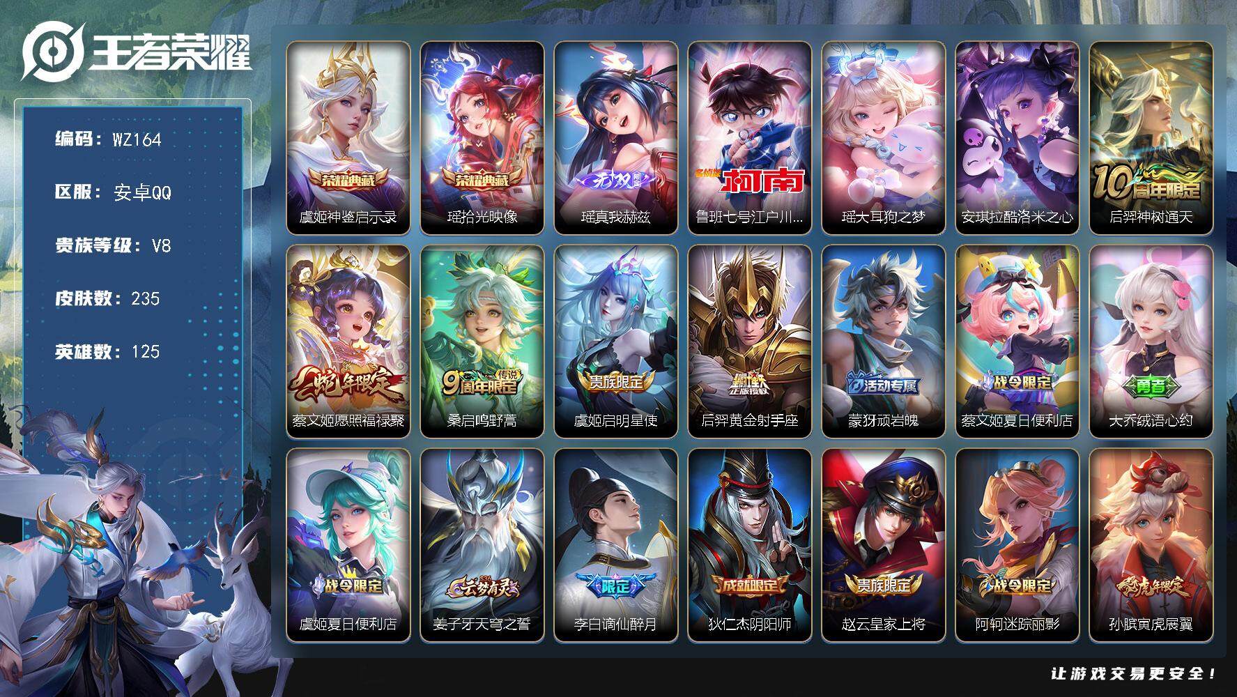 [13865650]安卓Q-V8-235皮肤-2典藏-1无双-3珍品传说-5传说-62史诗 【英雄全皮】:孙权全皮,空空儿全皮,影全皮,少司缘全皮 【荣耀典藏】:虞姬神鉴启示录,瑶拾光映像 【无双皮肤】:瑶真我赫兹 【珍品传说】:鲁班七号江户川柯南,瑶大耳狗之梦,安琪拉酷洛米之心 【传说皮肤】:后羿神树通天,蔡文姬愿照福禄聚,桑启鸣野蒿,虞姬启明星使,后羿黄金射手座 【限定皮肤】:蒙犽顽岩魄,蔡文姬夏日便利店,大乔绒语心约,虞姬夏日便利店,姜子牙天穹之誓,李白谪仙醉月,狄仁杰阴阳师,赵云皇家上将,阿轲迷踪丽影,孙膑寅虎展翼,甄姬落雪兰心,狄仁杰魔术师,项羽海滩派对,王昭君午后时光,虞姬启明星使,杨戬潮玩骑兵,裴擒虎擒涛扼浪,嫦娥暖冬兔眠,西施玲珑珍味,蒙犽狂想玩偶喵,鲁班大师探海日志,艾琳流音漫舞,妲己灵卜魔法,鬼谷子天穹祈灯,安琪拉乘龙聚宝船,沈梦溪龙舞盛年,鲁班七号蔬乡物语,李元芳蔬乡物语,刘邦剑破天穹,刘备异域游侠,周瑜熔金海岸 【年限皮肤】:孙膑寅虎展翼,安琪拉乘龙聚宝船 【赛季限定】:裴擒虎擒涛扼浪,鲁班大师探海日志,鬼谷子天穹祈灯,刘邦剑破天穹,姜子牙天穹之誓 【战令限定】:蔡文姬夏日便利店,虞姬夏日便利店,阿轲迷踪丽影,甄姬落雪兰心,王昭君午后时光,艾琳流音漫舞,杨戬潮玩骑兵,嫦娥暖冬兔眠,西施玲珑珍味,蒙犽狂想玩偶喵,妲己灵卜魔法,鲁班七号蔬乡物语,李元芳蔬乡物语 【史诗皮肤】:鲁班七号电玩小子,露娜紫霞仙子,赵云皇家上将,貂蝉圣诞恋歌,甄姬冰雪圆舞曲,王昭君偶像歌手,狄仁杰魔术师,廉颇地狱岩魂,宫本武藏鬼剑武藏,孙尚香水果甜心,妲己魅力维加斯,妲己女仆咖啡,墨子金属风暴,吕布圣诞狂欢,张飞乱世虎臣,花木兰水晶猎龙者,刘邦德古拉伯爵,夏侯惇乘风破浪,小乔缤纷独角兽,兰陵王暗隐猎兽者,亚瑟心灵战警,雅典娜冰冠公主,安琪拉心灵骇客,铠曙光守护者,蔡文姬舞动绿茵,刘禅天才门将,李元芳逐浪之夏,大乔猫狗日记,伽罗箭羽风息,公孙离无限星赏官,小乔青蛇,阿轲迷踪丽影,孙尚香时之恋人,蒙犽狂想玩偶喵,孙膑寅虎展翼,庄周天秀幻梦,阿古朵顽趣,妲己灵卜魔法,安琪拉乘龙聚宝船,鲁班七号蔬乡物语,蔡文姬夏日便利店,蒙犽顽岩魄,少司缘涂山红红,姬小满战舞者,廉颇撼地雄心,亚连破空之剑,李白谪仙醉月,艾琳陌上桑,百里守约百相守梦,孙膑茶境仙,弈星万物之道,赵怀真器灵浮梦炉,阿轲化蝶舞,刘禅鸭鸭