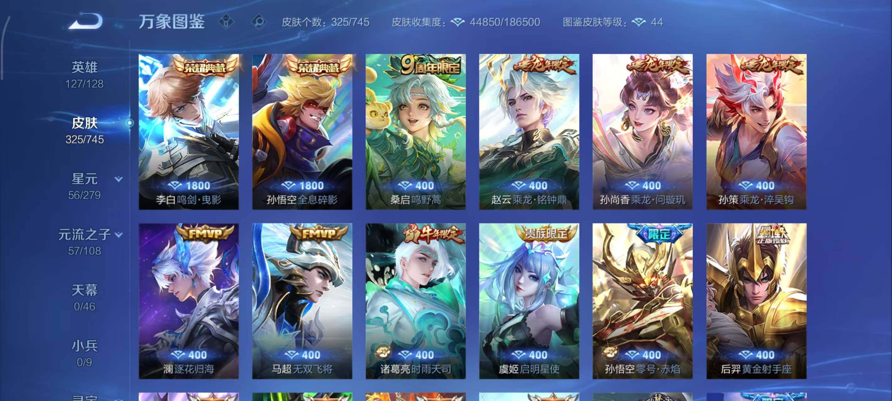 [13865658]安卓Q-V8-至尊星耀II段位-126英雄-326皮肤-2典藏-0-14传说-87史诗 【荣耀典藏】:武则天英雄,孙悟空全息碎影,李白鸣剑曳影 【传说皮肤】:桑启鸣野蒿,孙尚香乘龙问璇玑,孙策乘龙淬吴钩,赵云乘龙铭钟鼎,澜逐花归海,马超无双飞将,诸葛亮时雨天司,虞姬启明星使,孙悟空零号赤焰,后羿黄金射手座,貂蝉仲夏夜之梦,孙尚香末日机甲,孙悟空地狱火,武则天海洋之心 【限定皮肤】:白起狰,狄仁杰阴阳师,虞姬凯尔特女王,赵云皇家上将,嬴政白昼王子,孙尚香蔷薇恋人,鲁班七号狮舞东方,庄周高山流水,阿轲迷踪丽影,钟无艳超时空战士,扁鹊炼金王,芈月重明,吕布猎兽之王,周瑜赤莲之焰,元歌云间偶戏,元歌无心,夏侯惇朔风刀,甄姬游园惊梦,甄姬落雪兰心,曹操烛龙,典韦穷奇,典韦蓝屏警告,马可波罗暗影游猎,狄仁杰魔术师,狄仁杰万华元夜,达摩星际陆战队,达摩沙漠行僧,项羽海滩派对,老夫子醍醐杖,程咬金演武夺筹,刘邦夺宝奇兵,韩信傲雪梅枪,兰陵王驯魔猎人,兰陵王金庭之子,花木兰青春决赛季,亚瑟潮玩骑士王,孙悟空至尊宝,孙悟空大圣娶亲,孙悟空零号赤焰,牛魔御旌,后羿圣弓游侠,李元芳银河之约,李元芳云中旅人,虞姬启明星使,钟馗神迹守卫,钟馗驱傩正仪,杨玉环遇见飞天,女娲朔望之晖,雅典娜单词大作战,雅典娜黎明之约,蔡文姬繁星吟游,太乙真人饕餮,鬼谷子原初探秘者,鬼谷子五谷丰年,诸葛亮时雨天司,苏烈千军破阵,百里玄策原初追逐者,弈星混沌棋,梦奇顽趣,沈梦溪星空之诺,沈梦溪大漠名商,明世隐疑决卦,裴擒虎李小龙,裴擒虎擒涛扼浪,狂铁御狮,米莱狄御霄,米莱狄胡桃异想国,云中君纤云弄巧,盾山御銮,猪八戒西部大镖客,上官婉儿天狼绘梦者,嫦娥拒霜思,嫦娥暖冬兔眠,蒙犽狂想玩偶喵,鲁班大师探海日志,桑启海盐诗旅,暃星界游侠,阿古朵江河有灵,张良古海寻踪,蒙犽百解令,高渐离燃音魔法,妲己灵卜魔法,鬼谷子天穹祈灯,姬小满妄想食味,孙尚香乘龙问璇玑,孙策乘龙淬吴钩,赵云乘龙铭钟鼎,沈梦溪龙舞盛年,刘邦剑破天穹,程咬金群星魔术团 【年限皮肤】:诸葛亮时雨天司,孙尚香乘龙问璇玑,孙策乘龙淬吴钩,赵云乘龙铭钟鼎 【赛季限定】:扁鹊炼金王,白起狰,芈月重明,夏侯惇朔风刀,曹操烛龙,典韦穷奇,狄仁杰万华元夜,达摩沙漠行僧,老夫子醍醐杖,程咬金演武夺筹,兰陵王金庭之子,张良古海寻踪,牛魔御旌,李元芳云中旅人,虞姬凯尔特女王,