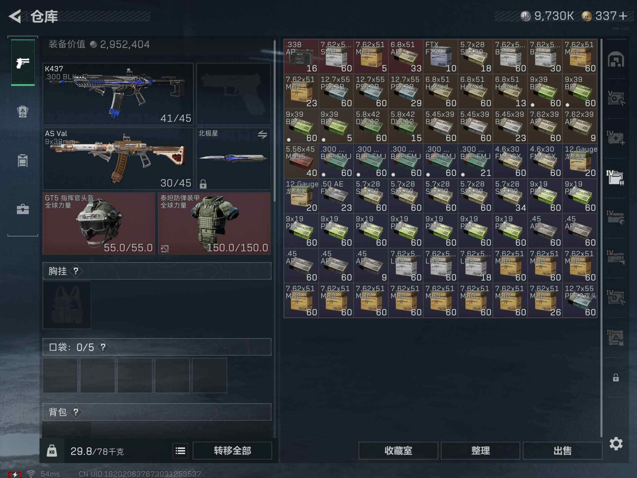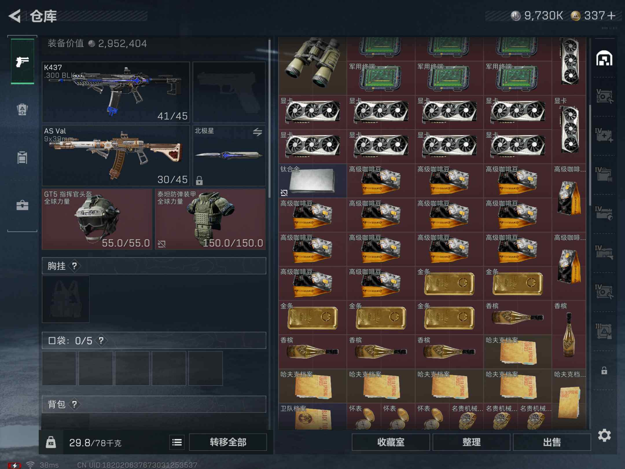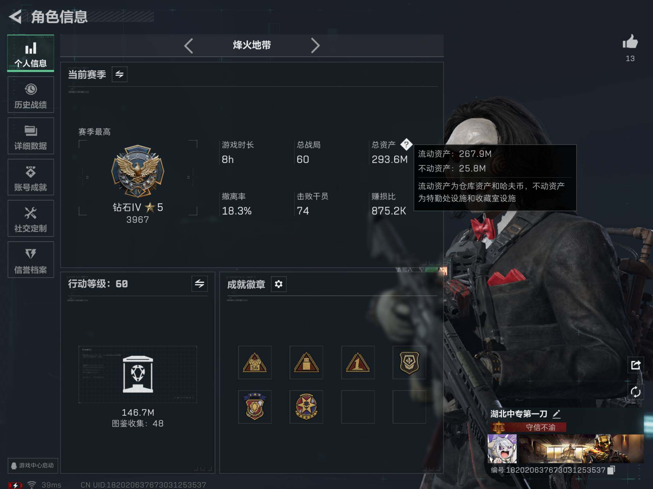 总资产293m 9730k哈伏币-267m流动资产-60烽火等级-钻石-23战场等级-上等兵