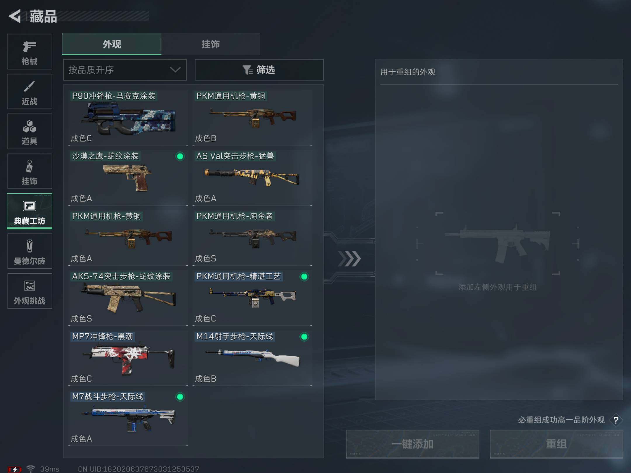 【典藏外观】:MP7冲锋枪-黑潮,M7战斗步枪-天际线,M14射手步枪-天际线,PKM通用机枪-精湛工艺,PKM通用机枪-淘金者,AKS-74U突击步枪-蛇纹涂装,沙漠之鹰-蛇纹涂装,PKM通用机枪-黄铜,P90冲锋枪-马赛克涂装