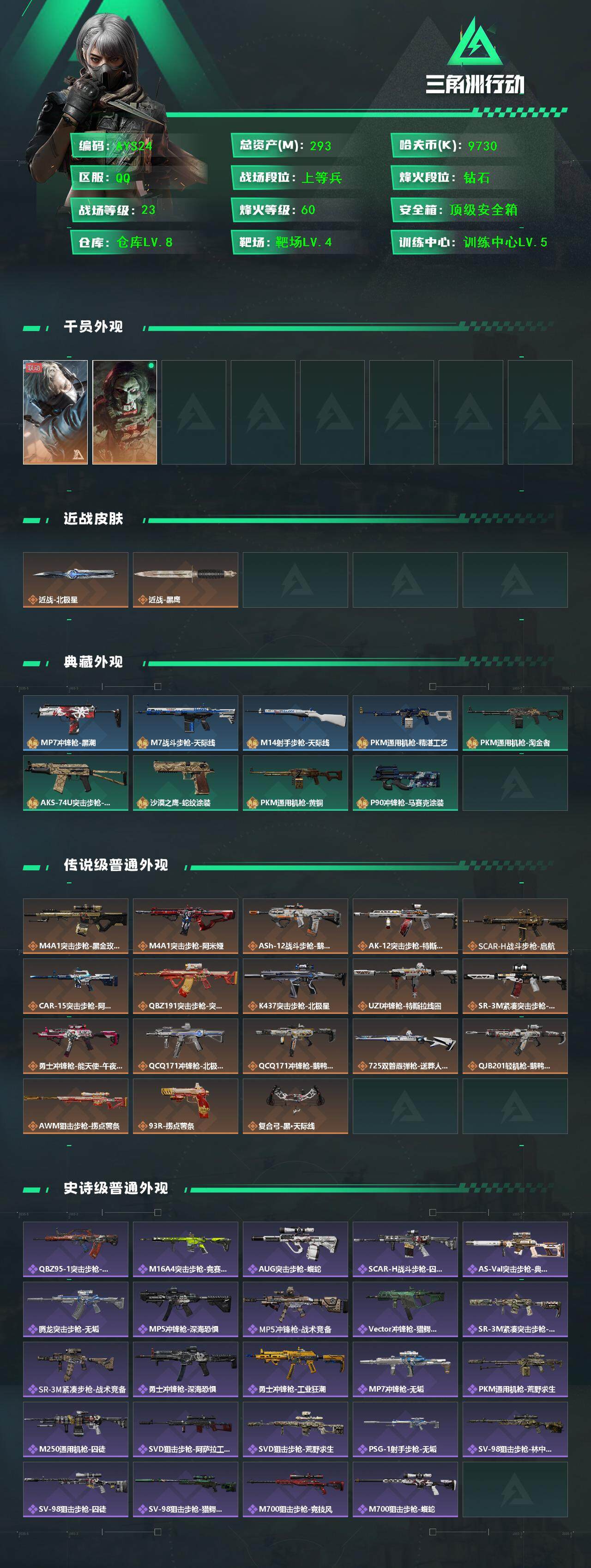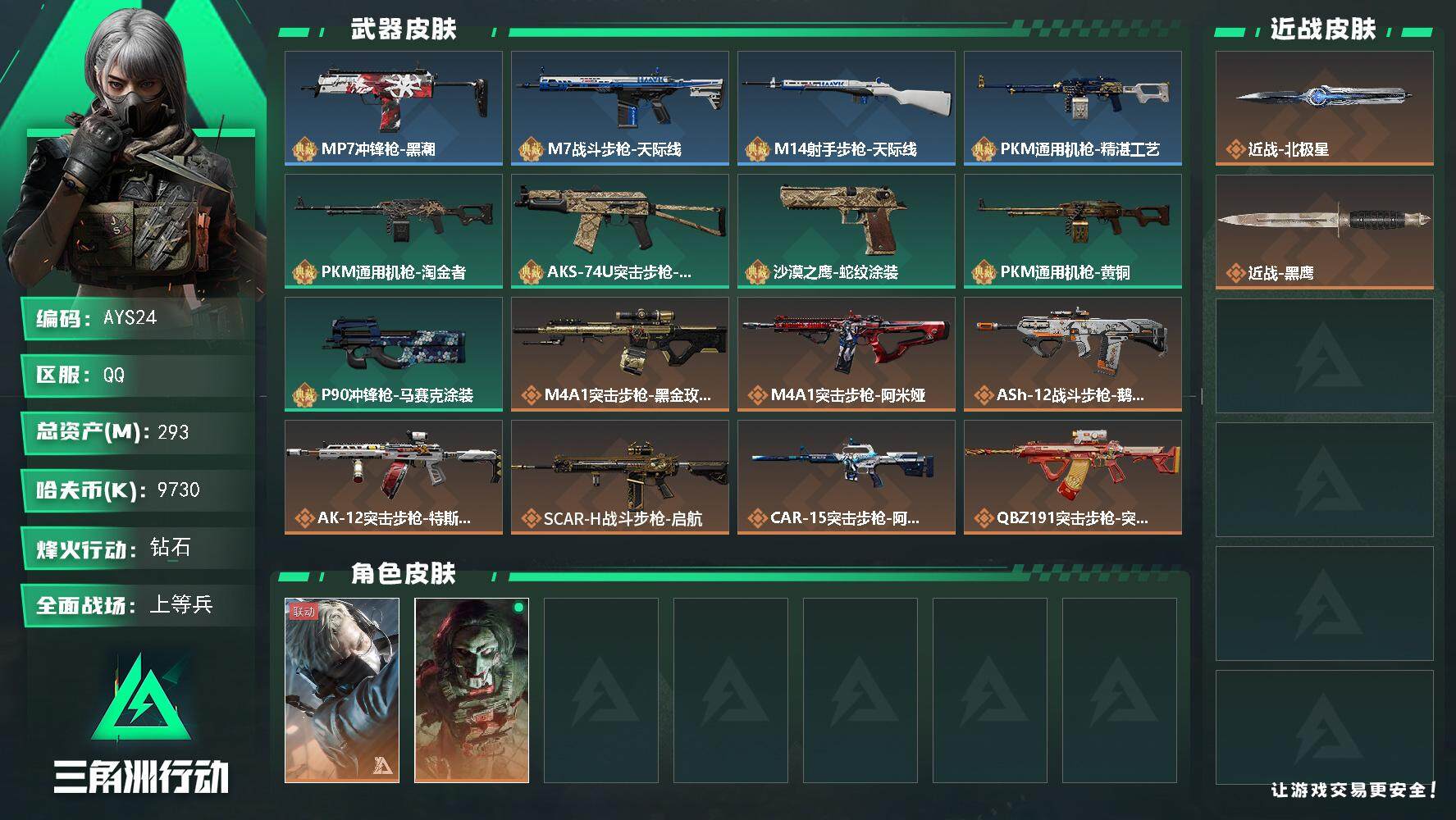 [13865713]【店主推荐捡漏号!可直接换绑】 总资产293m 9730k哈伏币-267m流动资产-60烽火等级-钻石-23战场等级-上等兵 【干员外观】:蜂医-送葬人·无题密令,红狼-电锯惊魂 【近战皮肤】:近战-北极星,近战-黑鹰 【典藏外观】:MP7冲锋枪-黑潮,M7战斗步枪-天际线,M14射手步枪-天际线,PKM通用机枪-精湛工艺,PKM通用机枪-淘金者,AKS-74U突击步枪-蛇纹涂装,沙漠之鹰-蛇纹涂装,PKM通用机枪-黄铜,P90冲锋枪-马赛克涂装 【传说级普通外观】:M4A1突击步枪-蚀金玫瑰,M4A1突击步枪-阿米娅,ASh-12战斗步枪-鹅鸭杀,AK-12突击步枪-特斯拉线圈,SCAR-H战斗步枪-启航,CAR-15突击步枪-阿米娅,腾龙突击步枪-捞点薯条,K437突击步枪-北极星,UZI冲锋枪-特斯拉线圈,SR-3M紧凑突击步枪-特斯拉线圈,勇士冲锋枪-能天使-午夜邮差,QCQ171冲锋枪-北极星,QCQ171冲锋枪-鹅鸭杀,725双管霰弹枪-送葬人-无题密令,QJB201轻机枪-鹅鸭杀,AWM狙击步枪-捞点薯条,93R-捞点薯条,复合弓-黑·天际线 【史诗级普通外观】:QBZ95-1突击步枪-曙光,M16A4突击步枪-竞赛选手,AUG突击步枪-蝮蛇,SCAR-H战斗步枪-囚徒,AS Val突击步枪-典狱官,腾龙突击步枪-无垢,MP5冲锋枪-深海恐惧,MP5冲锋枪-战术竞备,Vector冲锋枪-猎鳄行动,SR-3M紧凑突击步枪-荒野求生,SR-3M紧凑突击步枪-战术竞备,勇士冲锋枪-深海恐惧,勇士冲锋枪-工业狂潮,MP7冲锋枪-无垢,PKM通用机枪-荒野求生,M250通用机枪-囚徒,SVD狙击步枪-阿萨拉工艺,SVD狙击步枪-荒野求生,PSG-1射手步枪-无垢,SV-98狙击步枪-林中猎手,SV-98狙击步枪-囚徒,SV-98狙击步枪-猎鳄行动,M700狙击步枪-竞技风,M700狙击步枪-蝮蛇 【稀有级普通外观】:K416突击步枪-虎啸,M7战斗步枪-前沿科技,SCAR-H战斗步枪-荣耀列队,PTR-32突击步枪-天网,腾龙突击步枪-雪崩,K437突击步枪-天狼星,MP5冲锋枪-弄臣,MP5冲锋枪-巡逻队,MP5冲锋枪-虎啸,Vector冲锋枪-先锋,SMG-45冲锋枪-哈夫克卫队,SMG-45-行动开启,SMG-45冲锋枪-天网,SR-3M紧凑突击步枪-雪