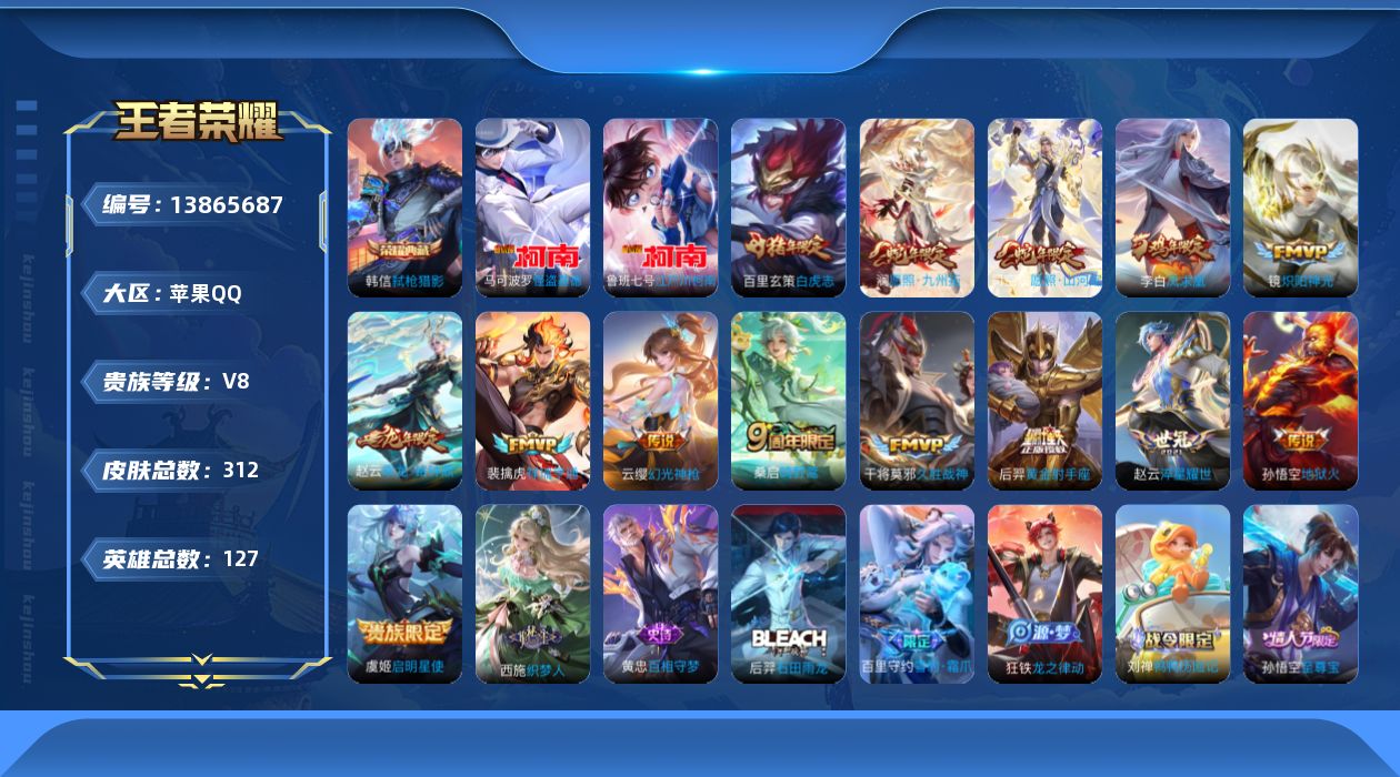 [13865687]苹果Q-V8-最强王者段位-125英雄-305皮肤-1典藏-0珍品无双-0无双-2珍品传说-14传说-91史诗 【荣耀典藏】:韩信弑枪猎影 【珍品传说】:马可波罗怪盗基德,鲁班七号江户川柯南 【传说皮肤】:司空震愿照山河定,澜愿照九州拓,云缨幻光神枪,裴擒虎祥瑞亨通,桑启鸣野蒿,赵云乘龙铭钟鼎,赵云淬星耀世,镜炽阳神光,虞姬启明星使,干将莫邪久胜战神,百里玄策白虎志,后羿黄金射手座,李白凤求凰,孙悟空地狱火 【限定皮肤】:姜子牙天穹之誓,杨戬破阵退雄兵,狄仁杰阴阳师,赵云皇家上将,嬴政白昼王子,孙尚香蔷薇恋人,鲁班七号狮舞东方,庄周高山流水,高渐离死亡摇滚,阿轲迷踪丽影,芈月重明,吕布猎兽之王,元歌云间偶戏,夏侯惇朔风刀,甄姬游园惊梦,曹操烛龙,典韦穷奇,典韦蓝屏警告,马可波罗暗影游猎,狄仁杰魔术师,狄仁杰万华元夜,达摩沙漠行僧,项羽海滩派对,老夫子醍醐杖,程咬金演武夺筹,刘邦夺宝奇兵,兰陵王金庭之子,花木兰青春决赛季,亚瑟潮玩骑士王,孙悟空至尊宝,孙悟空大圣娶亲,牛魔御旌,李元芳银河之约,李元芳云中旅人,虞姬启明星使,钟馗神迹守卫,钟馗驱傩正仪,杨玉环遇见飞天,女娲朔望之晖,雅典娜黎明之约,蔡文姬繁星吟游,太乙真人华丽摇滚,鬼谷子原初探秘者,鬼谷子五谷丰年,苏烈千军破阵,百里玄策白虎志,百里玄策原初追逐者,弈星混沌棋,梦奇顽趣,沈梦溪星空之诺,沈梦溪大漠名商,明世隐疑决卦,裴擒虎李小龙,裴擒虎擒涛扼浪,狂铁御狮,米莱狄御霄,盾山御銮,猪八戒西部大镖客,猪八戒猪悟能,上官婉儿梁祝,鲁班大师探海日志,桑启海盐诗旅,艾琳女武神,张良古海寻踪,蒙犽百解令,蒙恬荣光圣徽,鬼谷子天穹祈灯,赵云乘龙铭钟鼎,刘邦剑破天穹,程咬金群星魔术团,刘备异域游侠,芈月浮光幕影,周瑜熔金海岸 【年限皮肤】:百里玄策白虎志,李白凤求凰,马超神威,赵云乘龙铭钟鼎 【赛季限定】:芈月重明,夏侯惇朔风刀,曹操烛龙,典韦穷奇,狄仁杰万华元夜,达摩沙漠行僧,老夫子醍醐杖,程咬金演武夺筹,兰陵王金庭之子,张良古海寻踪,牛魔御旌,李元芳云中旅人,钟馗驱傩正仪,雅典娜黎明之约,鬼谷子原初探秘者,苏烈千军破阵,百里玄策原初追逐者,弈星混沌棋,梦奇顽趣,沈梦溪大漠名商,明世隐疑决卦,裴擒虎擒涛扼浪,狂铁御狮,米莱狄御霄,盾山御銮,鲁班大师探海日志,桑启海盐诗旅,鬼谷子天穹祈灯,蒙恬荣光圣徽,刘邦剑破天穹,姜子牙