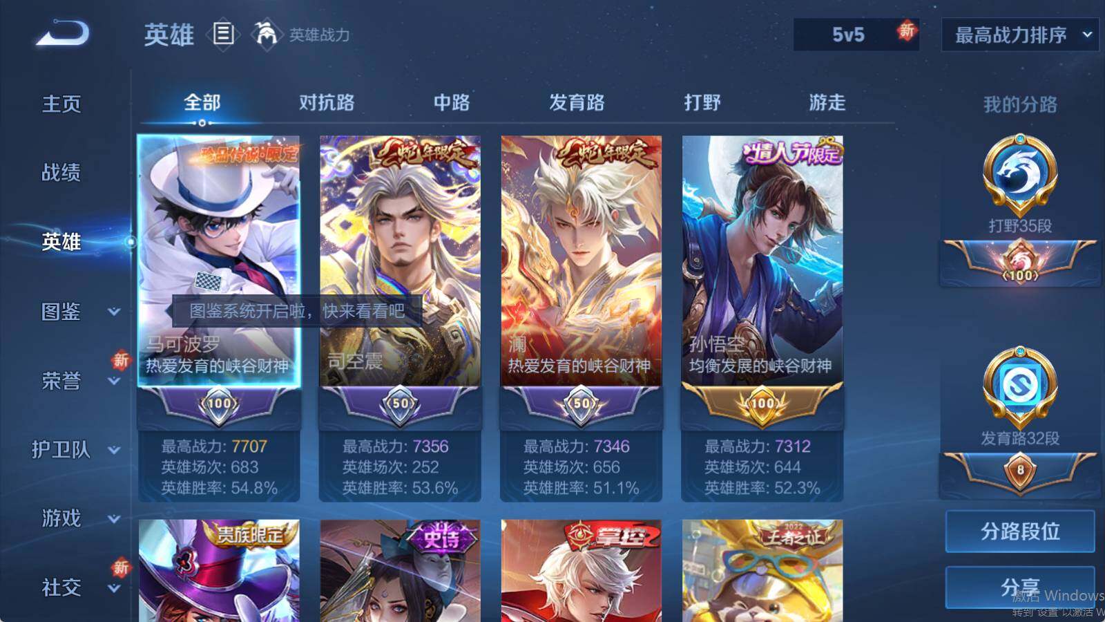 - [11530056]V5 3传说 70英雄 43皮肤 可修改实名 优质装备:一念神魔,仲夏夜之梦(大飞蛾),超时空战士-狄仁杰 限定皮:岱宗(典韦年限) 史诗皮:暗夜猫娘,猫狗日记-大乔,拒霜思,曙光守护者,圣诞狂欢,鹰眼统帅
