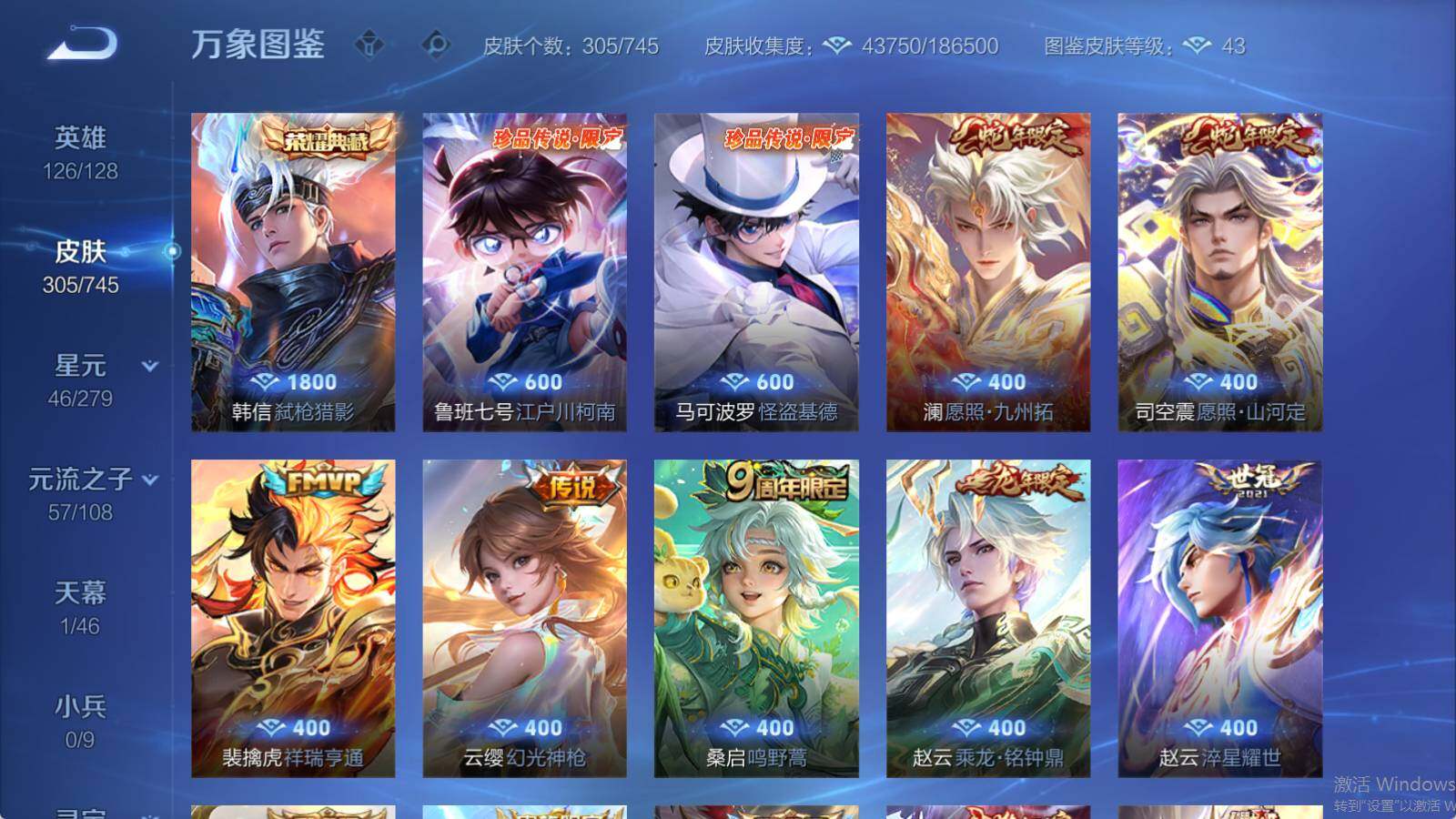 裴擒虎李小龙,上官婉儿梁祝,马超神威,百里玄策白虎志,孙悟空大圣娶亲,孙悟空至尊宝,花木兰青春决赛季,猪八戒猪悟能,桑启鸣野蒿,艾琳陌上桑,澜愿照·九州拓,司空震愿照·山河定