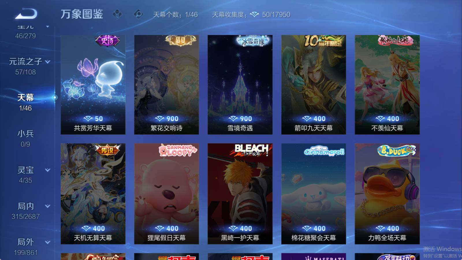 曹操烛龙,芈月重明,典韦穷奇,狂铁御狮,米莱狄御霄,牛魔御旌,盾山御銮,夏侯惇朔风刀,明世隐疑决卦,老夫子醍醐杖,鬼谷子原初探秘者,狄仁杰万华元夜,程咬金演武夺筹,钟馗驱傩正仪,苏烈千军破阵,吕布猎兽之王,嬴政白昼王子,女娲朔望之晖,典韦蓝屏警告,钟馗神迹守卫,鲁班七号狮舞东方,沈梦溪星空之诺,李元芳银河之约,刘邦夺宝奇兵,马可波罗暗影游猎,元歌云间偶戏,弈星混沌棋,达摩沙漠行僧,兰陵王金庭之子,沈梦溪大漠名商,李元芳云中旅人,桑启海盐诗旅,裴擒虎擒涛扼浪,鲁班大师探海日志,张良古海寻踪