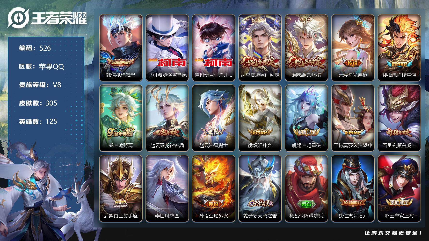 [13865687]苹果Q-V8-最强王者段位-125英雄-305皮肤-1典藏-0珍品无双-0无双-2珍品传说-14传说-91史诗