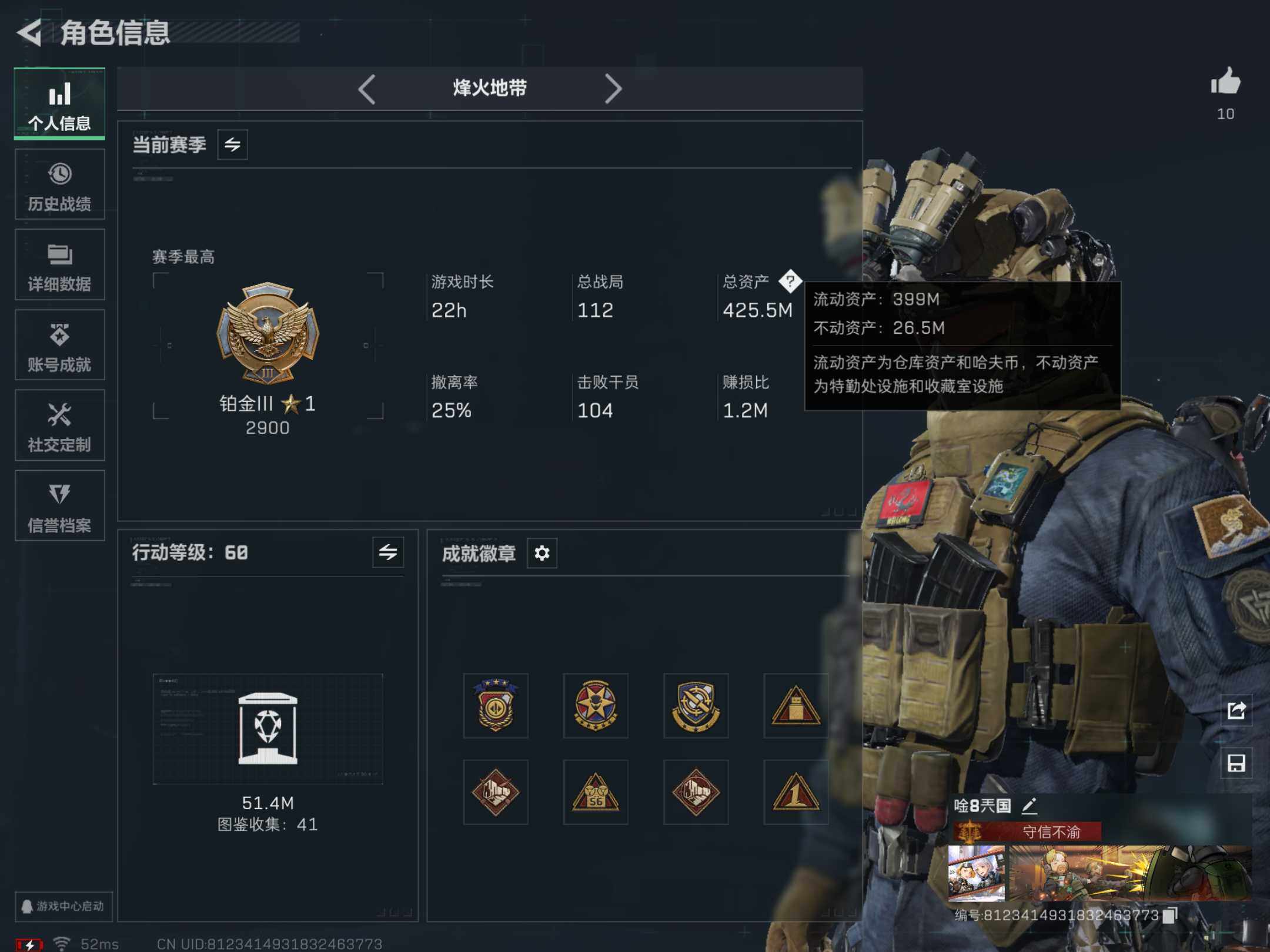 [13865697]【店主推荐捡漏号!可直接换绑】总资产425m 121188k哈伏币-398m流动资产-60烽火等级-铂金-19战场等级-列兵