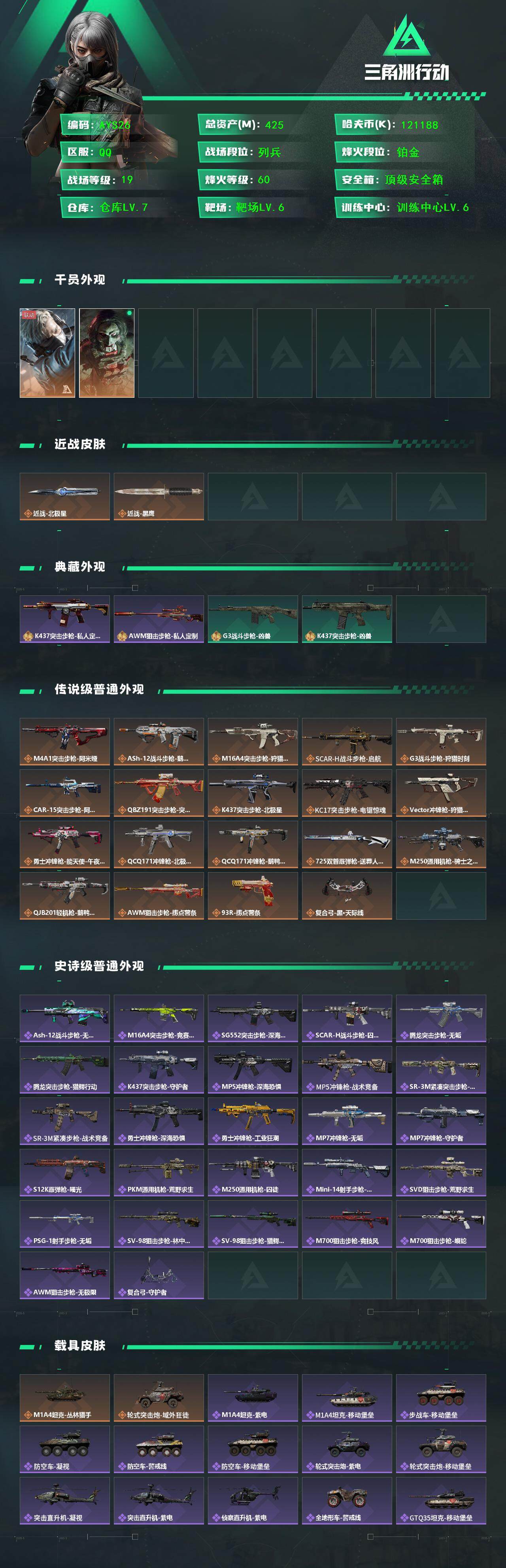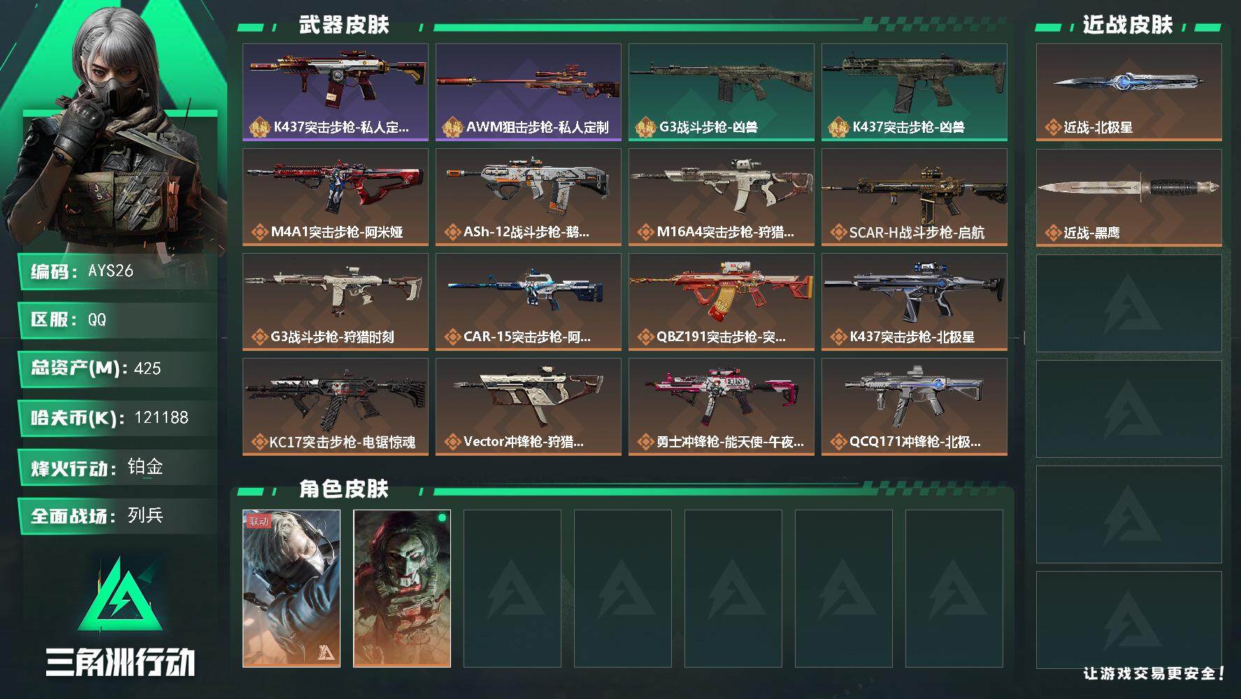 [13865697]【店主推荐捡漏号!可直接换绑】总资产425m 121188k哈伏币-398m流动资产-60烽火等级-铂金-19战场等级-列兵 【干员外观】:蜂医-送葬人·无题密令,红狼-电锯惊魂 【近战皮肤】:近战-北极星,近战-黑鹰 【典藏外观】:K437突击步枪-私人定制,AWM狙击步枪-私人定制,G3战斗步枪-凶兽,K437突击步枪-凶兽 【传说级普通外观】:M4A1突击步枪-阿米娅,ASh-12战斗步枪-鹅鸭杀,M16A4突击步枪-狩猎时刻,SCAR-H战斗步枪-启航,G3战斗步枪-狩猎时刻,CAR-15突击步枪-阿米娅,腾龙突击步枪-捞点薯条,K437突击步枪-北极星,KC17突击步枪-电锯惊魂,Vector冲锋枪-狩猎时刻,勇士冲锋枪-能天使-午夜邮差,QCQ171冲锋枪-北极星,QCQ171冲锋枪-鹅鸭杀,725双管霰弹枪-送葬人-无题密令,M250通用机枪-骑士之心,QJB201轻机枪-鹅鸭杀,AWM狙击步枪-捞点薯条,93R-捞点薯条,复合弓-黑·天际线 【史诗级普通外观】:ASh-12战斗步枪-无极限,M16A4突击步枪-竞赛选手,SG552突击步枪-深海恐惧,SCAR-H战斗步枪-囚徒,腾龙突击步枪-无垢,腾龙突击步枪-猎鳄行动,K437突击步枪-守护者,MP5冲锋枪-深海恐惧,MP5冲锋枪-战术竞备,SR-3M紧凑突击步枪-荒野求生,SR-3M紧凑突击步枪-战术竞备,勇士冲锋枪-深海恐惧,勇士冲锋枪-工业狂潮,MP7冲锋枪-无垢,MP7冲锋枪-守护者,S12K霰弹枪-曙光,PKM通用机枪-荒野求生,M250通用机枪-囚徒,Mini-14射手步枪-守护者,SVD狙击步枪-荒野求生,PSG-1射手步枪-无垢,SV-98狙击步枪-林中猎手,SV-98狙击步枪-猎鳄行动,M700狙击步枪-竞技风,M700狙击步枪-蝮蛇,AWM狙击步枪-无极限,复合弓-守护者 【稀有级普通外观】:K416突击步枪-虎啸,SCAR-H战斗步枪-荣耀列队,腾龙突击步枪-雪崩,MP5冲锋枪-弄臣,MP5冲锋枪-虎啸,SMG-45-行动开启,SMG-45冲锋枪-幻影结构,SR-3M紧凑突击步枪-雪崩,M1014霰弹枪-幻影结构,M250通用机枪-虎啸,Mini-14射手步枪-荣耀列队,SKS射手步枪-弄臣,SKS射手步枪-雪崩,SR-25射手步枪-开拓,SR-9射手步枪-街头涂鸦,PSG-