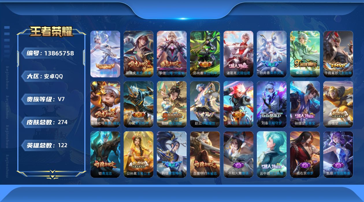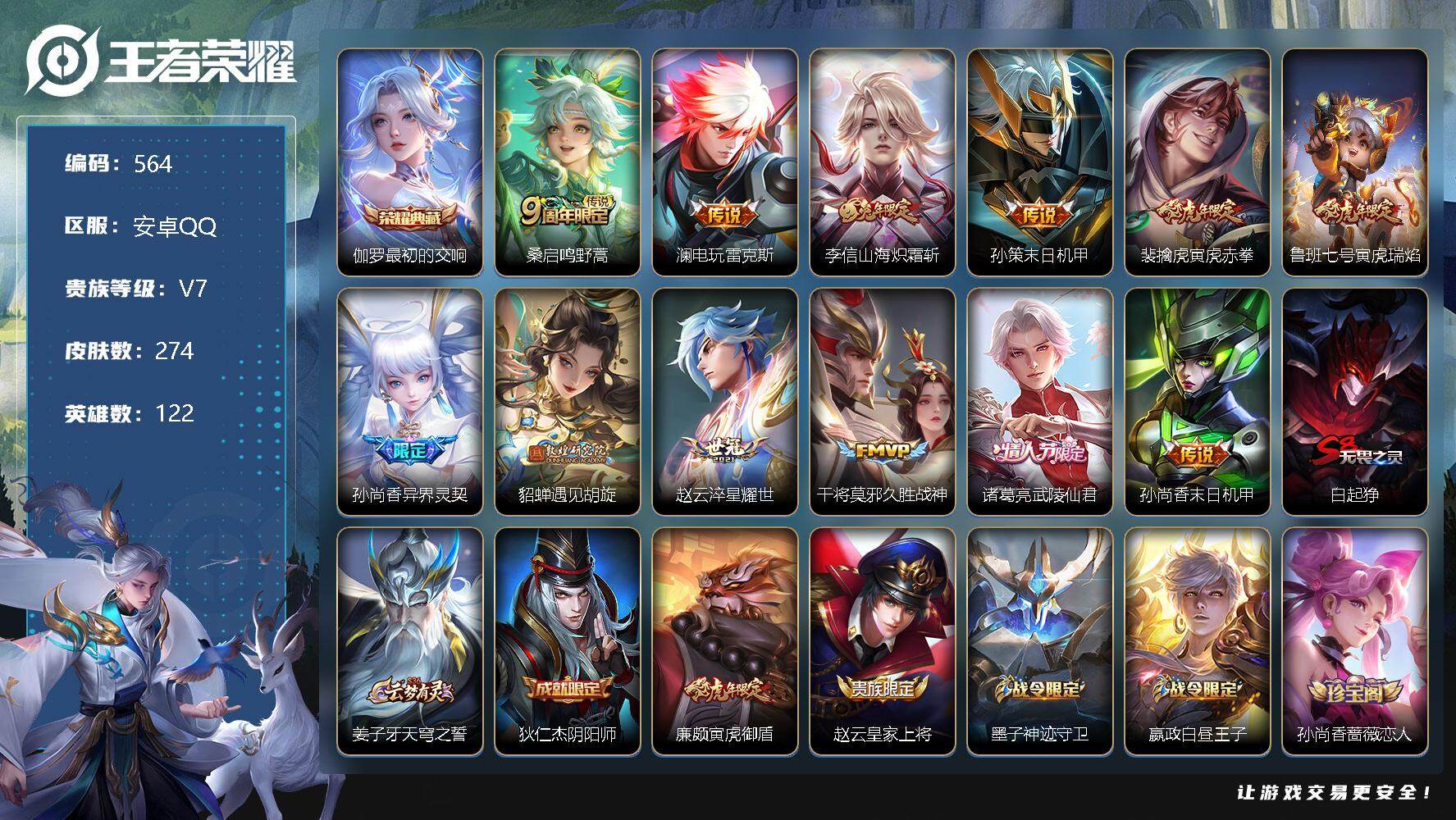 [13865758]安卓Q-V7-至尊星耀I段位-122英雄-274皮肤-1典藏-0珍品无双-0无双-0珍品传说-12传说-79史诗