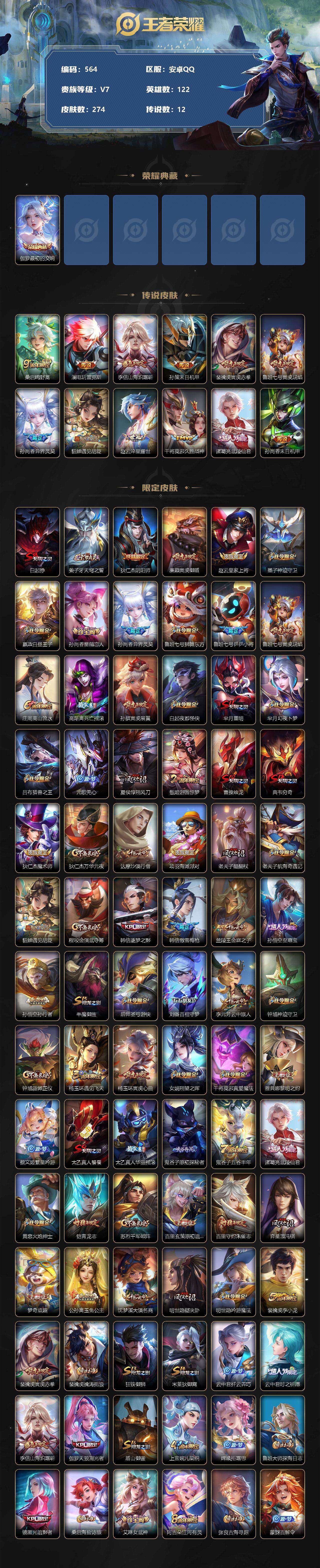 [13865758]安卓Q-V7-至尊星耀I段位-122英雄-274皮肤-1典藏-0珍品无双-0无双-0珍品传说-12传说-79史诗 【荣耀典藏】:伽罗最初的交响 【传说皮肤】:桑启鸣野蒿,澜电玩雷克斯,李信山海炽霜斩,孙策末日机甲,裴擒虎寅虎赤拳,鲁班七号寅虎瑞焰,孙尚香异界灵契,貂蝉遇见胡旋,赵云淬星耀世,干将莫邪久胜战神,诸葛亮武陵仙君,孙尚香末日机甲 【限定皮肤】:白起狰,姜子牙天穹之誓,狄仁杰阴阳师,廉颇寅虎御盾,赵云皇家上将,墨子神迹守卫,嬴政白昼王子,孙尚香蔷薇恋人,孙尚香异界灵契,鲁班七号狮舞东方,鲁班七号乒乒小将,鲁班七号寅虎瑞焰,庄周高山流水,高渐离死亡摇滚,孙膑寅虎展翼,白起夜都怪侠,芈月重明,芈月幻夜卜梦,吕布猎兽之王,元歌无心,夏侯惇朔风刀,甄姬游园惊梦,曹操烛龙,典韦穷奇,狄仁杰魔术师,狄仁杰万华元夜,达摩沙漠行僧,项羽海滩派对,老夫子醍醐杖,老夫子航海奇遇记,貂蝉遇见胡旋,程咬金演武夺筹,韩信逐梦之影,韩信傲雪梅枪,兰陵王金庭之子,孙悟空至尊宝,孙悟空孙行者,牛魔御旌,后羿圣弓游侠,刘备百相守梦,李元芳云中旅人,钟馗神迹守卫,钟馗驱傩正仪,杨玉环遇见飞天,杨玉环寅虎心曲,女娲朔望之晖,干将莫邪真爱魔法,雅典娜黎明之约,蔡文姬繁星吟游,太乙真人饕餮,太乙真人华丽摇滚,鬼谷子原初探秘者,鬼谷子五谷丰年,诸葛亮武陵仙君,黄忠火炮绅士,铠青龙志,苏烈千军破阵,百里玄策原初追逐者,百里守约朱雀志,弈星混沌棋,梦奇顽趣,公孙离玉兔公主,沈梦溪大漠名商,明世隐疑决卦,明世隐吟游魔法,裴擒虎李小龙,裴擒虎寅虎赤拳,裴擒虎擒涛扼浪,狂铁御狮,米莱狄御霄,云中君纤云弄巧,云中君时之祈愿,李信山海炽霜斩,伽罗天狼溯光者,盾山御銮,上官婉儿梁祝,嫦娥拒霜思,鲁班大师探海日志,镜匿光追影者,桑启海盐诗旅,艾琳女武神,阿古朵江河有灵,张良古海寻踪,蒙犽百解令,鬼谷子天穹祈灯,刘邦剑破天穹,程咬金群星魔术团 【年限皮肤】:百里守约朱雀志,铠青龙志,裴擒虎寅虎赤拳,孙膑寅虎展翼,鲁班七号寅虎瑞焰,杨玉环寅虎心曲,廉颇寅虎御盾,李信山海炽霜斩 【赛季限定】:白起狰,芈月重明,夏侯惇朔风刀,曹操烛龙,典韦穷奇,狄仁杰万华元夜,达摩沙漠行僧,老夫子醍醐杖,程咬金演武夺筹,兰陵王金庭之子,张良古海寻踪,牛魔御旌,李元芳云中旅人,钟馗驱傩正仪,雅典娜黎明之约,太乙真人饕餮,鬼谷子原初探秘者,苏烈