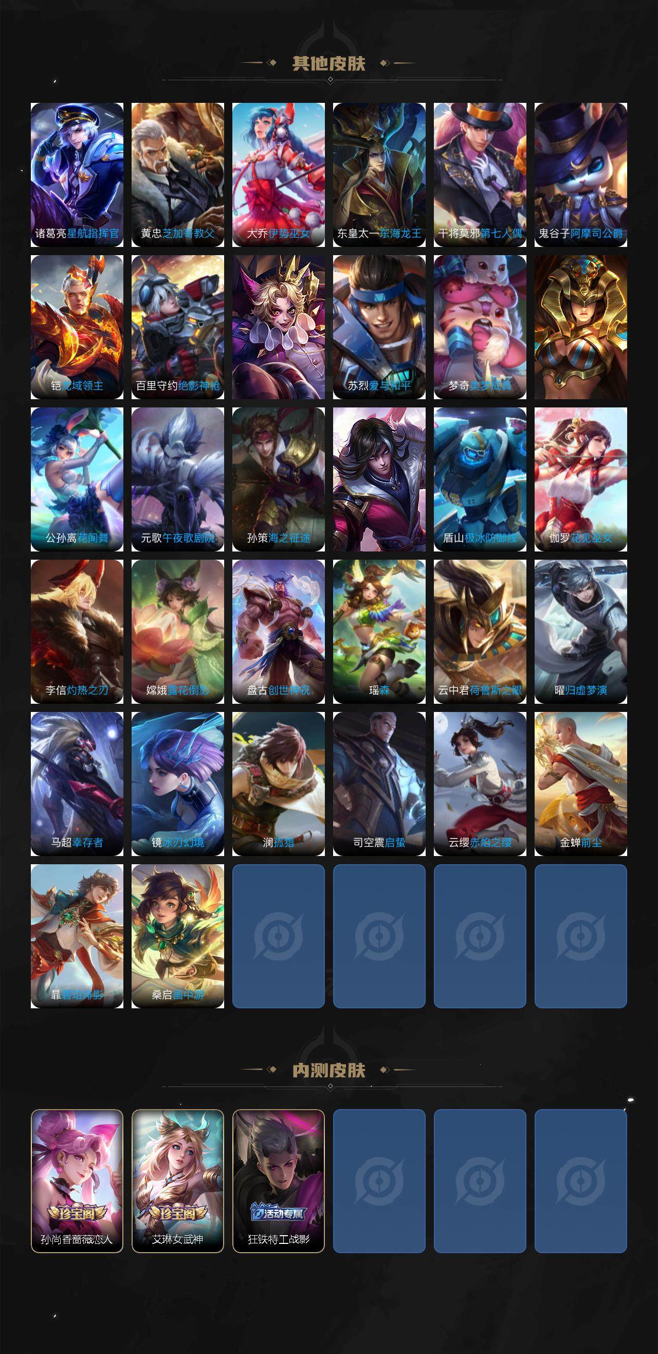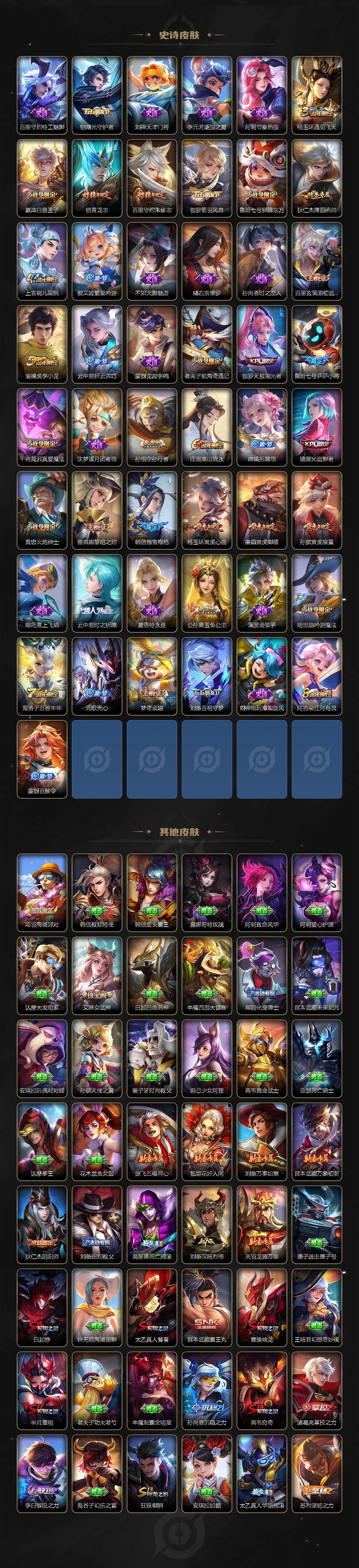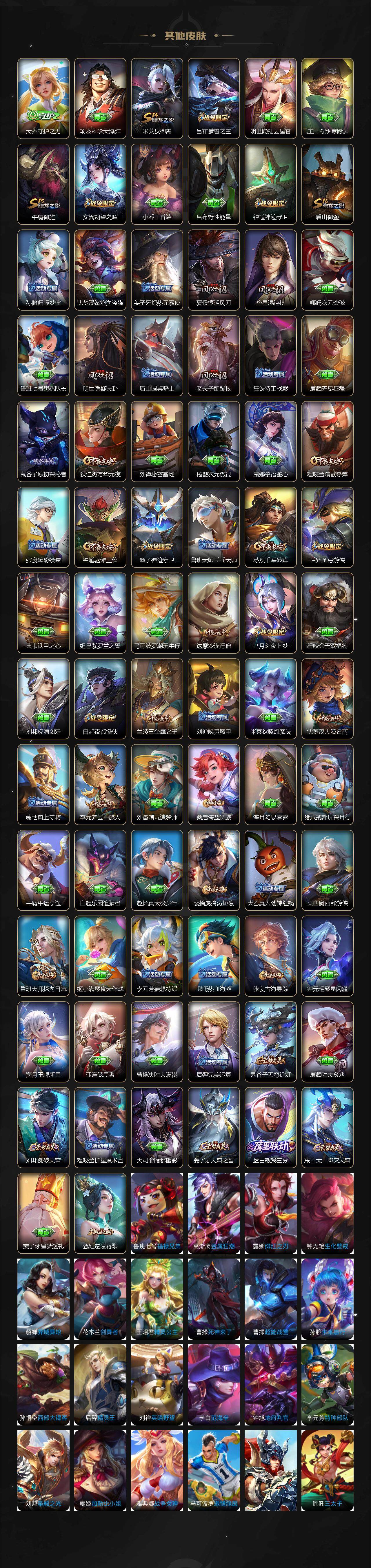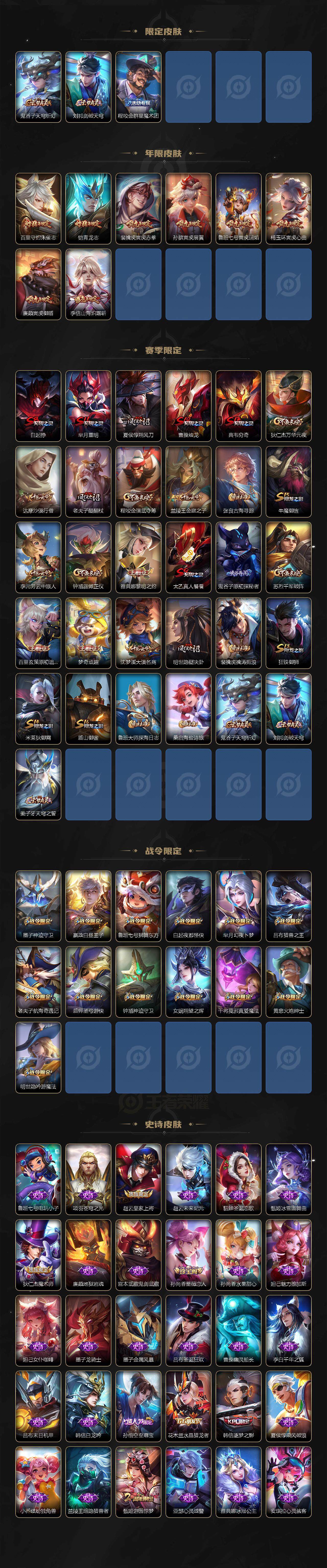 【限定皮肤】:白起狰,姜子牙天穹之誓,狄仁杰阴阳师,廉颇寅虎御盾,赵云皇家上将,墨子神迹守卫,嬴政白昼王子,孙尚香蔷薇恋人,孙尚香异界灵契,鲁班七号狮舞东方,鲁班七号乒乒小将,鲁班七号寅虎瑞焰,庄周高山流水,高渐离死亡摇滚,孙膑寅虎展翼,白起夜都怪侠,芈月重明,芈月幻夜卜梦,吕布猎兽之王,元歌无心,夏侯惇朔风刀,甄姬游园惊梦,曹操烛龙,典韦穷奇,狄仁杰魔术师,狄仁杰万华元夜,达摩沙漠行僧,项羽海滩派对,老夫子醍醐杖,老夫子航海奇遇记,貂蝉遇见胡旋,程咬金演武夺筹,韩信逐梦之影,韩信傲雪梅枪,兰陵王金庭之子,孙悟空至尊宝,孙悟空孙行者,牛魔御旌,后羿圣弓游侠,刘备百相守梦,李元芳云中旅人,钟馗神迹守卫,钟馗驱傩正仪,杨玉环遇见飞天,杨玉环寅虎心曲,女娲朔望之晖,干将莫邪真爱魔法,雅典娜黎明之约,蔡文姬繁星吟游,太乙真人饕餮,太乙真人华丽摇滚,鬼谷子原初探秘者,鬼谷子五谷丰年,诸葛亮武陵仙君,黄忠火炮绅士,铠青龙志,苏烈千军破阵,百里玄策原初追逐者,百里守约朱雀志,弈星混沌棋,梦奇顽趣,公孙离玉兔公主,沈梦溪大漠名商,明世隐疑决卦,明世隐吟游魔法,裴擒虎李小龙,裴擒虎寅虎赤拳,裴擒虎擒涛扼浪,狂铁御狮,米莱狄御霄,云中君纤云弄巧,云中君时之祈愿,李信山海炽霜斩,伽罗天狼溯光者,盾山御銮,上官婉儿梁祝,嫦娥拒霜思,鲁班大师探海日志,镜匿光追影者,桑启海盐诗旅,艾琳女武神,阿古朵江河有灵,张良古海寻踪,蒙犽百解令,鬼谷子天穹祈灯,刘邦剑破天穹,程咬金群星魔术团