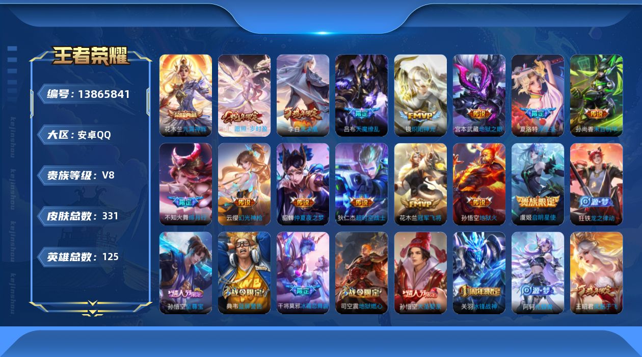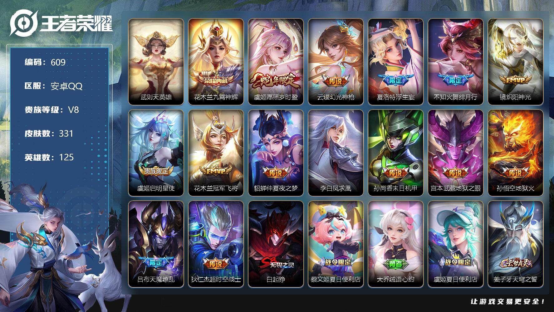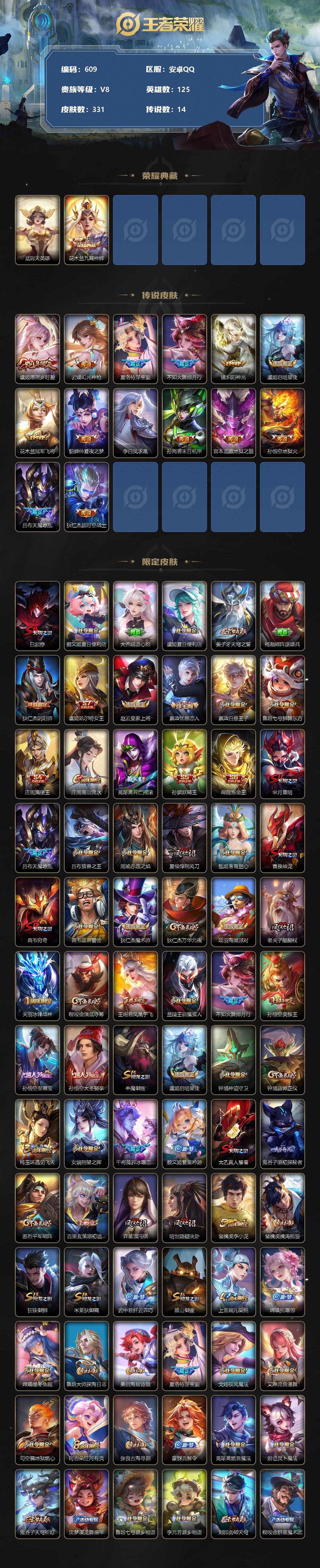 [13865841]安卓Q-V8-永恒钻石IV段位-125英雄-331皮肤-1典藏-0珍品无双-0无双-0珍品传说-14传说-81史诗 【荣耀典藏】:武则天英雄,花木兰九霄神辉 【传说皮肤】:虞姬愿照岁时盈,云缨幻光神枪,夏洛特浮生妄,不知火舞绯月行,镜炽阳神光,虞姬启明星使,花木兰冠军飞将,貂蝉仲夏夜之梦,李白凤求凰,孙尚香末日机甲,宫本武藏地狱之眼,孙悟空地狱火,吕布天魔缭乱,狄仁杰超时空战士 【限定皮肤】:白起狰,蔡文姬夏日便利店,大乔绒语心约,虞姬夏日便利店,姜子牙天穹之誓,杨戬破阵退雄兵,狄仁杰阴阳师,虞姬凯尔特女王,赵云皇家上将,嬴政优雅恋人,嬴政白昼王子,鲁班七号狮舞东方,庄周蜃楼王,庄周高山流水,高渐离死亡摇滚,孙膑妖精王,扁鹊炼金王,芈月重明,吕布天魔缭乱,吕布猎兽之王,周瑜赤莲之焰,夏侯惇朔风刀,甄姬落雪兰心,曹操烛龙,典韦穷奇,典韦蓝屏警告,狄仁杰魔术师,狄仁杰万华元夜,项羽海滩派对,老夫子醍醐杖,关羽冰锋战神,程咬金演武夺筹,王昭君凤凰于飞,兰陵王驯魔猎人,不知火舞绯月行,孙悟空美猴王,孙悟空至尊宝,孙悟空大圣娶亲,牛魔御旌,虞姬启明星使,钟馗神迹守卫,钟馗驱傩正仪,杨玉环遇见飞天,女娲朔望之晖,干将莫邪冰霜恋舞曲,蔡文姬繁星吟游,太乙真人饕餮,鬼谷子原初探秘者,苏烈千军破阵,百里玄策原初追逐者,弈星混沌棋,明世隐疑决卦,裴擒虎李小龙,裴擒虎擒涛扼浪,狂铁御狮,米莱狄御霄,云中君纤云弄巧,盾山御銮,上官婉儿梁祝,嫦娥拒霜思,嫦娥暖冬兔眠,鲁班大师探海日志,桑启海盐诗旅,夏洛特浮生妄,戈娅驭风魔法,艾琳流音漫舞,司空震地狱燃心,阿古朵江河有灵,张良古海寻踪,蒙犽百解令,高渐离燃音魔法,妲己灵卜魔法,鬼谷子天穹祈灯,沈梦溪龙舞盛年,鲁班七号蔬乡物语,李元芳蔬乡物语,刘邦剑破天穹,程咬金群星魔术团,镜青焰无极,项羽苍威无极,刘备异域游侠,周瑜熔金海岸 【年限皮肤】:孙悟空美猴王,王昭君凤凰于飞,李白凤求凰 【赛季限定】:庄周蜃楼王,孙膑妖精王,扁鹊炼金王,白起狰,芈月重明,夏侯惇朔风刀,曹操烛龙,典韦穷奇,狄仁杰万华元夜,老夫子醍醐杖,程咬金演武夺筹,张良古海寻踪,牛魔御旌,虞姬凯尔特女王,钟馗驱傩正仪,太乙真人饕餮,鬼谷子原初探秘者,苏烈千军破阵,百里玄策原初追逐者,弈星混沌棋,明世隐疑决卦,裴擒虎擒涛扼浪,狂铁御狮,米莱狄御霄,盾山御銮,鲁班大师探海日志,桑启海