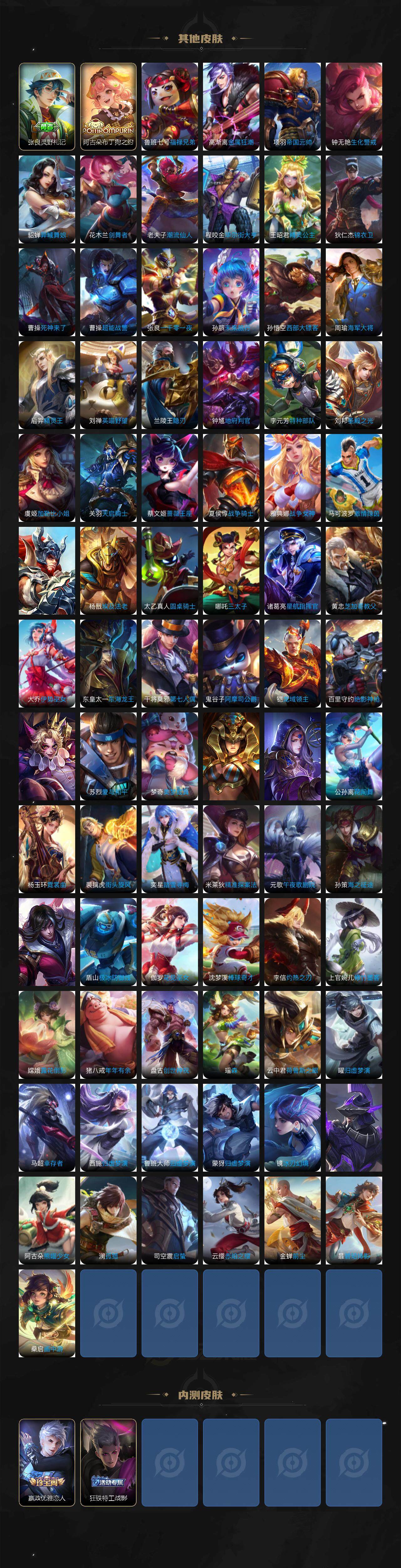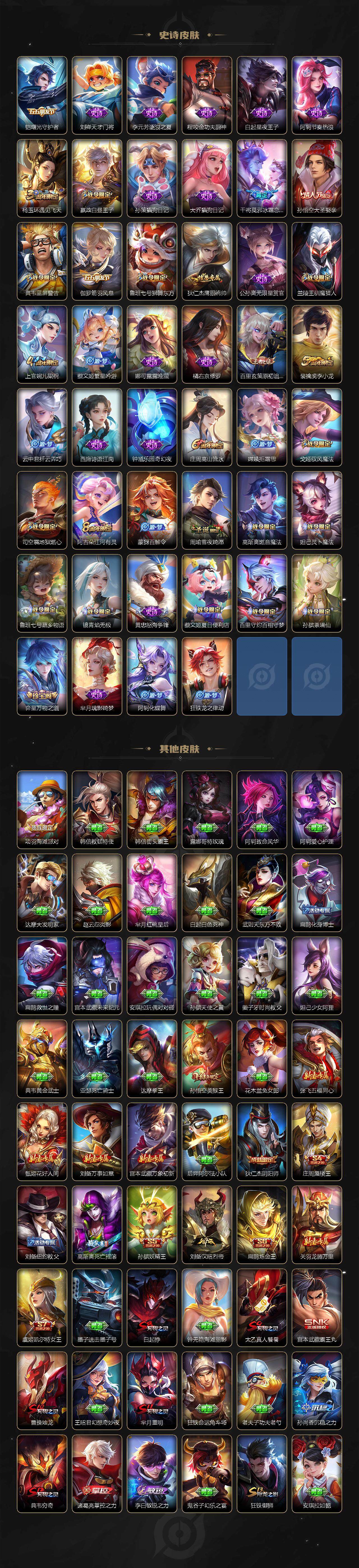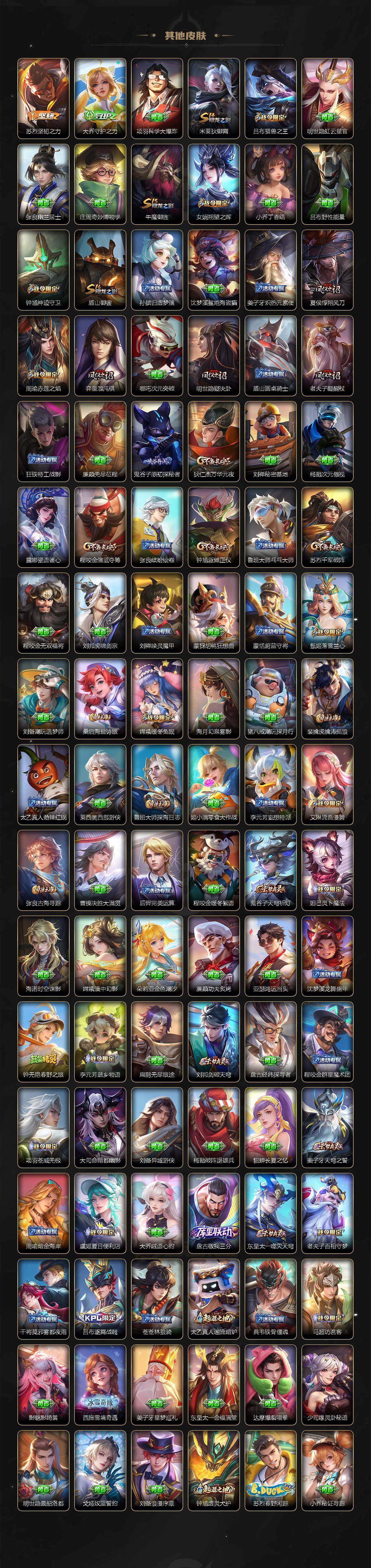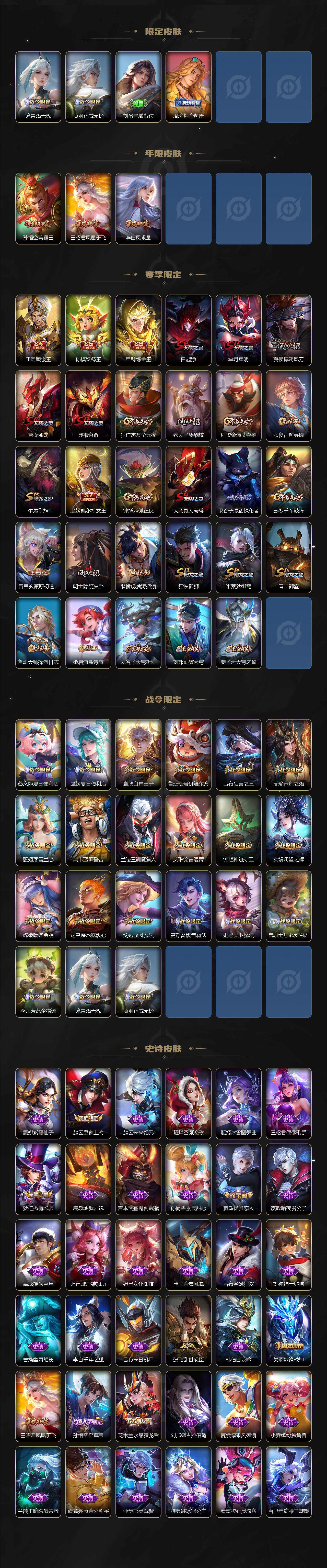 【限定皮肤】:白起狰,蔡文姬夏日便利店,大乔绒语心约,虞姬夏日便利店,姜子牙天穹之誓,杨戬破阵退雄兵,狄仁杰阴阳师,虞姬凯尔特女王,赵云皇家上将,嬴政优雅恋人,嬴政白昼王子,鲁班七号狮舞东方,庄周蜃楼王,庄周高山流水,高渐离死亡摇滚,孙膑妖精王,扁鹊炼金王,芈月重明,吕布天魔缭乱,吕布猎兽之王,周瑜赤莲之焰,夏侯惇朔风刀,甄姬落雪兰心,曹操烛龙,典韦穷奇,典韦蓝屏警告,狄仁杰魔术师,狄仁杰万华元夜,项羽海滩派对,老夫子醍醐杖,关羽冰锋战神,程咬金演武夺筹,王昭君凤凰于飞,兰陵王驯魔猎人,不知火舞绯月行,孙悟空美猴王,孙悟空至尊宝,孙悟空大圣娶亲,牛魔御旌,虞姬启明星使,钟馗神迹守卫,钟馗驱傩正仪,杨玉环遇见飞天,女娲朔望之晖,干将莫邪冰霜恋舞曲,蔡文姬繁星吟游,太乙真人饕餮,鬼谷子原初探秘者,苏烈千军破阵,百里玄策原初追逐者,弈星混沌棋,明世隐疑决卦,裴擒虎李小龙,裴擒虎擒涛扼浪,狂铁御狮,米莱狄御霄,云中君纤云弄巧,盾山御銮,上官婉儿梁祝,嫦娥拒霜思,嫦娥暖冬兔眠,鲁班大师探海日志,桑启海盐诗旅,夏洛特浮生妄,戈娅驭风魔法,艾琳流音漫舞,司空震地狱燃心,阿古朵江河有灵,张良古海寻踪,蒙犽百解令,高渐离燃音魔法,妲己灵卜魔法,鬼谷子天穹祈灯,沈梦溪龙舞盛年,鲁班七号蔬乡物语,李元芳蔬乡物语,刘邦剑破天穹,程咬金群星魔术团,镜青焰无极,项羽苍威无极,刘备异域游侠,周瑜熔金海岸