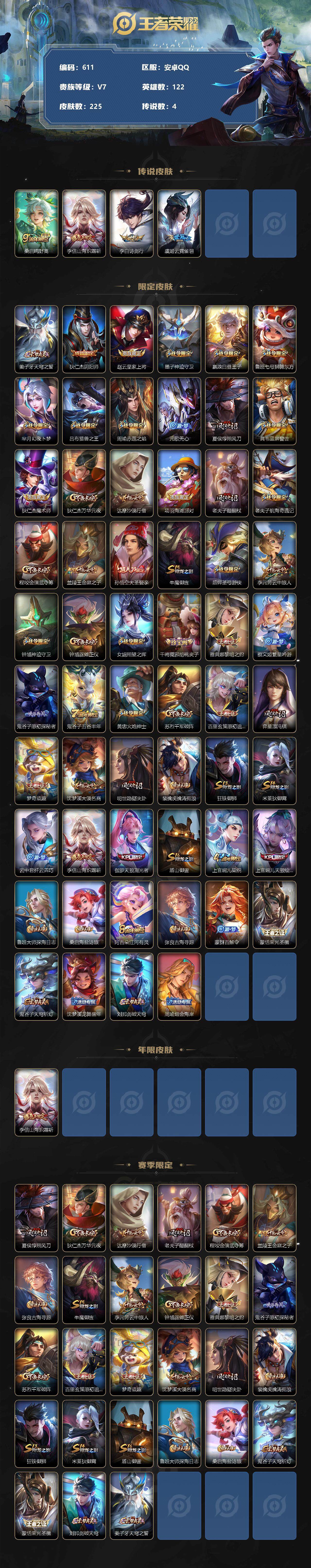 [13865854]安卓Q-V7-至尊星耀IV段位-122英雄-225皮肤-0典藏-0珍品无双-0无双-0珍品传说-4传说-50史诗