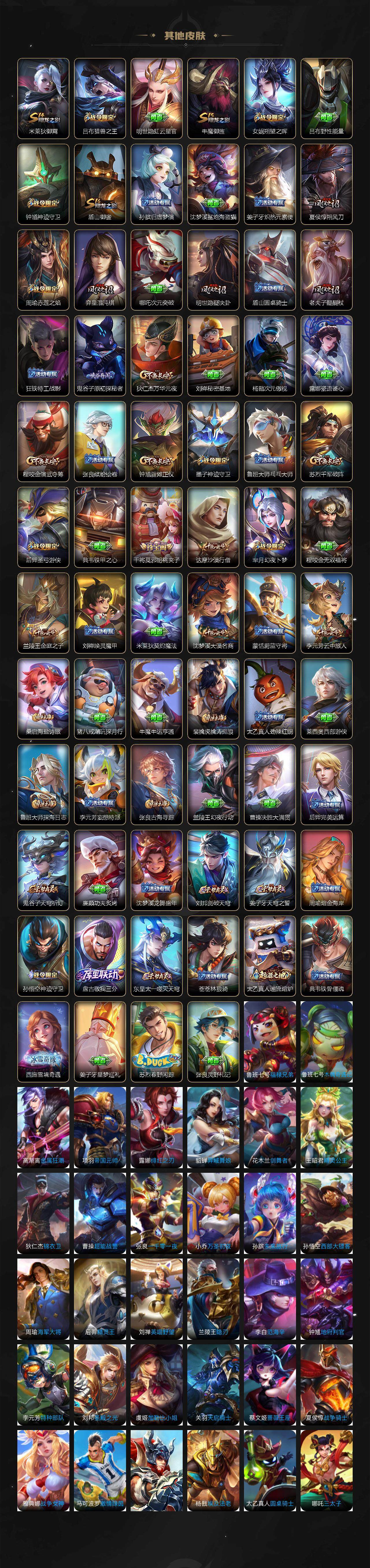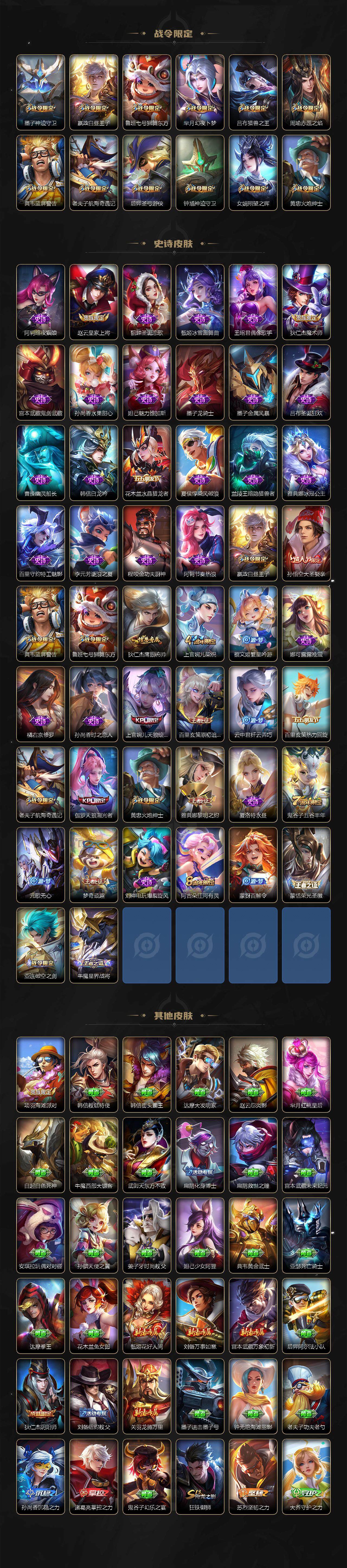 【限定皮肤】:姜子牙天穹之誓,狄仁杰阴阳师,赵云皇家上将,墨子神迹守卫,嬴政白昼王子,鲁班七号狮舞东方,芈月幻夜卜梦,吕布猎兽之王,周瑜赤莲之焰,元歌无心,夏侯惇朔风刀,典韦蓝屏警告,狄仁杰魔术师,狄仁杰万华元夜,达摩沙漠行僧,项羽海滩派对,老夫子醍醐杖,老夫子航海奇遇记,程咬金演武夺筹,兰陵王金庭之子,孙悟空大圣娶亲,牛魔御旌,后羿圣弓游侠,李元芳云中旅人,钟馗神迹守卫,钟馗驱傩正仪,女娲朔望之晖,干将莫邪胡桃夹子,雅典娜黎明之约,蔡文姬繁星吟游,鬼谷子原初探秘者,鬼谷子五谷丰年,黄忠火炮绅士,苏烈千军破阵,百里玄策原初追逐者,弈星混沌棋,梦奇顽趣,沈梦溪大漠名商,明世隐疑决卦,裴擒虎擒涛扼浪,狂铁御狮,米莱狄御霄,云中君纤云弄巧,李信山海炽霜斩,伽罗天狼溯光者,盾山御銮,上官婉儿梁祝,上官婉儿天狼绘梦者,鲁班大师探海日志,桑启海盐诗旅,阿古朵江河有灵,张良古海寻踪,蒙犽百解令,蒙恬荣光圣徽,鬼谷子天穹祈灯,沈梦溪龙舞盛年,刘邦剑破天穹,周瑜熔金海岸