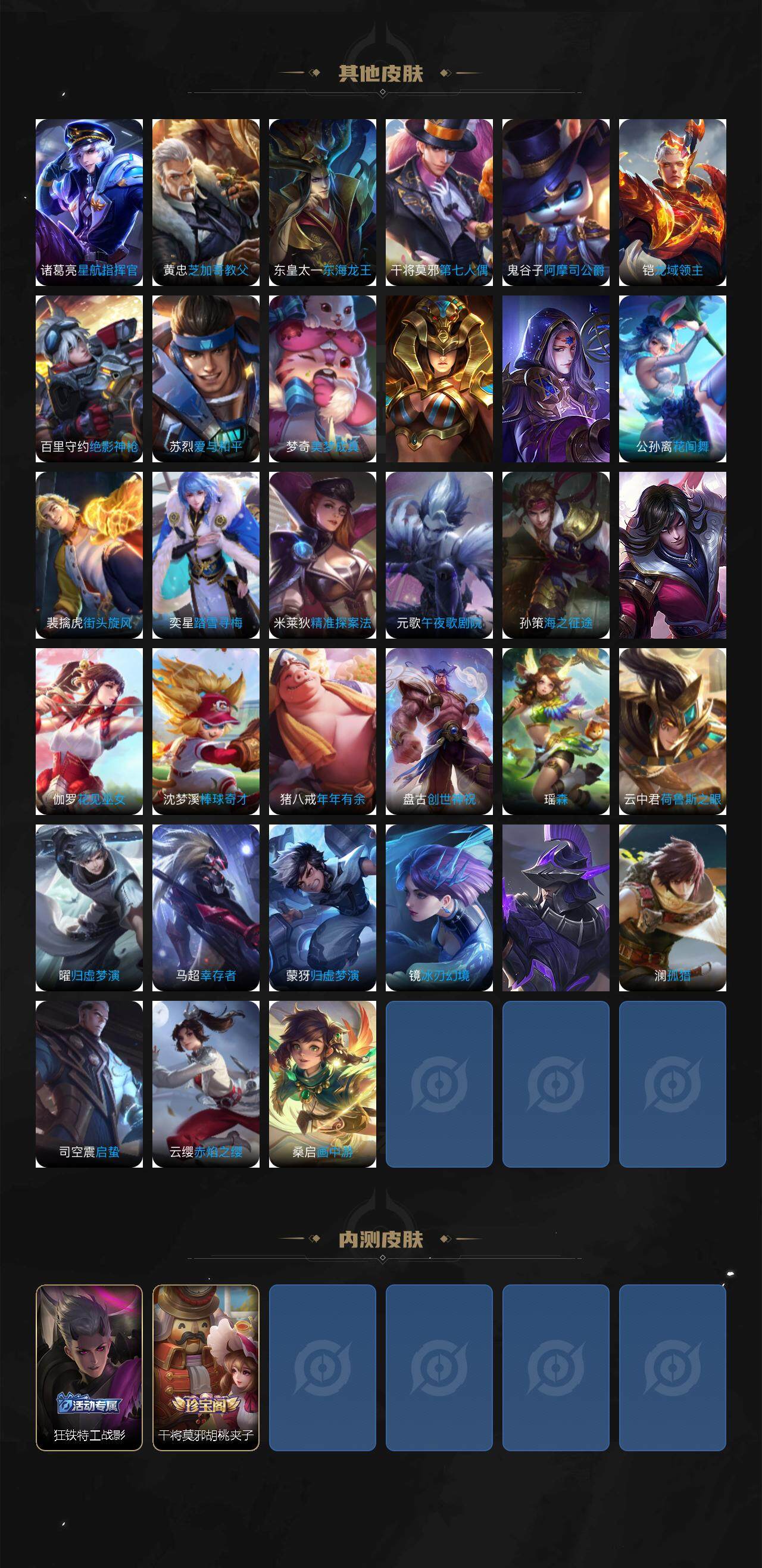 狂铁御狮,米莱狄御霄,牛魔御旌,盾山御銮,夏侯惇朔风刀,明世隐疑决卦,老夫子醍醐杖,鬼谷子原初探秘者,狄仁杰万华元夜,程咬金演武夺筹,钟馗驱傩正仪,苏烈千军破阵,吕布猎兽之王,嬴政白昼王子,女娲朔望之晖,典韦蓝屏警告,钟馗神迹守卫,鲁班七号狮舞东方,弈星混沌棋,达摩沙漠行僧,兰陵王金庭之子,沈梦溪大漠名商,李元芳云中旅人,桑启海盐诗旅,裴擒虎擒涛扼浪,鲁班大师探海日志,张良古海寻踪