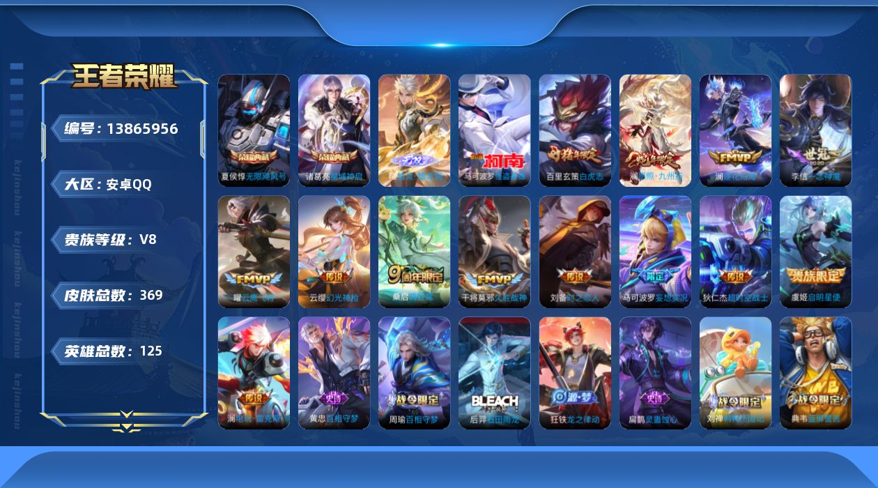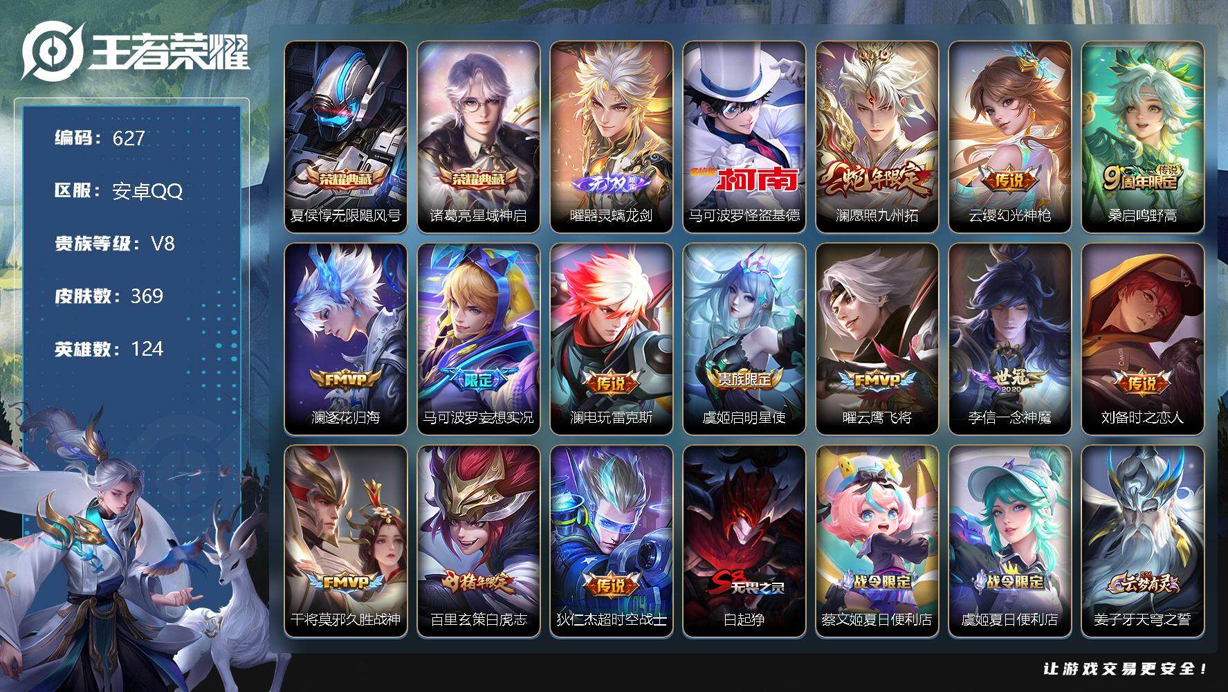 [13865956]安卓Q-V8-最强王者段位-124英雄-369皮肤-2典藏-0珍品无双-1无双-1珍品传说-13传说-110史诗