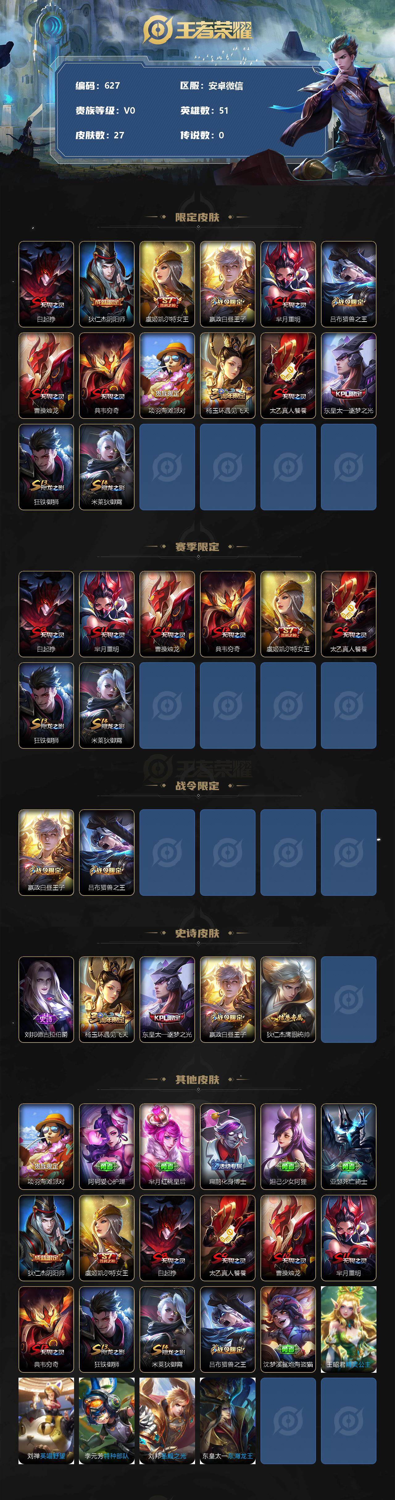 - [11522480]实名: 可修改 贵族等级: V9 英雄数: 125 皮肤数: 261 荣耀水晶: 鸣剑·曳影 无双皮: 器灵·螭龙剑 传说皮: 绛天战甲,炽阳神光,一念神魔,云霓雀翎,末日机甲-孙尚香,地狱火,零号·赤焰,地狱之眼,时之恋人-刘备,无双飞将,山海·炽霜斩,山海·苍雷引,妄想实况,鹤归松栖(云缨),幻光神枪,祥瑞亨通 限定皮: 李小龙,祈雪灵祝,梁祝,御风骁将,时雨天司,龙胆,烈魂,白晶晶,飞衡,凤求凰,至尊宝,默契交锋-兰陵王,默契交锋-花木兰,深海之息,枫霜尽,五谷丰年,诗剑行,山海·玄木吟,鸣野蒿,愿照·九州拓