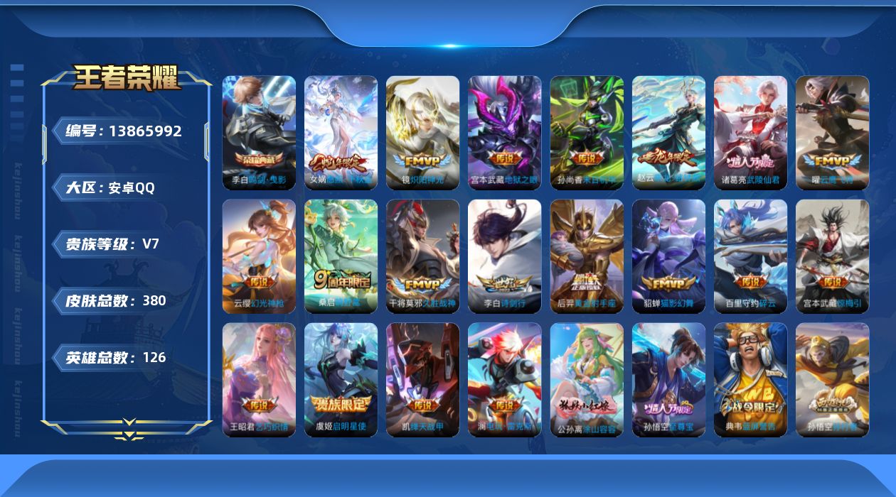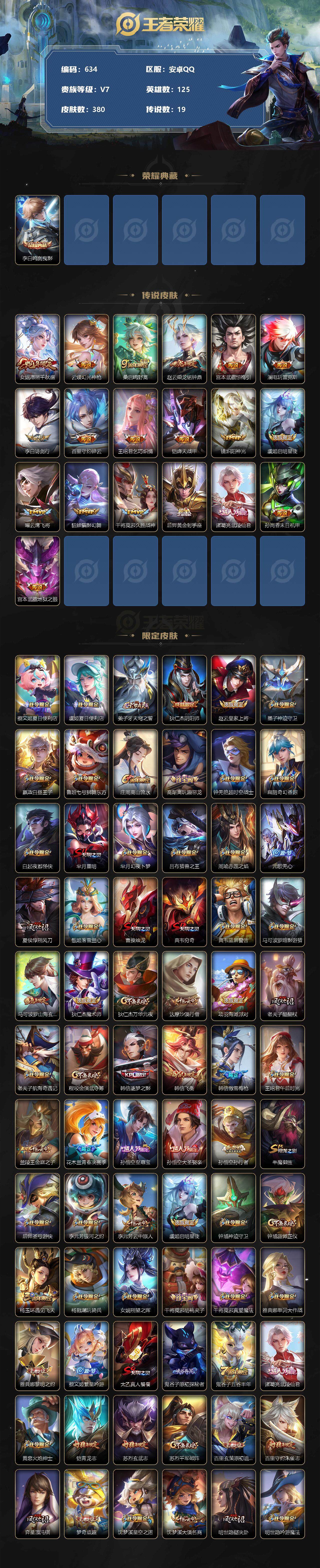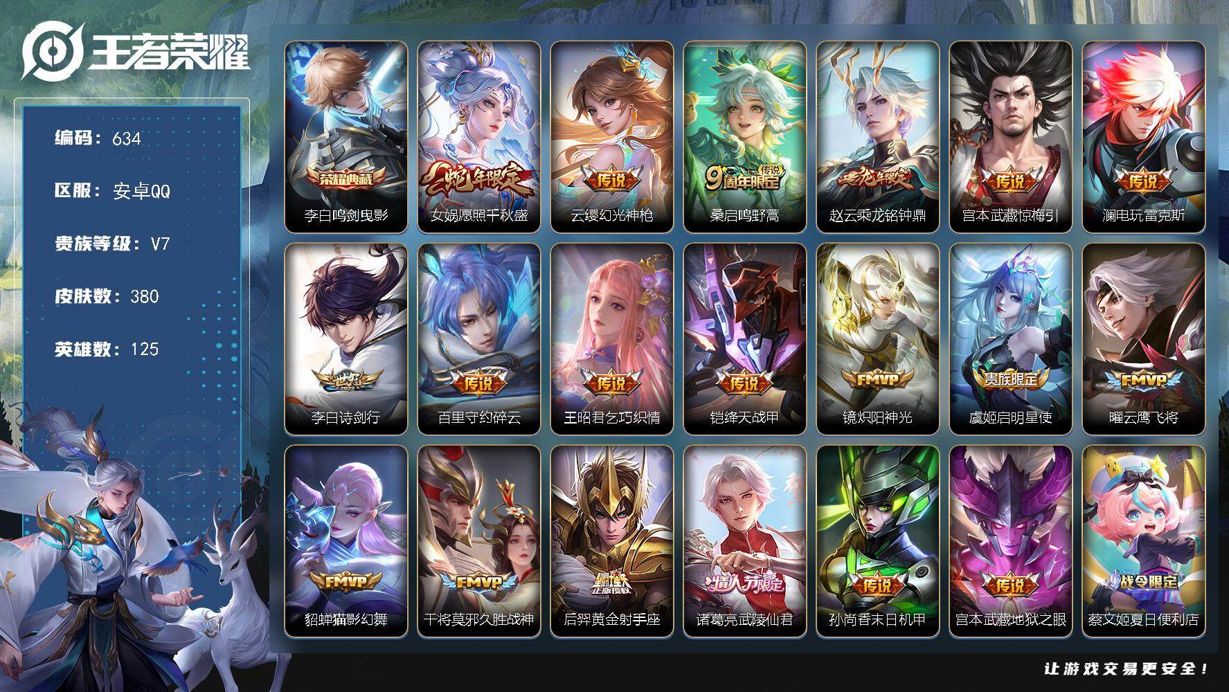 [13865992]安卓Q-V7-永恒钻石I段位-125英雄-380皮肤-1典藏-0珍品无双-0无双-0珍品传说-19传说-107史诗 【荣耀典藏】:李白鸣剑曳影 【传说皮肤】:女娲愿照千秋盛,云缨幻光神枪,桑启鸣野蒿,赵云乘龙铭钟鼎,宫本武藏惊梅引,澜电玩雷克斯,李白诗剑行,百里守约碎云,王昭君乞巧织情,铠绛天战甲,镜炽阳神光,虞姬启明星使,曜云鹰飞将,貂蝉猫影幻舞,干将莫邪久胜战神,后羿黄金射手座,诸葛亮武陵仙君,孙尚香末日机甲,宫本武藏地狱之眼 【限定皮肤】:蔡文姬夏日便利店,虞姬夏日便利店,姜子牙天穹之誓,狄仁杰阴阳师,赵云皇家上将,墨子神迹守卫,嬴政白昼王子,鲁班七号狮舞东方,庄周高山流水,高渐离玩趣恶龙,钟无艳超时空战士,扁鹊奇幻香踪,白起夜都怪侠,芈月重明,芈月幻夜卜梦,吕布猎兽之王,周瑜赤莲之焰,元歌无心,夏侯惇朔风刀,甄姬落雪兰心,曹操烛龙,典韦穷奇,典韦蓝屏警告,马可波罗暗影游猎,马可波罗山海玄木吟,狄仁杰魔术师,狄仁杰万华元夜,达摩沙漠行僧,项羽海滩派对,老夫子醍醐杖,老夫子航海奇遇记,程咬金演武夺筹,韩信逐梦之影,韩信飞衡,韩信傲雪梅枪,王昭君午后时光,兰陵王金庭之子,花木兰青春决赛季,孙悟空至尊宝,孙悟空大圣娶亲,孙悟空孙行者,牛魔御旌,后羿圣弓游侠,李元芳银河之约,李元芳云中旅人,虞姬启明星使,钟馗神迹守卫,钟馗驱傩正仪,杨玉环遇见飞天,杨戬潮玩骑兵,女娲朔望之晖,干将莫邪胡桃夹子,干将莫邪真爱魔法,雅典娜单词大作战,雅典娜黎明之约,蔡文姬繁星吟游,太乙真人饕餮,鬼谷子原初探秘者,鬼谷子五谷丰年,诸葛亮武陵仙君,黄忠火炮绅士,铠青龙志,苏烈玄武志,苏烈千军破阵,百里玄策原初追逐者,百里守约朱雀志,弈星混沌棋,梦奇顽趣,沈梦溪星空之诺,沈梦溪大漠名商,明世隐疑决卦,明世隐吟游魔法,裴擒虎李小龙,裴擒虎擒涛扼浪,狂铁御狮,狂铁电玩高手,米莱狄御霄,云中君纤云弄巧,盾山御銮,猪八戒西部大镖客,猪八戒猪悟能,上官婉儿梁祝,嫦娥拒霜思,嫦娥暖冬兔眠,西施玲珑珍味,蒙犽狂想玩偶喵,鲁班大师探海日志,镜匿光追影者,桑启海盐诗旅,暃星界游侠,戈娅驭风魔法,艾琳女武神,艾琳流音漫舞,司空震地狱燃心,阿古朵江河有灵,张良古海寻踪,蒙犽百解令,蒙恬荣光圣徽,高渐离燃音魔法,妲己灵卜魔法,鬼谷子天穹祈灯,赵云乘龙铭钟鼎,沈梦溪龙舞盛年,刘邦剑破天穹,程咬金群星魔术团,周瑜熔金海岸
