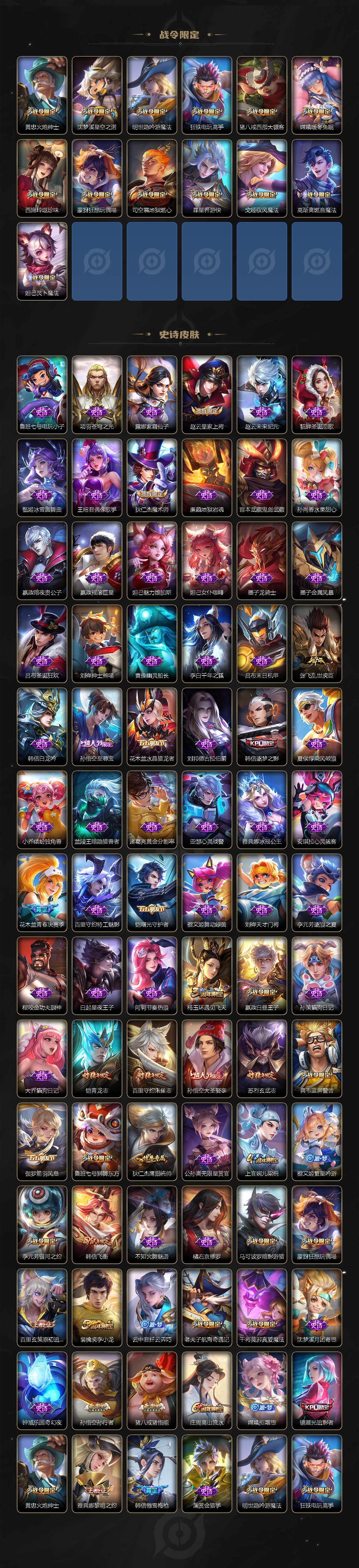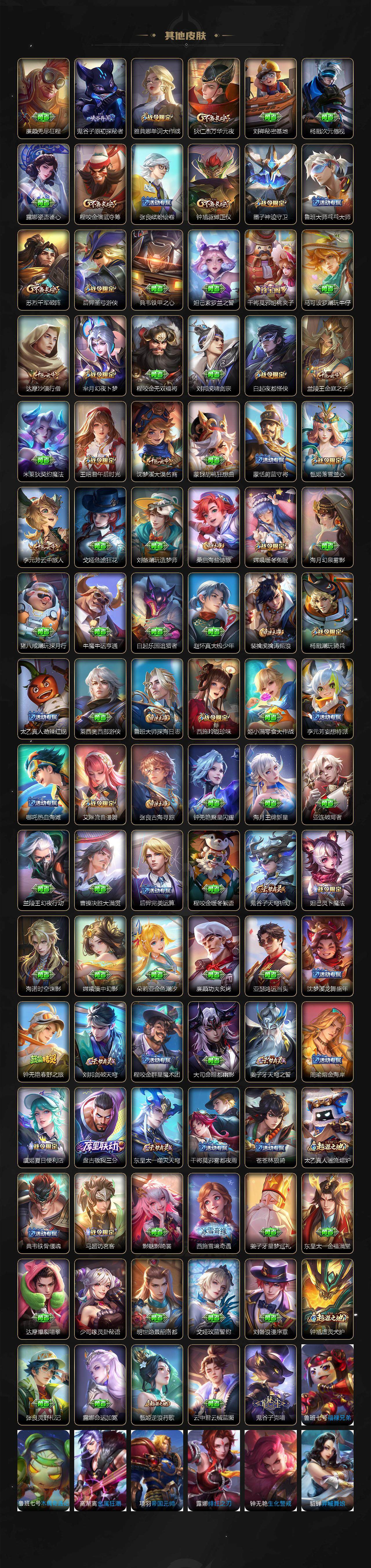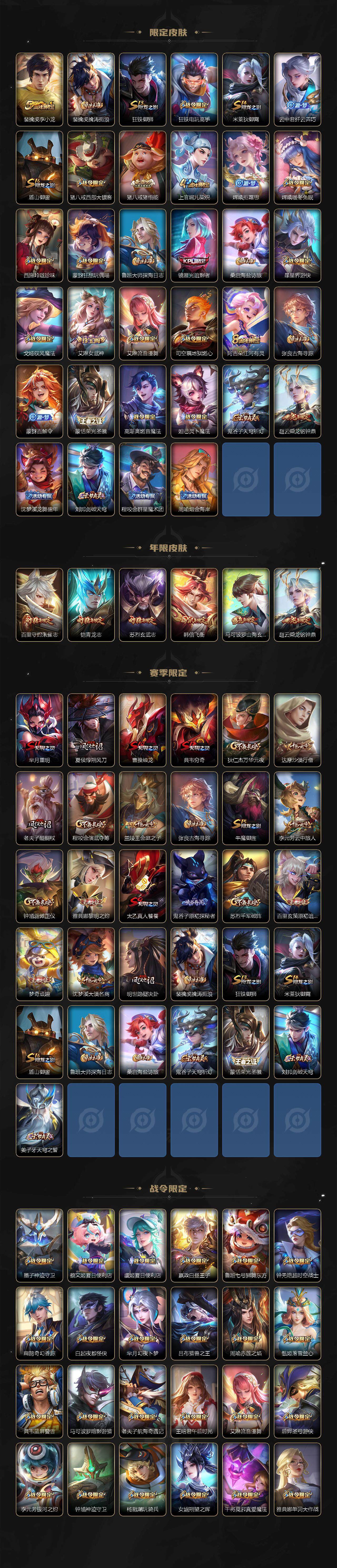 【限定皮肤】:蔡文姬夏日便利店,虞姬夏日便利店,姜子牙天穹之誓,狄仁杰阴阳师,赵云皇家上将,墨子神迹守卫,嬴政白昼王子,鲁班七号狮舞东方,庄周高山流水,高渐离玩趣恶龙,钟无艳超时空战士,扁鹊奇幻香踪,白起夜都怪侠,芈月重明,芈月幻夜卜梦,吕布猎兽之王,周瑜赤莲之焰,元歌无心,夏侯惇朔风刀,甄姬落雪兰心,曹操烛龙,典韦穷奇,典韦蓝屏警告,马可波罗暗影游猎,马可波罗山海玄木吟,狄仁杰魔术师,狄仁杰万华元夜,达摩沙漠行僧,项羽海滩派对,老夫子醍醐杖,老夫子航海奇遇记,程咬金演武夺筹,韩信逐梦之影,韩信飞衡,韩信傲雪梅枪,王昭君午后时光,兰陵王金庭之子,花木兰青春决赛季,孙悟空至尊宝,孙悟空大圣娶亲,孙悟空孙行者,牛魔御旌,后羿圣弓游侠,李元芳银河之约,李元芳云中旅人,虞姬启明星使,钟馗神迹守卫,钟馗驱傩正仪,杨玉环遇见飞天,杨戬潮玩骑兵,女娲朔望之晖,干将莫邪胡桃夹子,干将莫邪真爱魔法,雅典娜单词大作战,雅典娜黎明之约,蔡文姬繁星吟游,太乙真人饕餮,鬼谷子原初探秘者,鬼谷子五谷丰年,诸葛亮武陵仙君,黄忠火炮绅士,铠青龙志,苏烈玄武志,苏烈千军破阵,百里玄策原初追逐者,百里守约朱雀志,弈星混沌棋,梦奇顽趣,沈梦溪星空之诺,沈梦溪大漠名商,明世隐疑决卦,明世隐吟游魔法,裴擒虎李小龙,裴擒虎擒涛扼浪,狂铁御狮,狂铁电玩高手,米莱狄御霄,云中君纤云弄巧,盾山御銮,猪八戒西部大镖客,猪八戒猪悟能,上官婉儿梁祝,嫦娥拒霜思,嫦娥暖冬兔眠,西施玲珑珍味,蒙犽狂想玩偶喵,鲁班大师探海日志,镜匿光追影者,桑启海盐诗旅,暃星界游侠,戈娅驭风魔法,艾琳女武神,艾琳流音漫舞,司空震地狱燃心,阿古朵江河有灵,张良古海寻踪,蒙犽百解令,蒙恬荣光圣徽,高渐离燃音魔法,妲己灵卜魔法,鬼谷子天穹祈灯,赵云乘龙铭钟鼎,沈梦溪龙舞盛年,刘邦剑破天穹,程咬金群星魔术团,周瑜熔金海岸