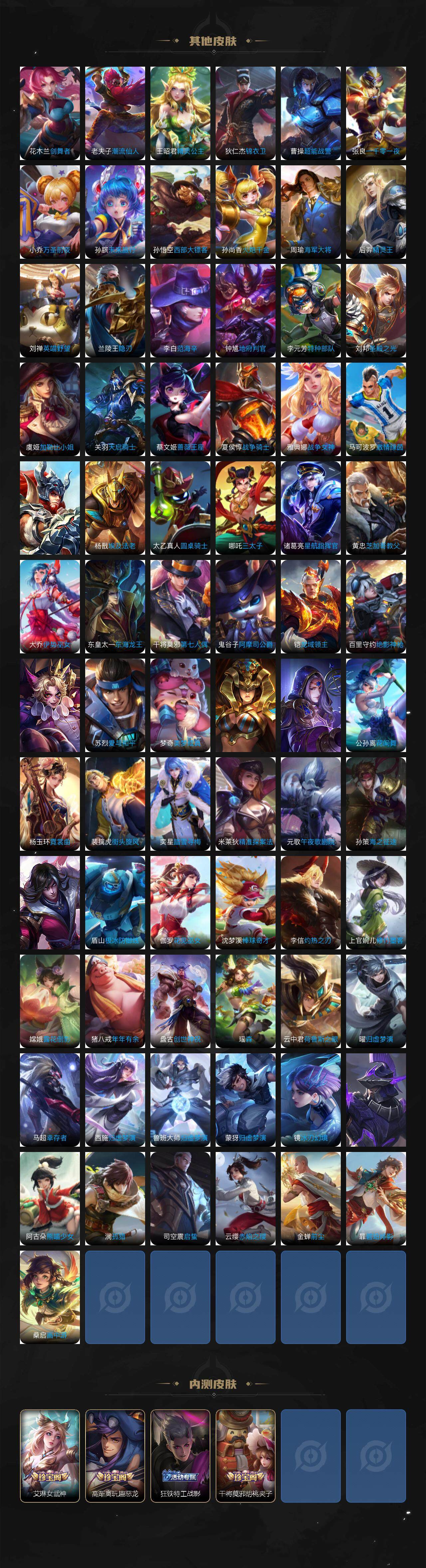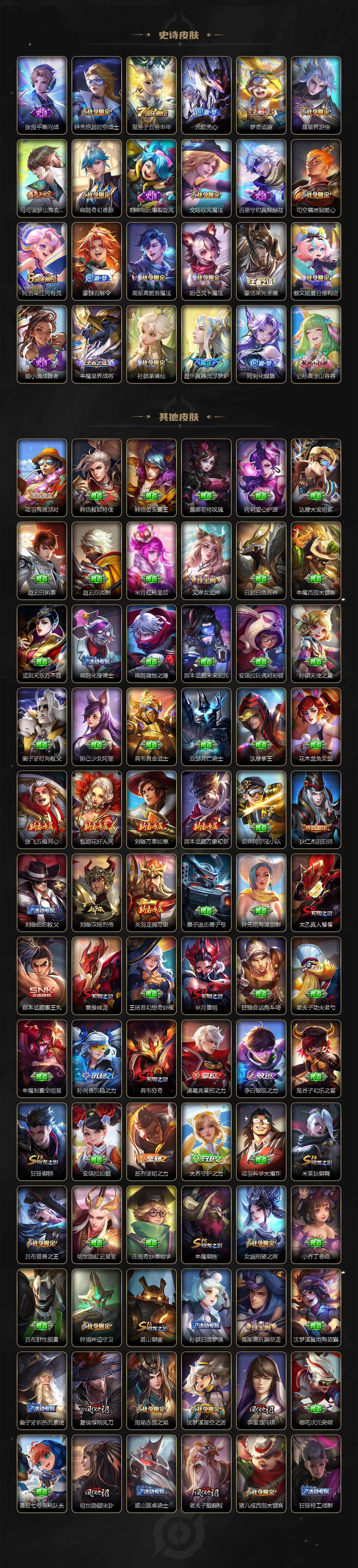 伽罗箭羽风息,李元芳逐浪之夏,不知火舞魅语,公孙离无限星赏官,大乔猫狗日记,孙策猫狗日记,阿轲节奏热浪,露娜紫霞仙子,诸葛亮黄金分割率,王昭君偶像歌手,韩信白龙吟,项羽苍穹之光,雅典娜冰冠公主,吕布末日机甲,鲁班七号电玩小子,橘右京修罗,墨子龙骑士,嬴政摇滚巨星,刘禅绅士熊喵,刘禅天才门将,白起星夜王子,安琪拉心灵骇客,程咬金功夫厨神,刘邦德古拉伯爵,兰陵王暗隐猎兽者,曹操幽灵船长,宫本武藏鬼剑武藏,亚瑟心灵战警,钟馗乐园奇幻夜,蔡文姬舞动绿茵,廉颇地狱岩魂,小乔缤纷独角兽,夏侯惇乘风破浪,花木兰水晶猎龙者,铠曙光守护者,墨子金属风暴,百里玄策原初追逐者,吕布圣诞狂欢,貂蝉圣诞恋歌,百里守约特工魅影,嬴政暗夜贵公子,嫦娥拒霜思,雅典娜黎明之约,李白千年之狐,澜赏金猎手,张良千筹问战,刘禅电玩·爆裂旋风,百里守约真我赫兹,蒙犽百解令,高渐离燃音魔法,赵怀真器灵·浮梦炉